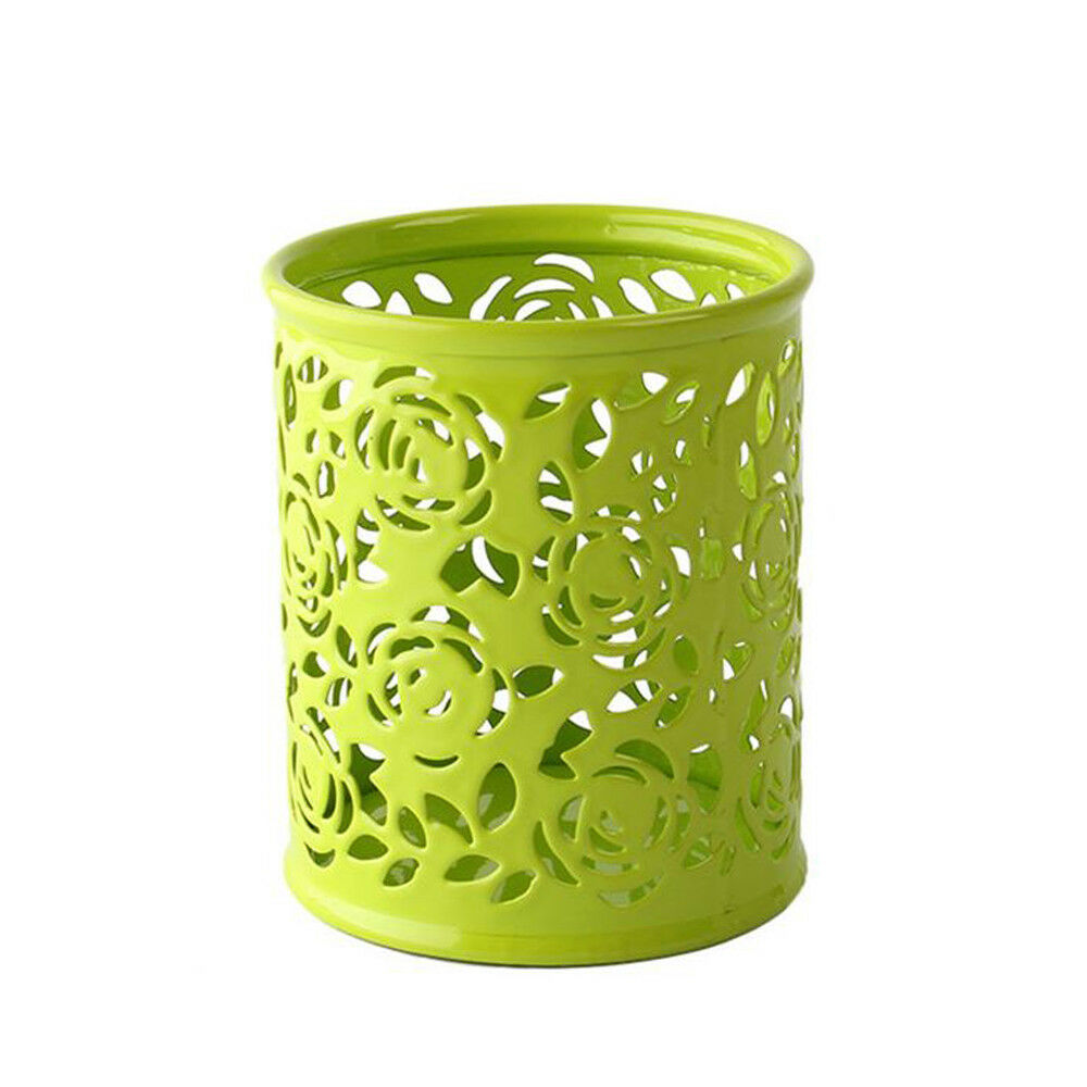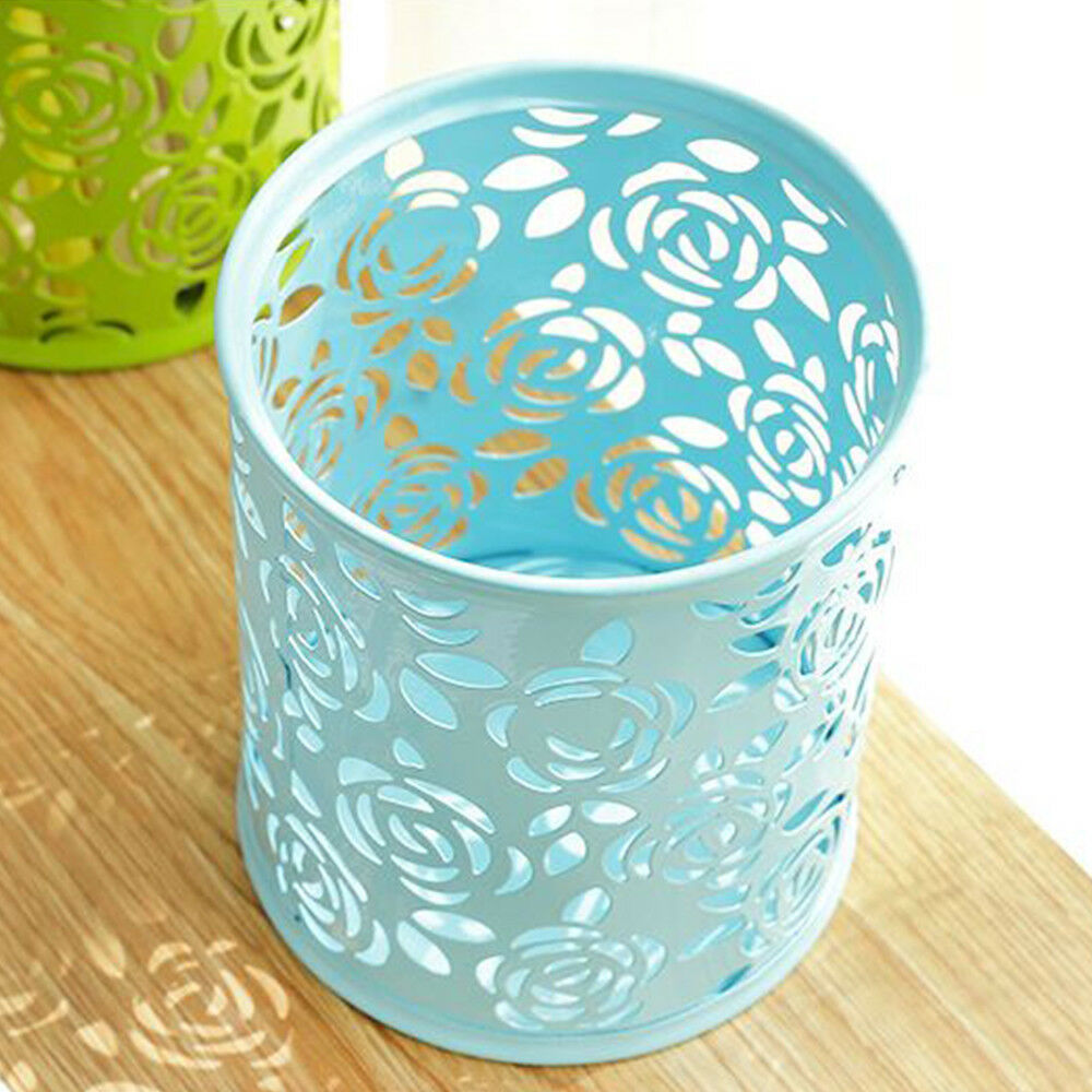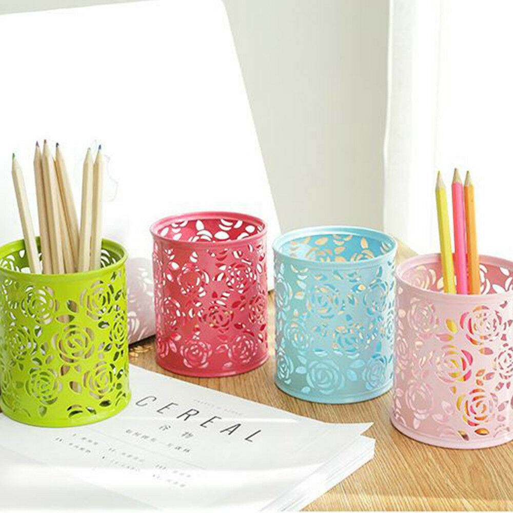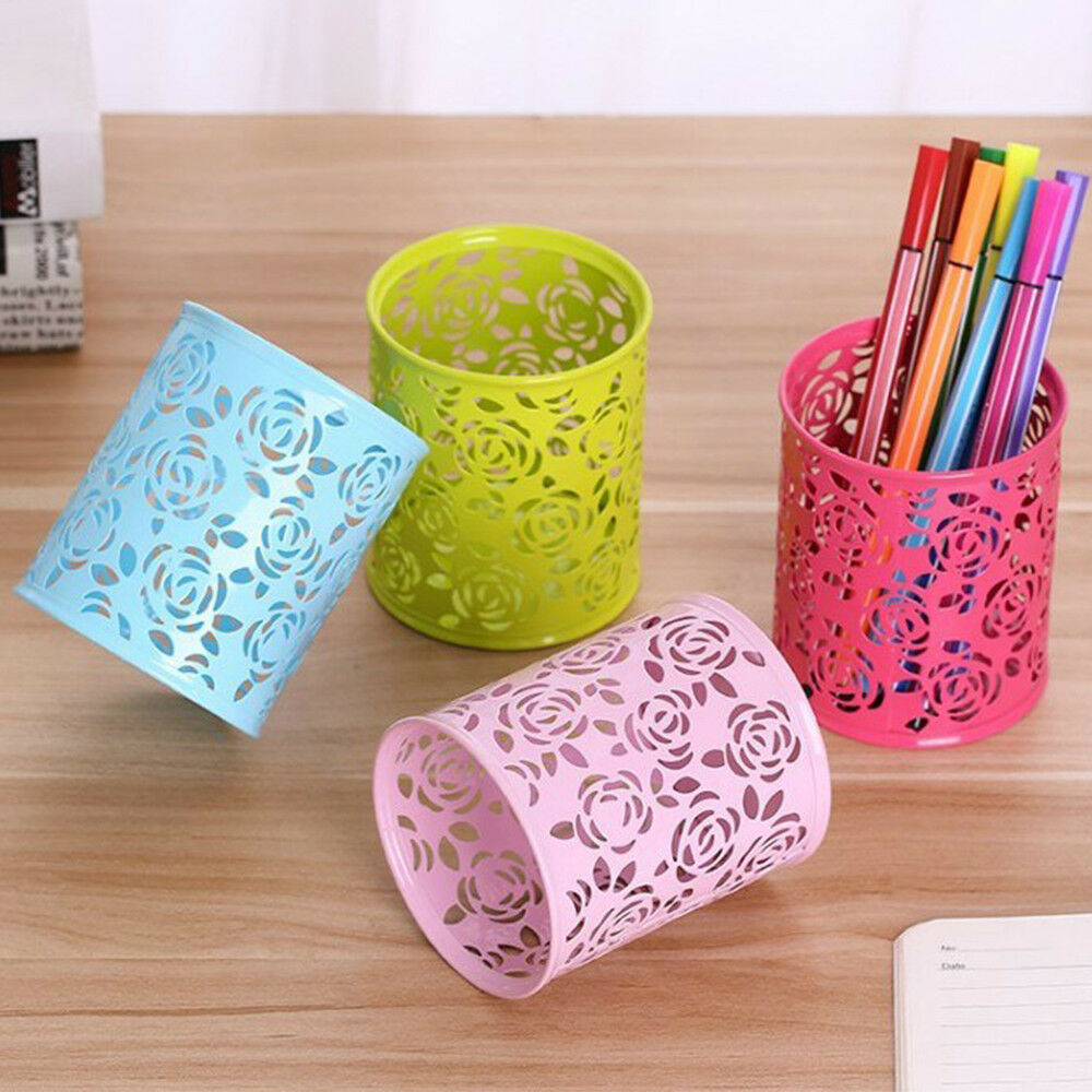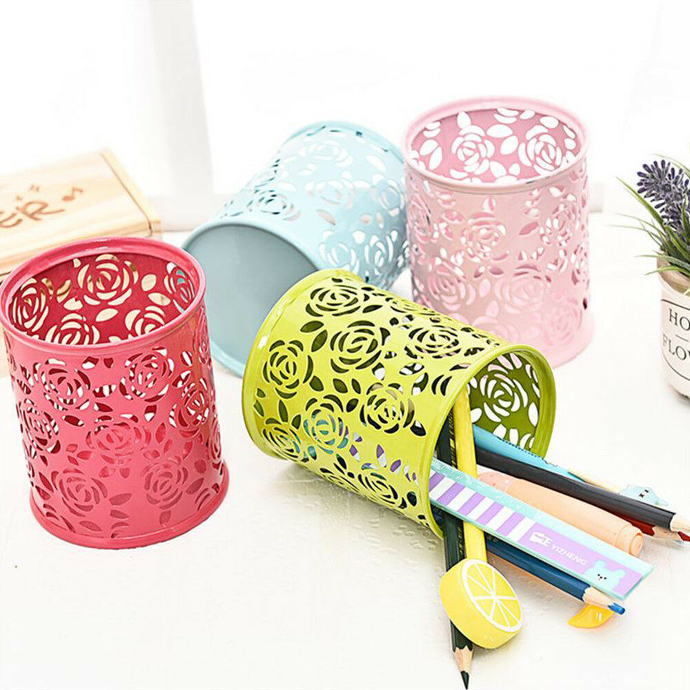 Hollow Rose Flower Cosmetic Metal Pen Pencil Pot Holder Stationery Organizer