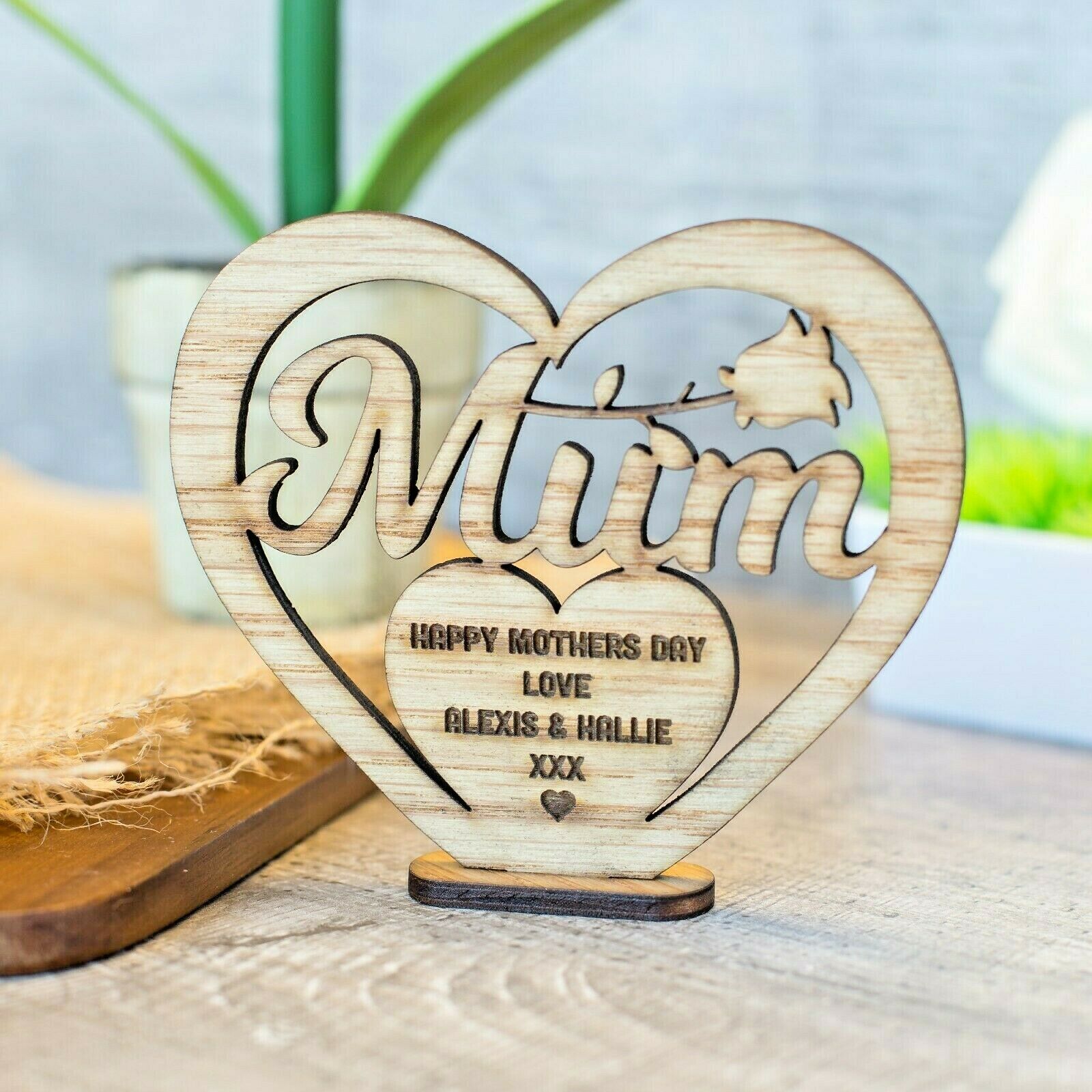 Personalised Mothers Day Gift for Mum Wooden Heart Plaque Freestanding Oak Gift