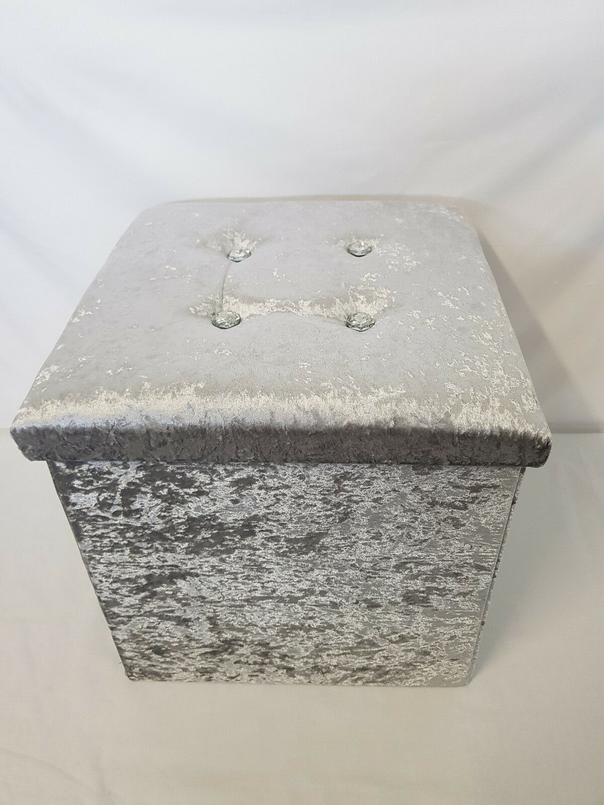 Crushed Velvet Toy Diamante Ottoman Folding Storage Pouffe Box Stool Seat Silver