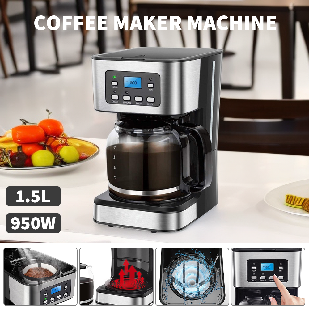 1.5L Filter Coffee Maker Machine + Glass Carafe Instant Anti-Drip 12 Cups 950W