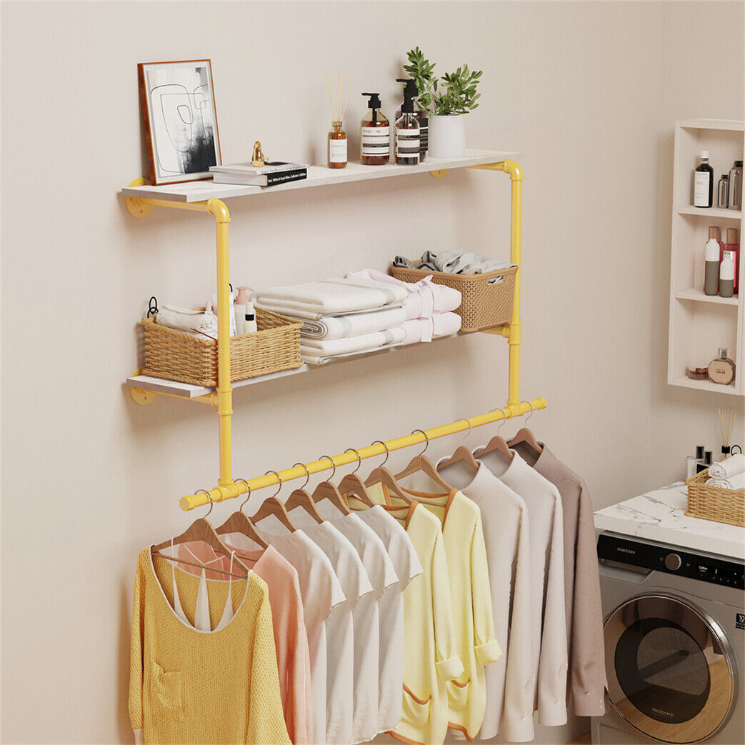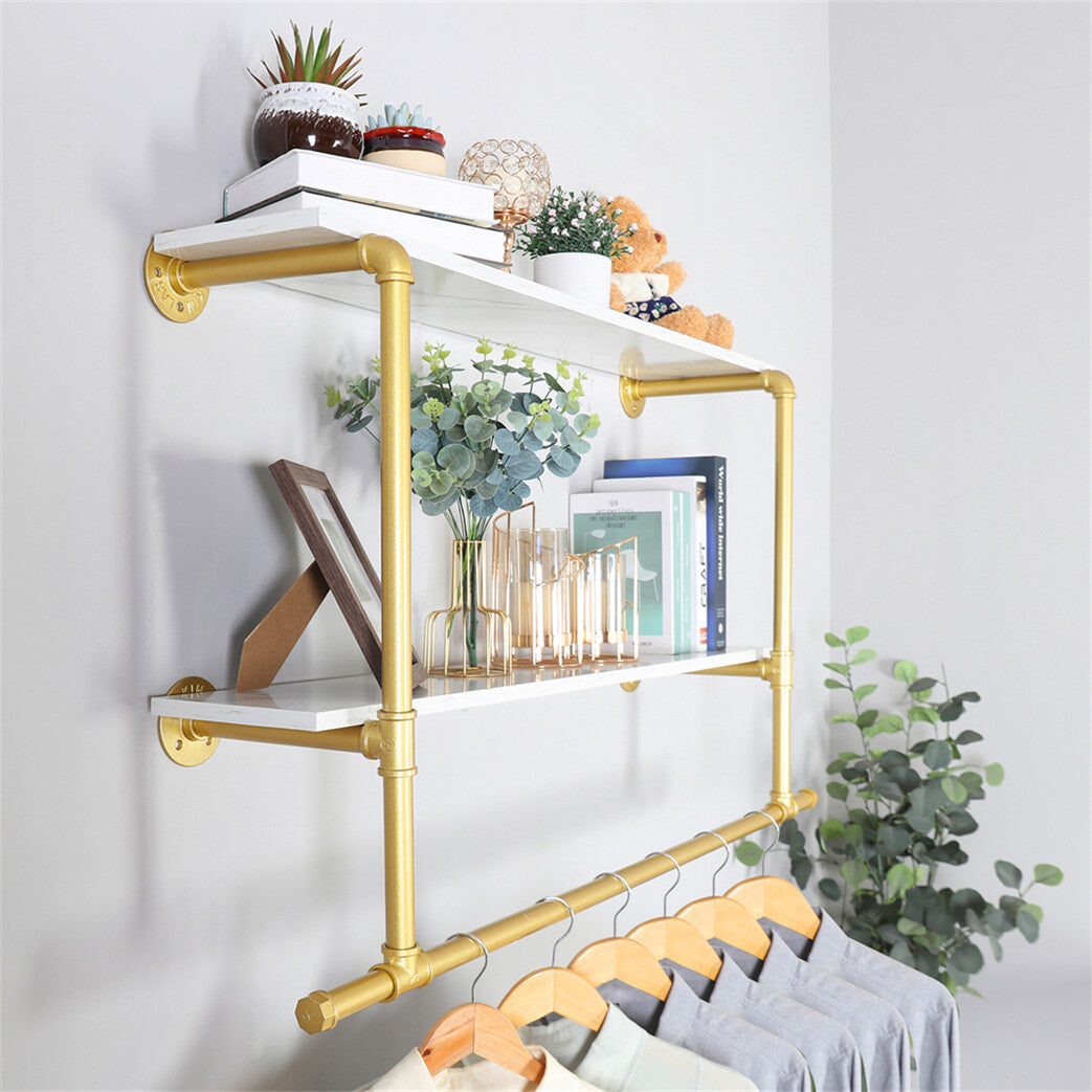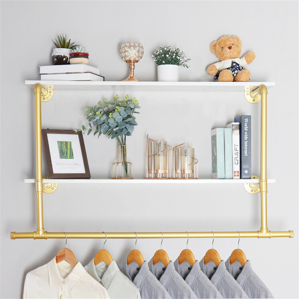 116cm Gold Metal Clothes Bar Rack Pipe Wall Garment Hanging Storage Rail Shelves