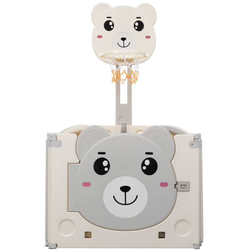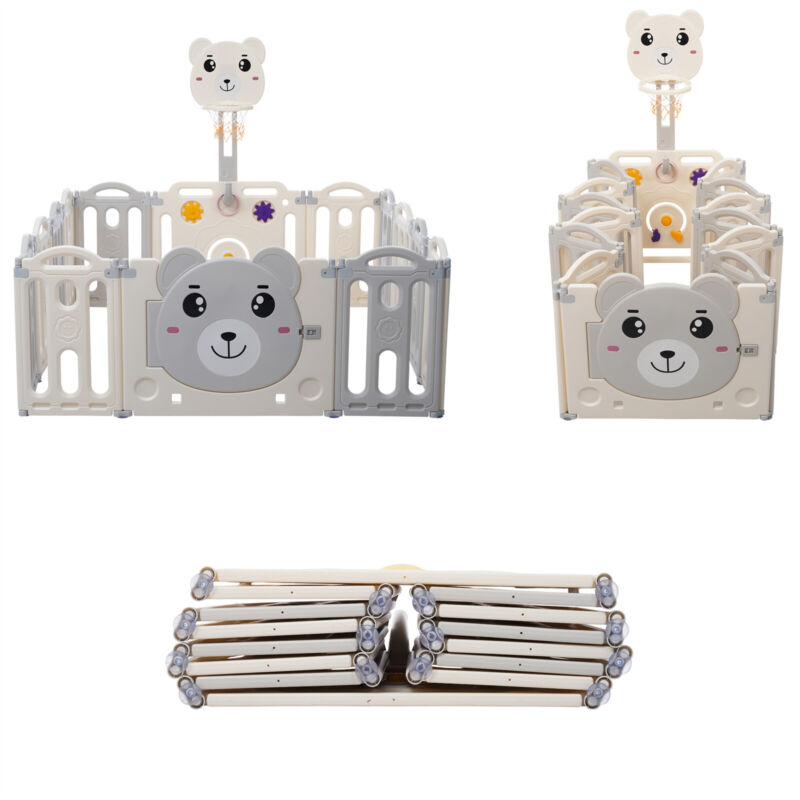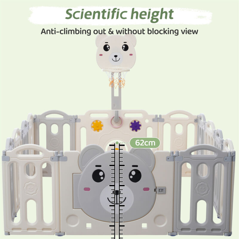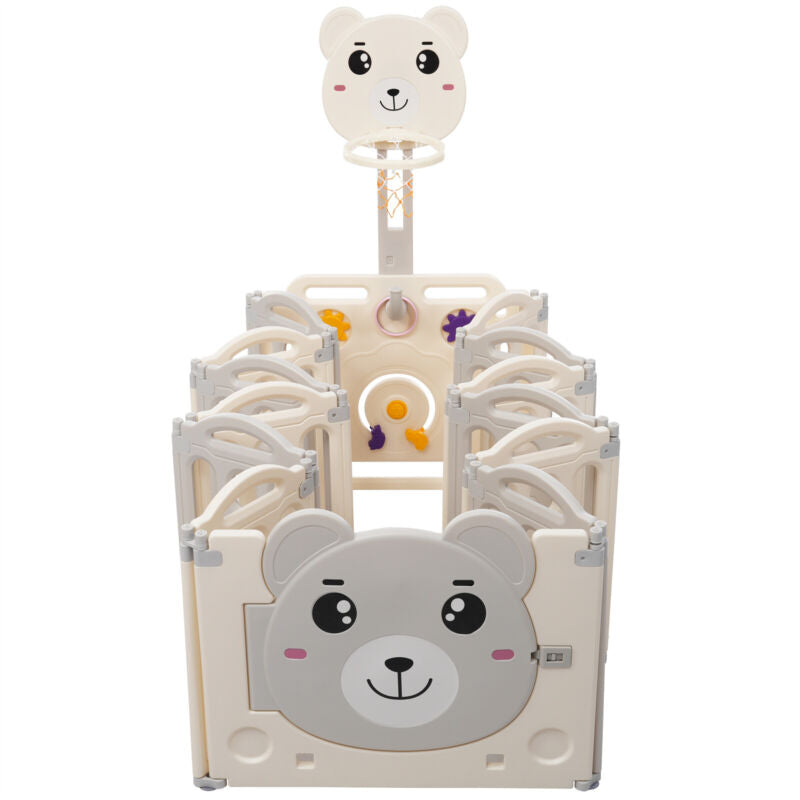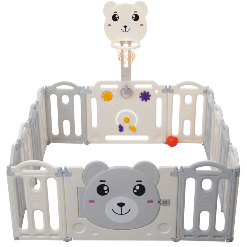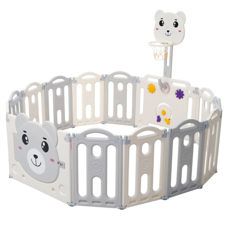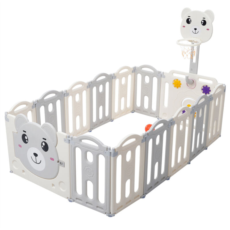 12+2 Panels Baby Playpen Foldable Kids Safety Activity Center & Basketball Hoop