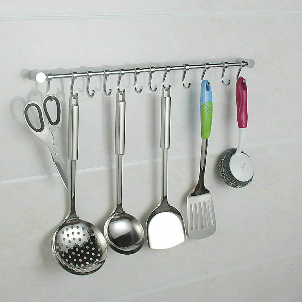 12 Hooks Stainless Steel Kitchen Utensil Wall Hanging Rail Rack Bathroom Holder
