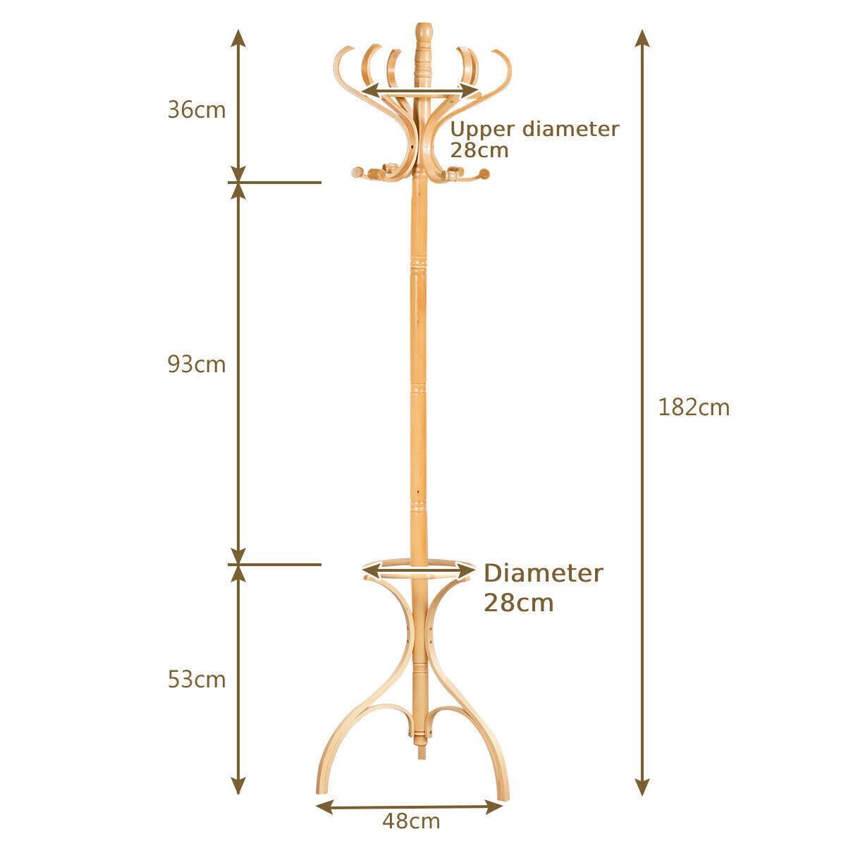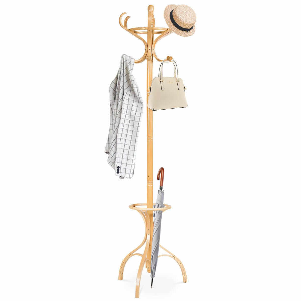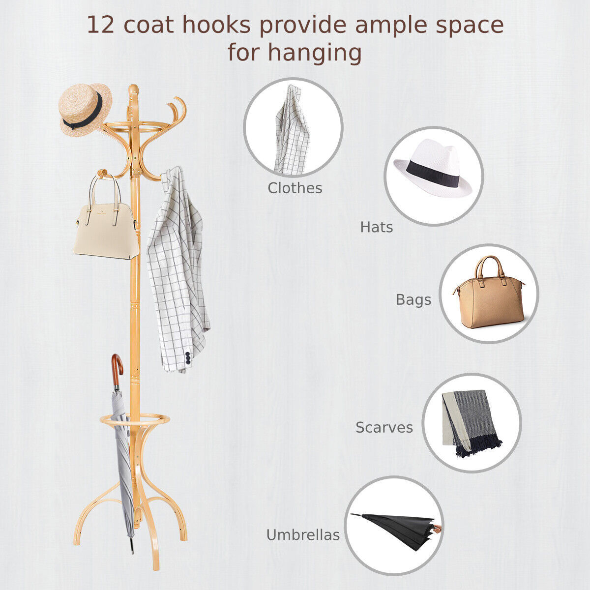 12 Hooks Wooden Coat Stand Coat/Hat/Jacket/Umbrella Standing Rack Hanger-Beige