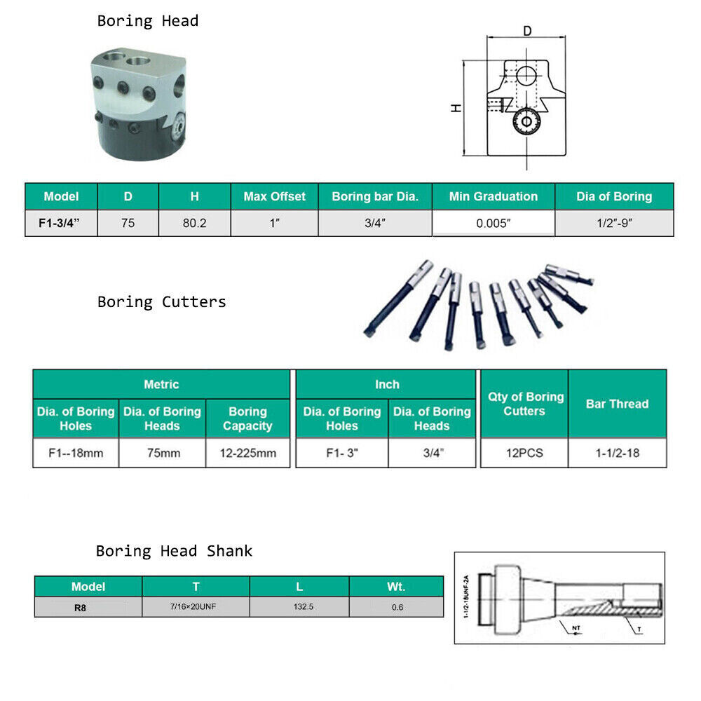 12 Pcs F1 75mm Boring Head Shank NT40 3/4" Carbide Boring Bar Set Milling Set