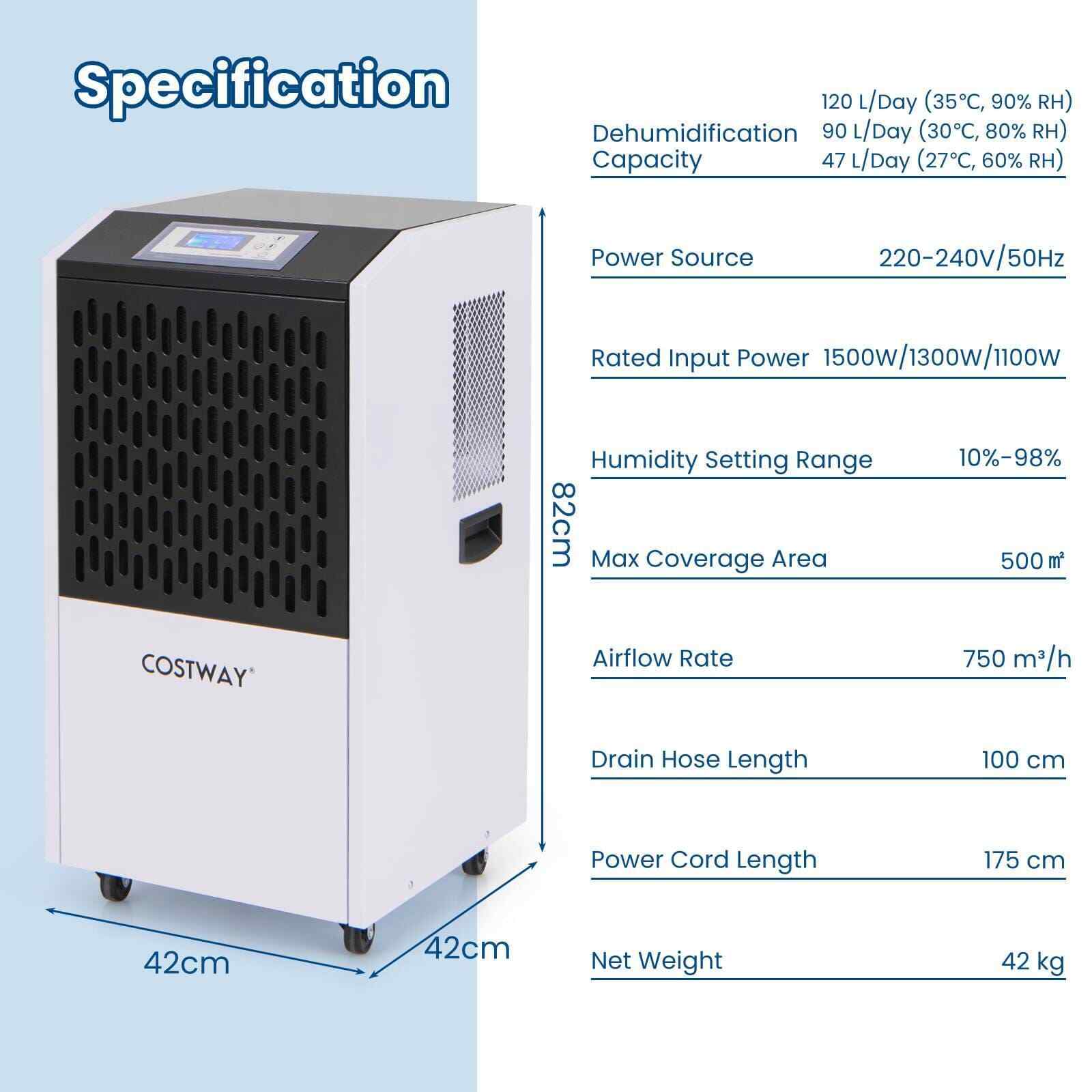 120 L Commercial Dehumidifier w/ Drain Hose Large Spaces up to 500㎡