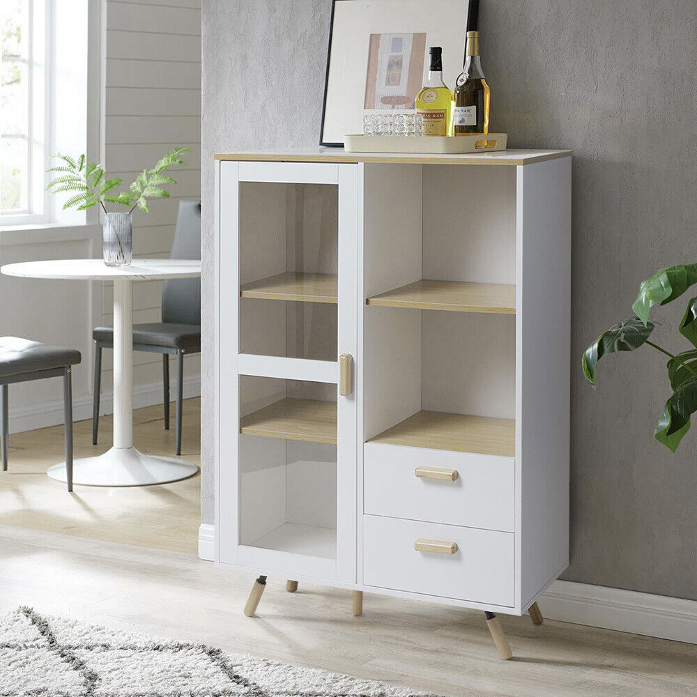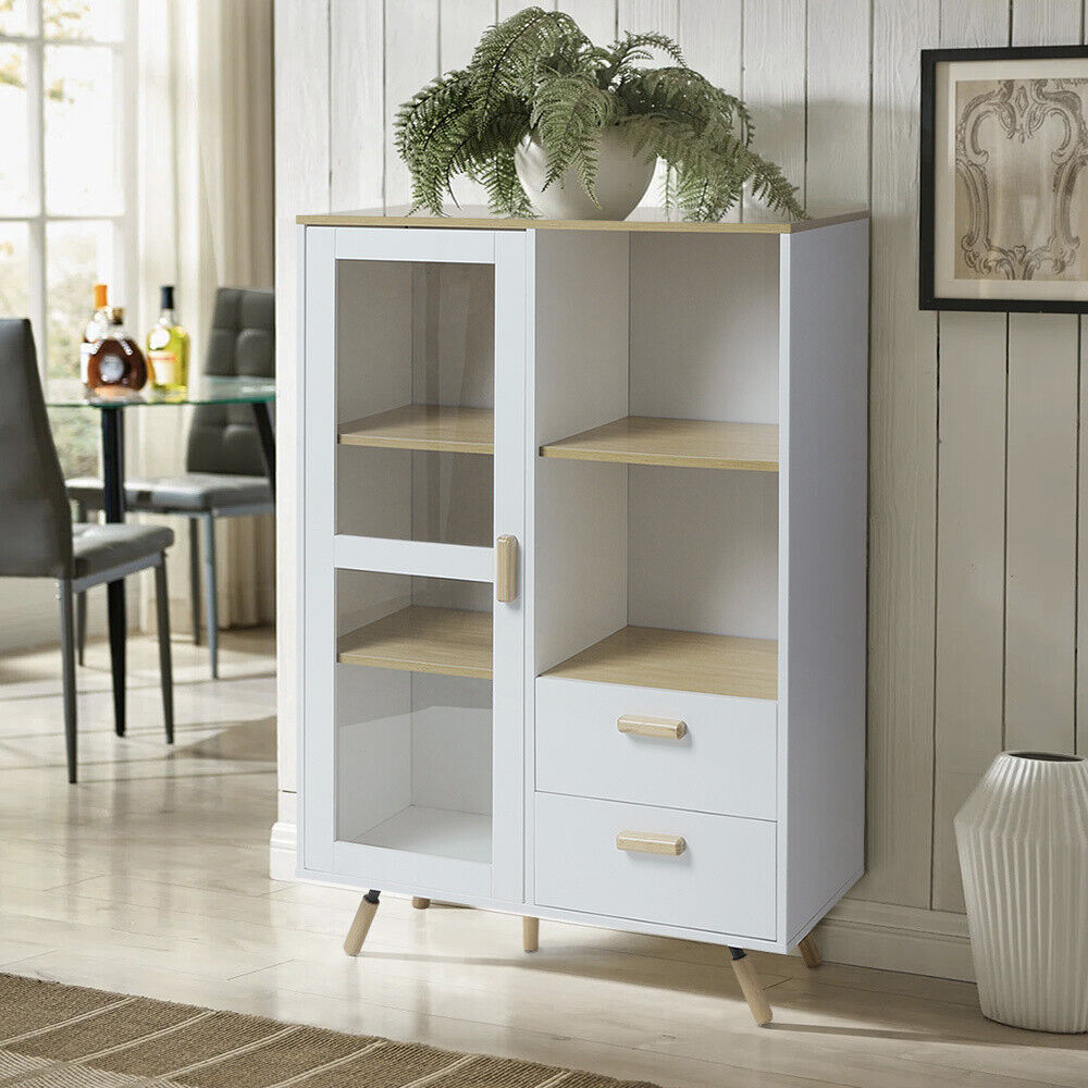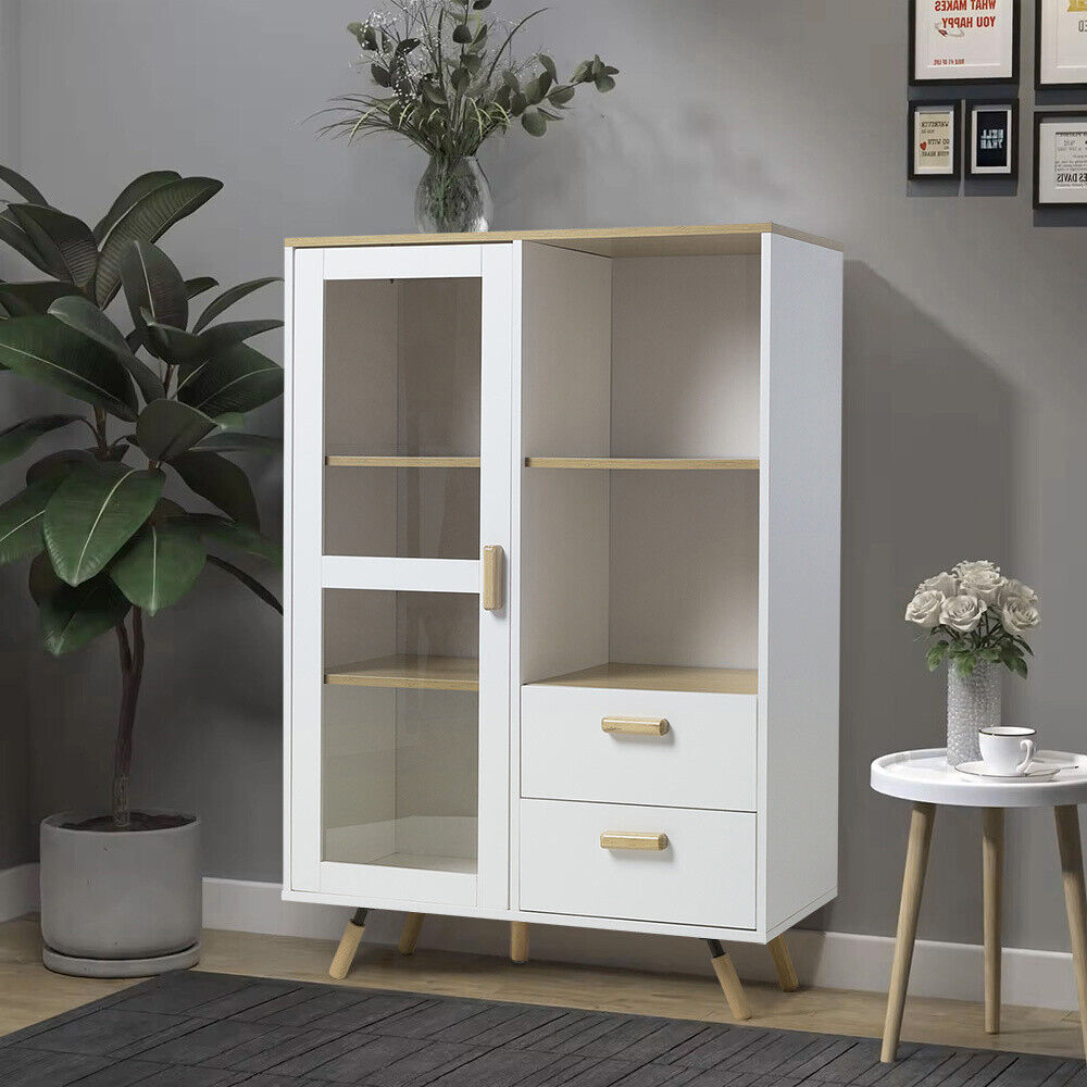 120cm Highboard Side Cabinet Cupboard Storage Wooden Side Cabinet w/Glass Door