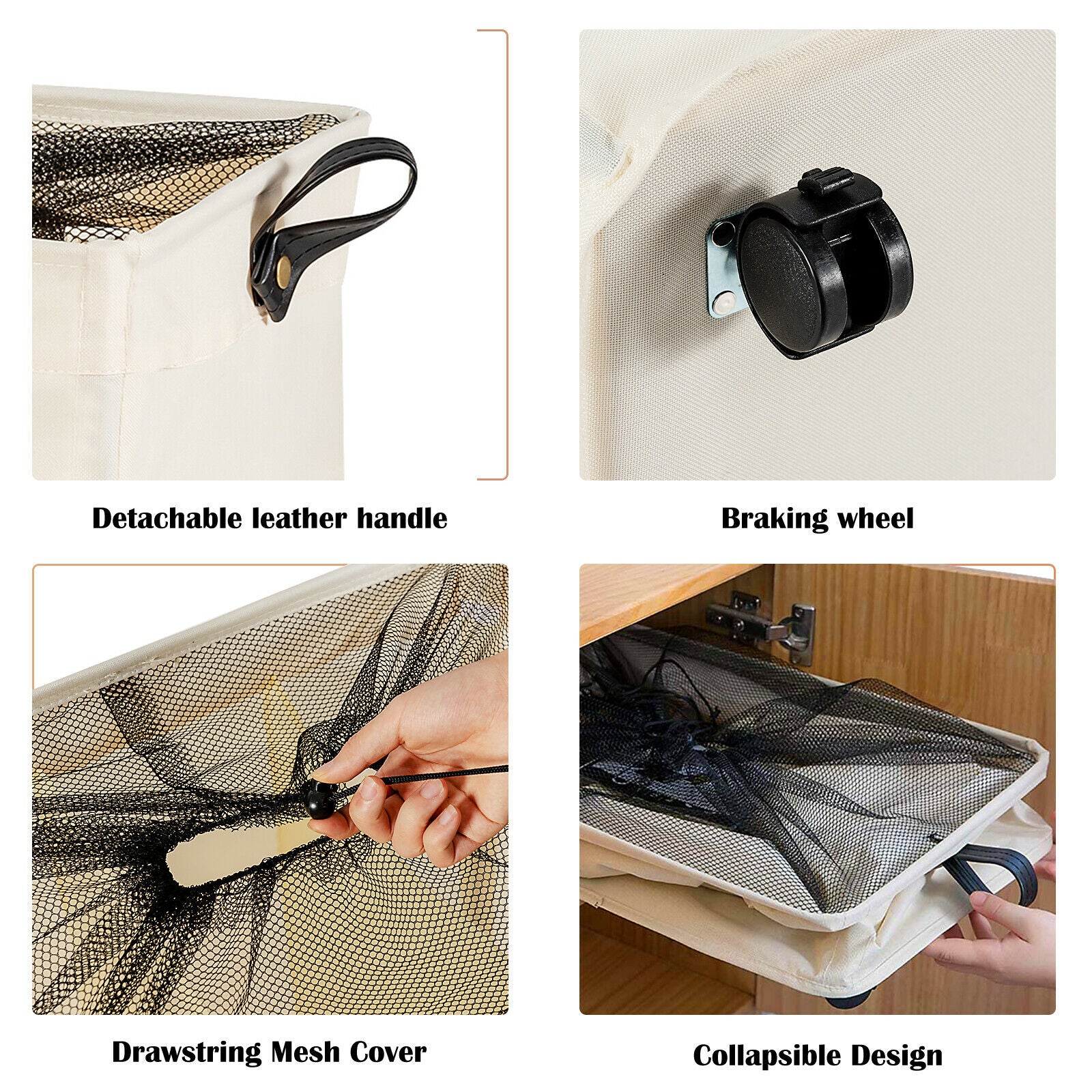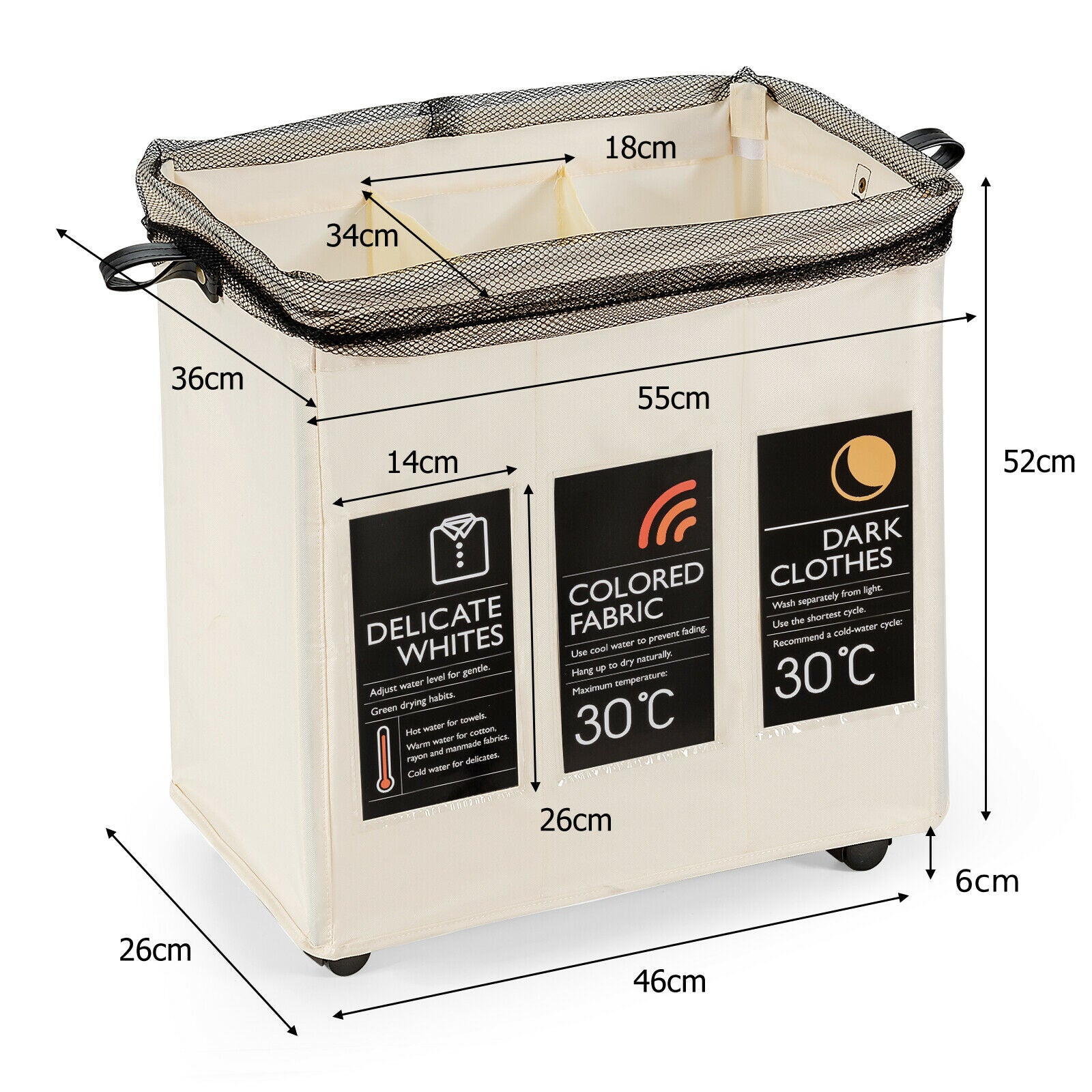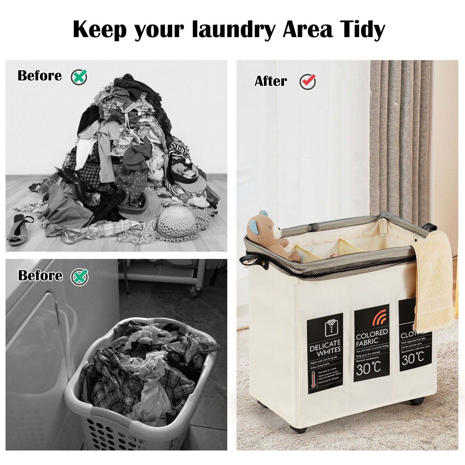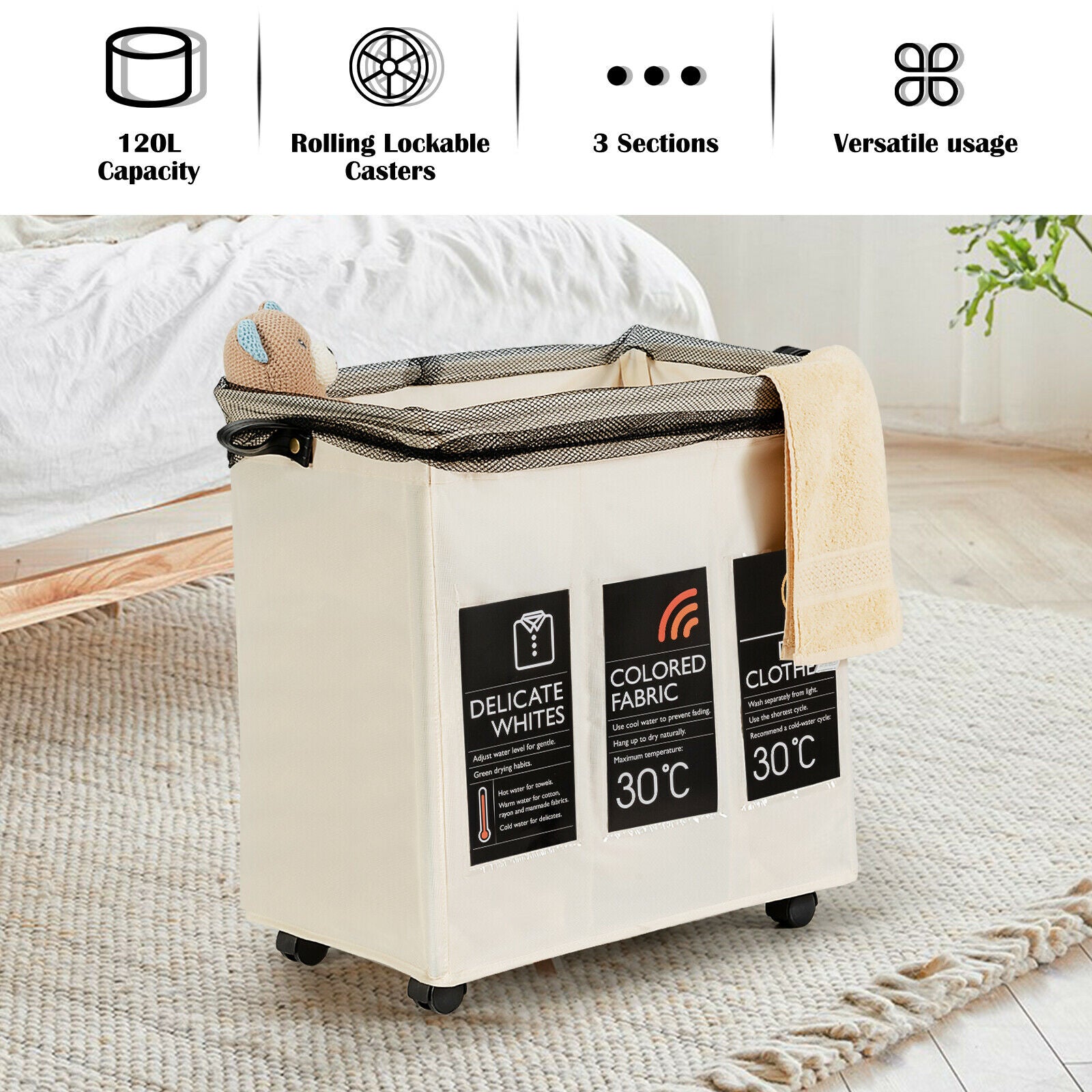 120L 3-Section Mobile Laundry Hamper Collapsible Water-Proof Laundry Sorter