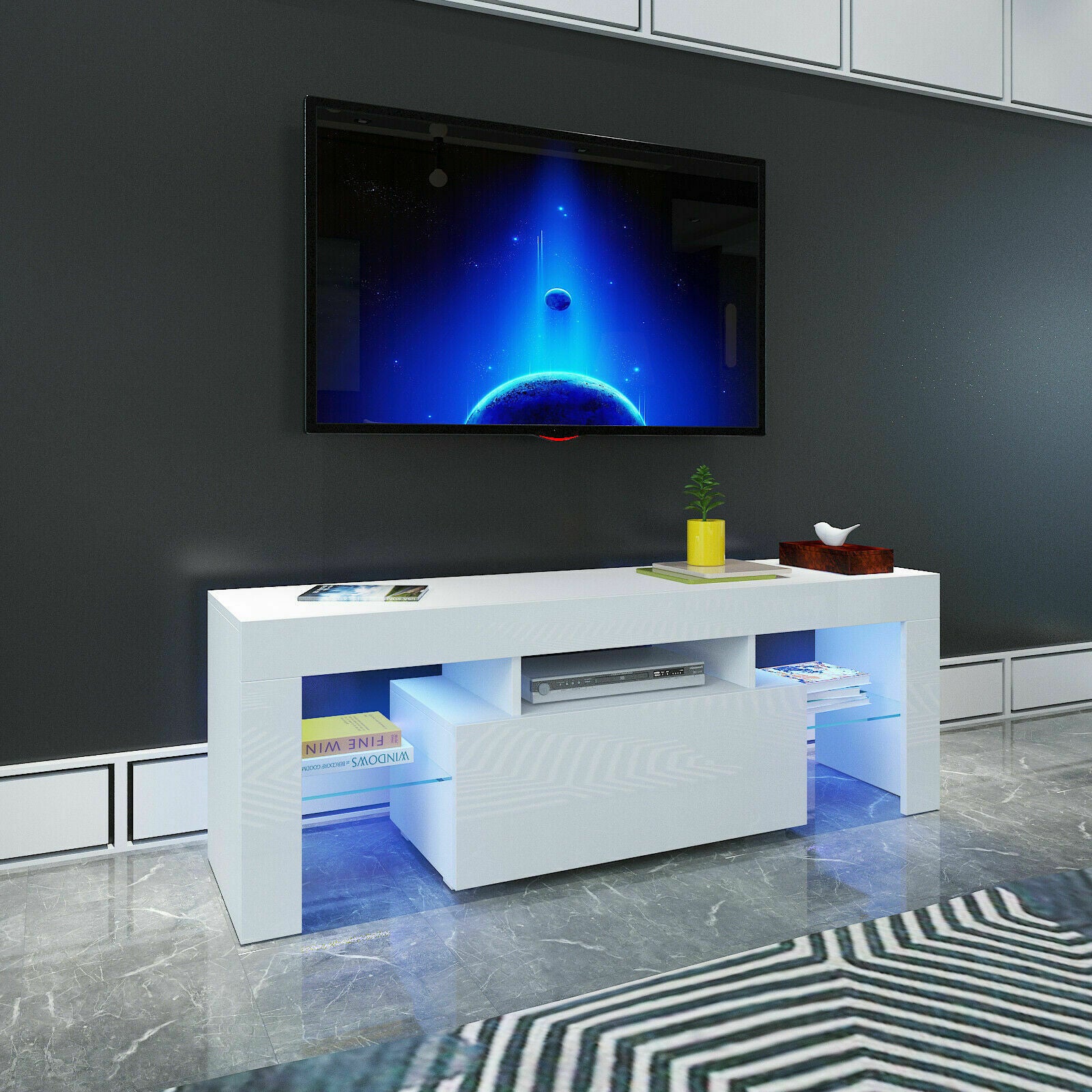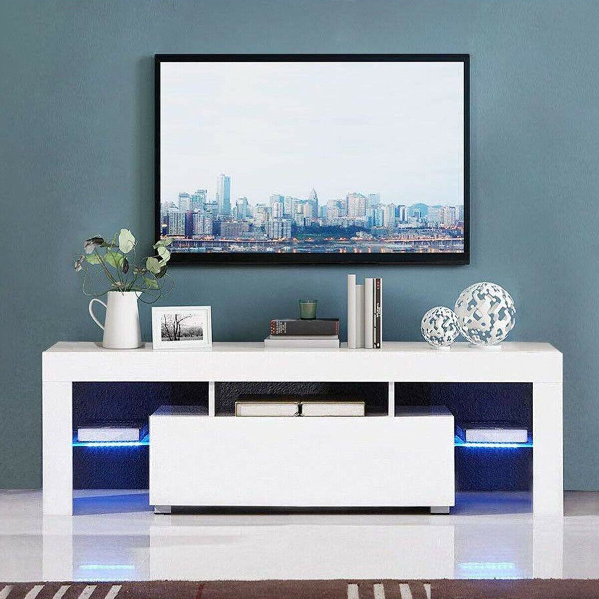 130cm Modern TV Unit Cabinet Stand High Gloss Door and Matt Body LED Light White