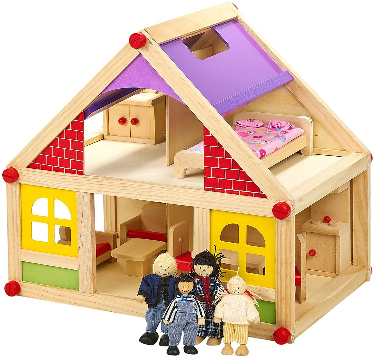 13pc Kids Girls Childrens Wooden Doll House toy with Furniture and Toy Figures