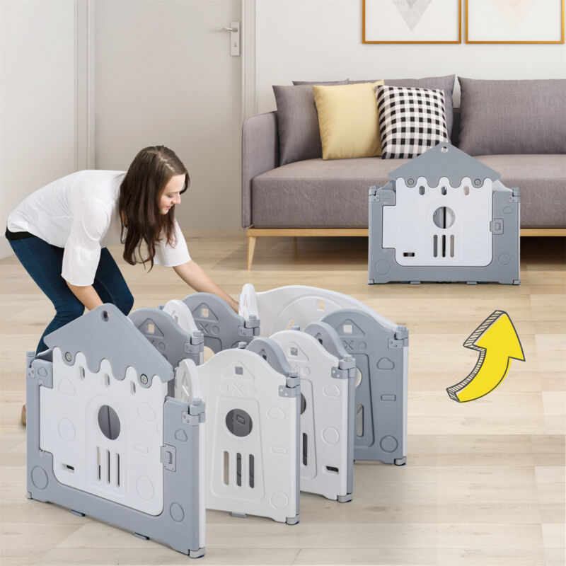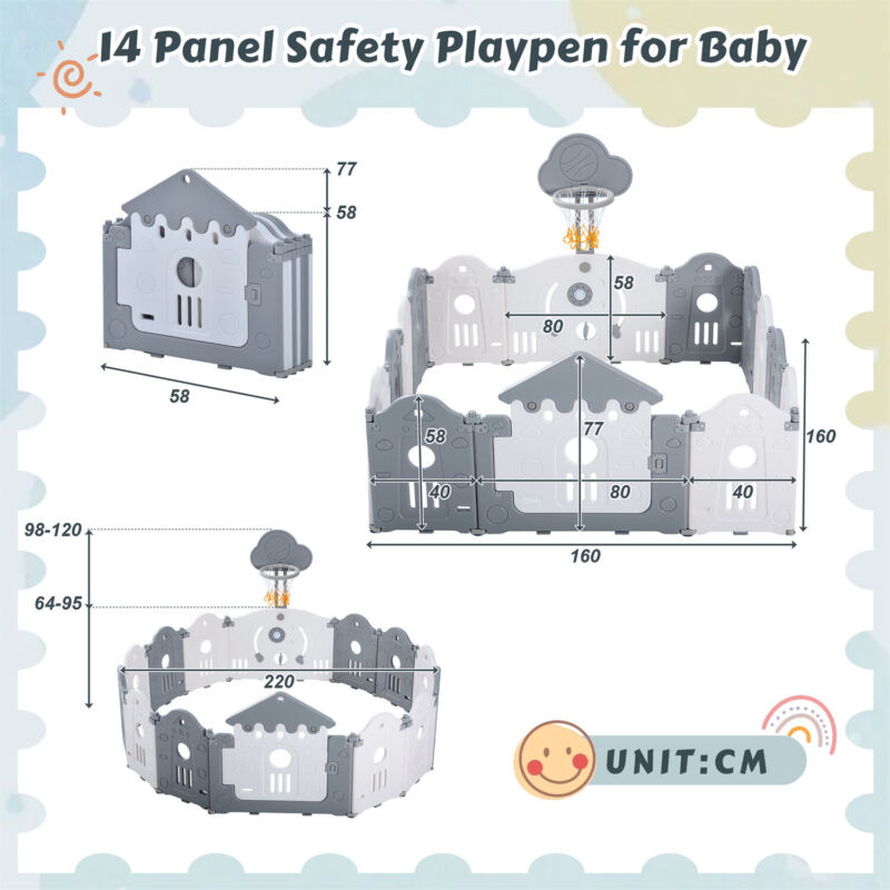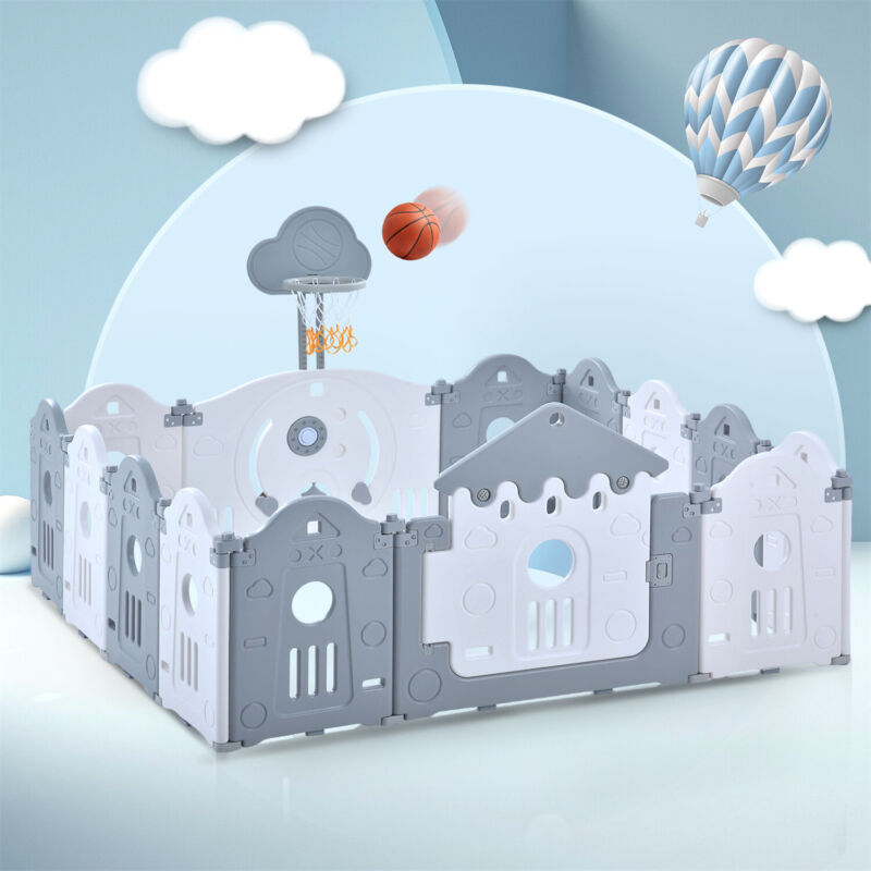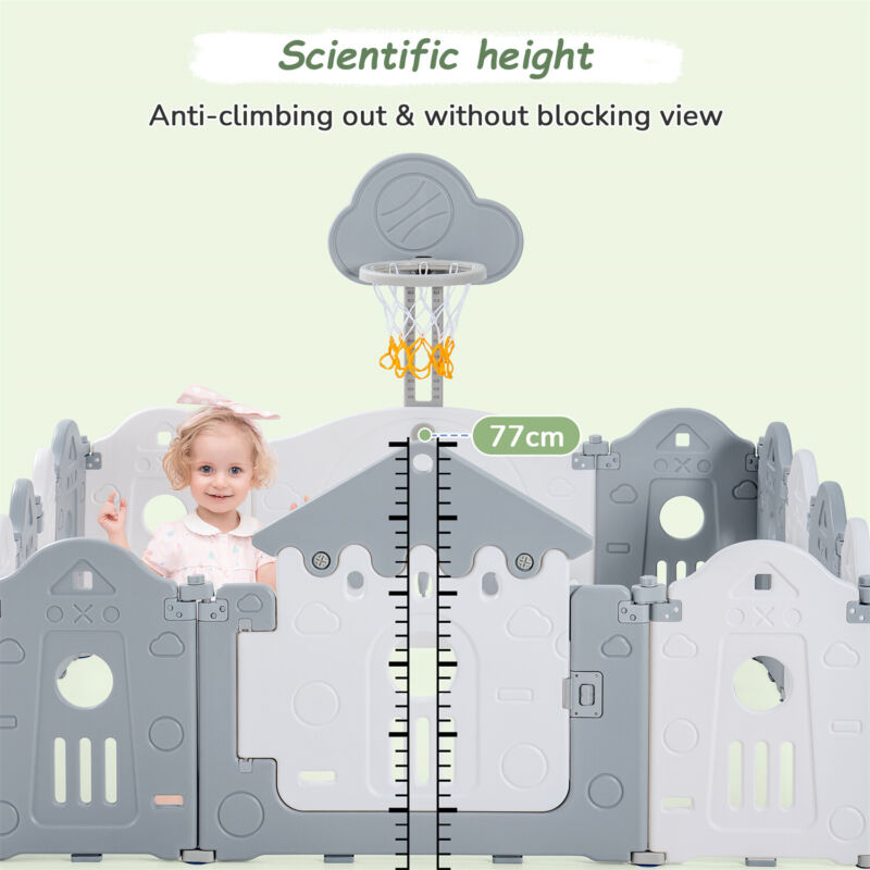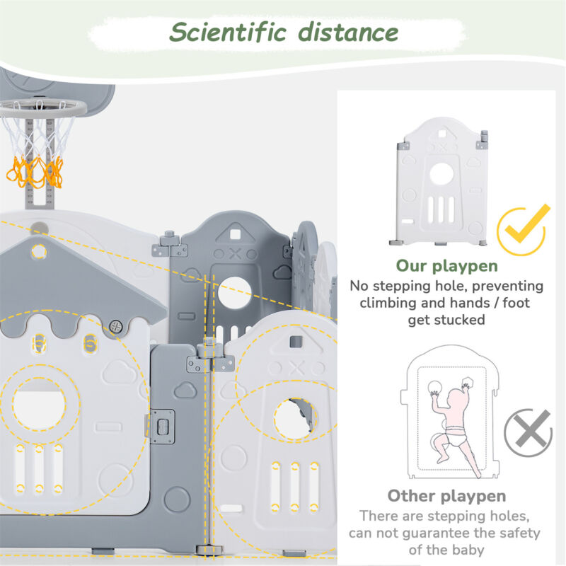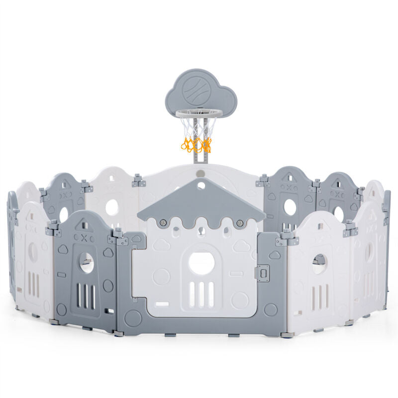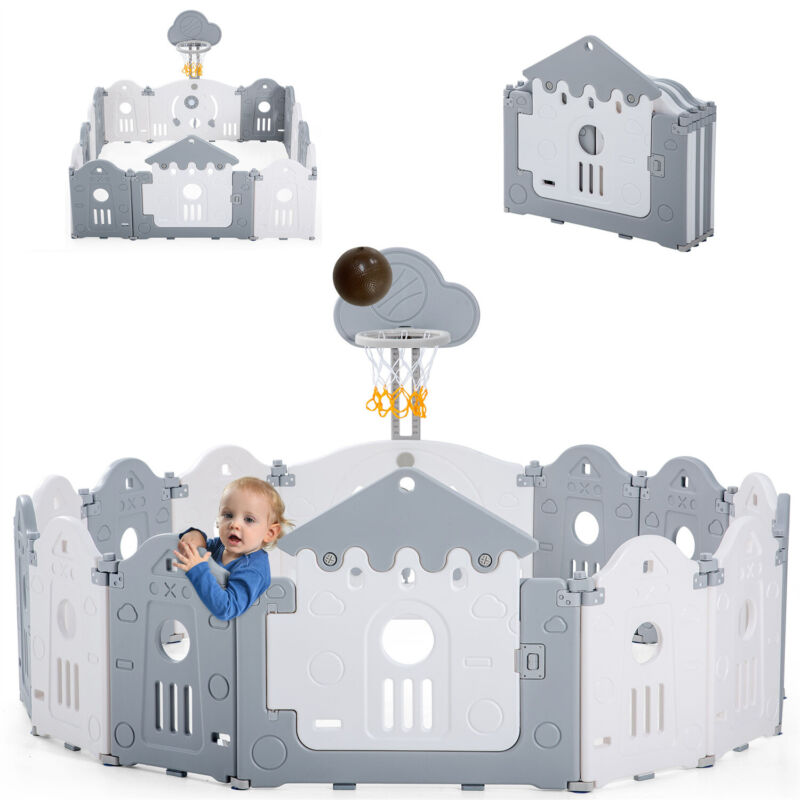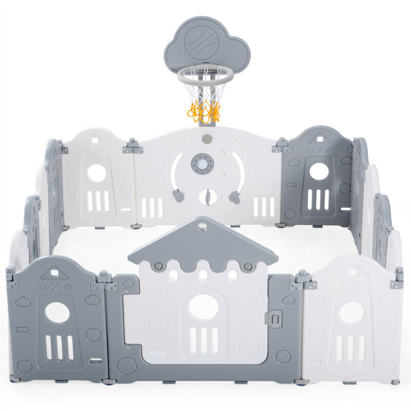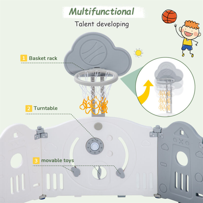 14 Panels Foldable Baby Playpen with Activity Panel and Basketball Hoop Grey