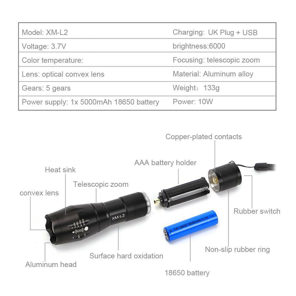 150000LM L2 LED Tactical Flashlight Torch USB Rechargeable Flashlight Hiking UK