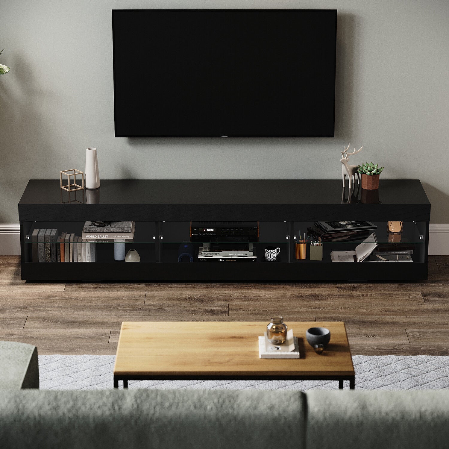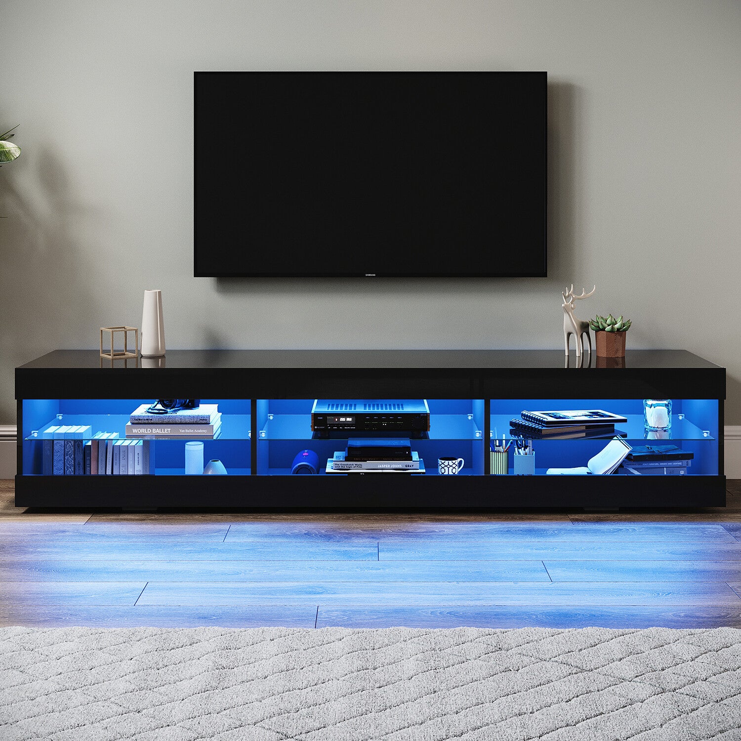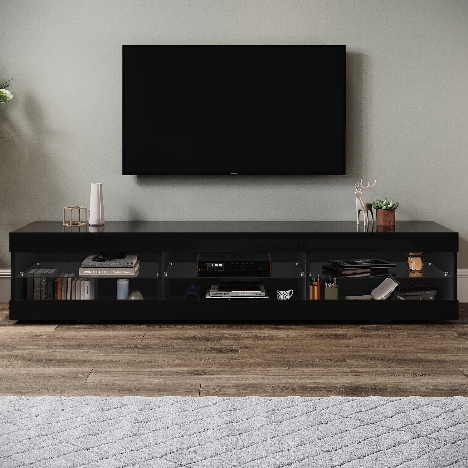 180cm Black LED High Gloss TV Stand Cabinet Unit Stroage Glass Shelves Sideboard