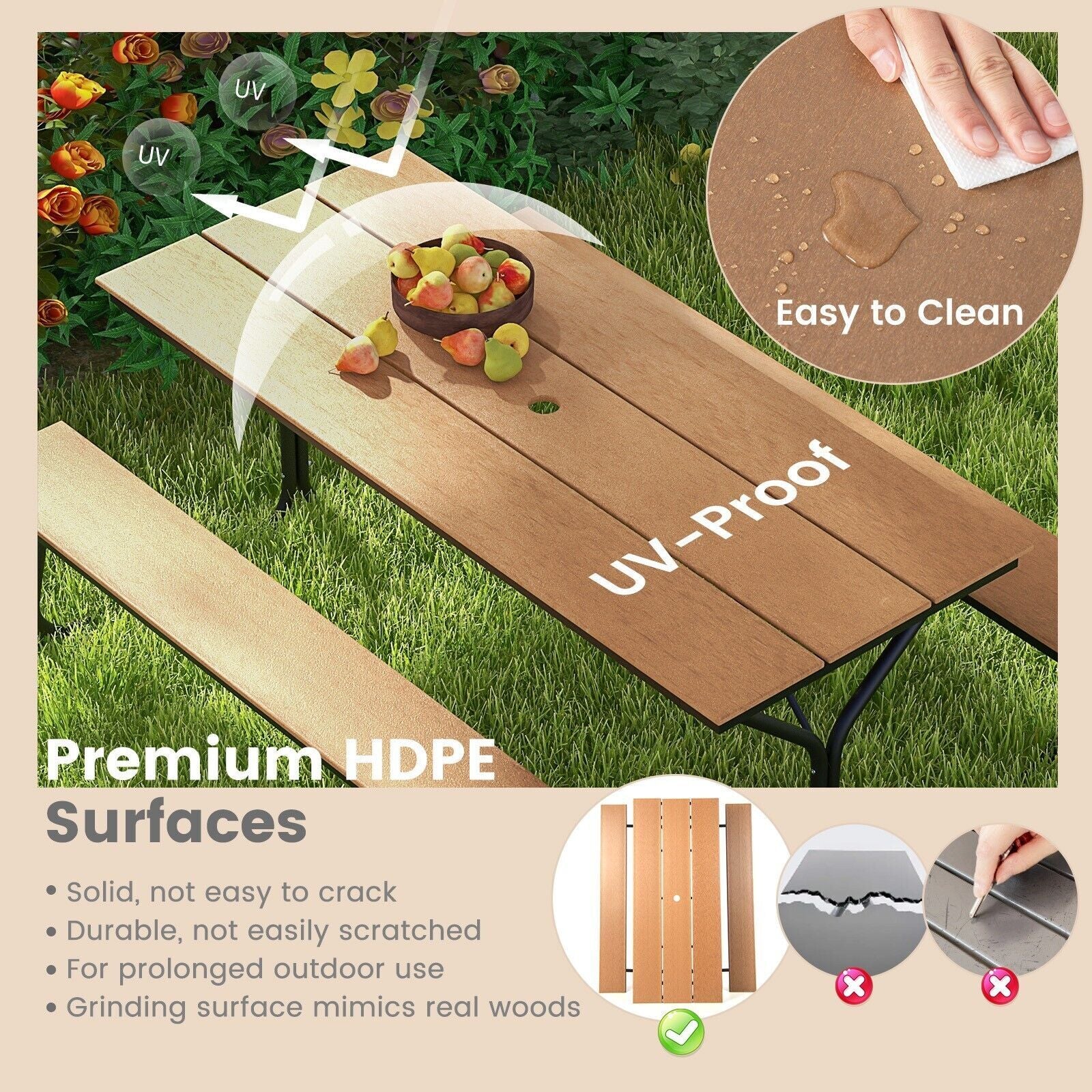 183CM Picnic Table Bench Set Outdoor Dining Table & 2 Benches Umbrella Hole