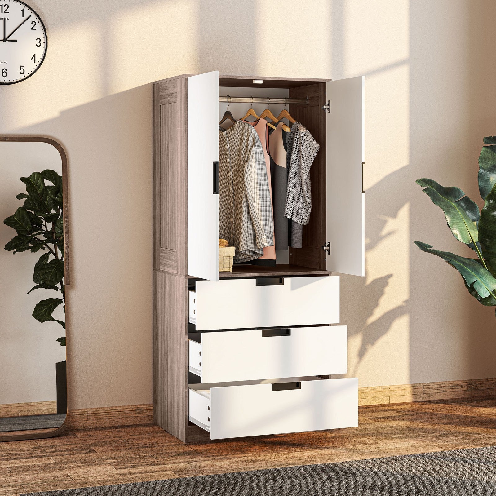 2 Door Wardrobe Modern Wardrobe with 3 Drawer and Hanging Rod for Bedroom Brown
