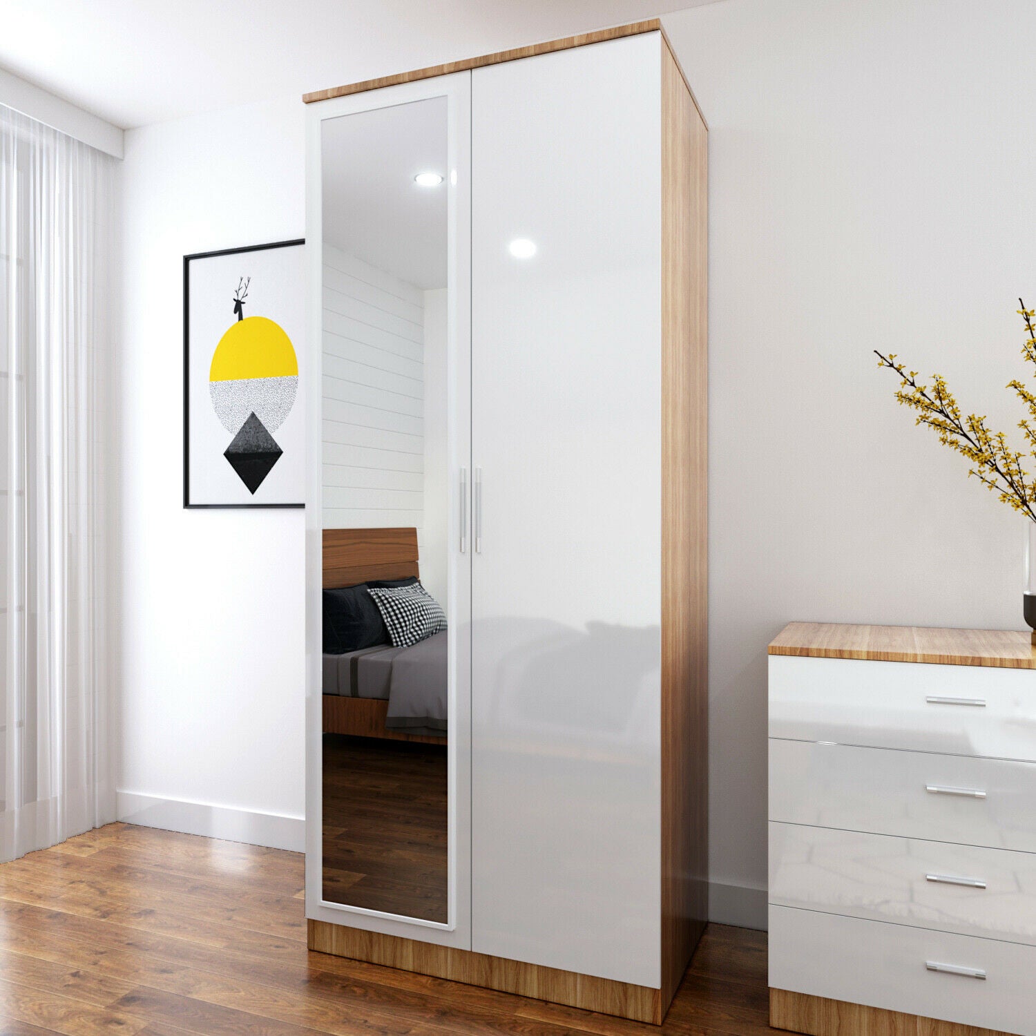 2 Doors Wardrobe White High Gloss Storage Hanging Rail Furniture with Mirror