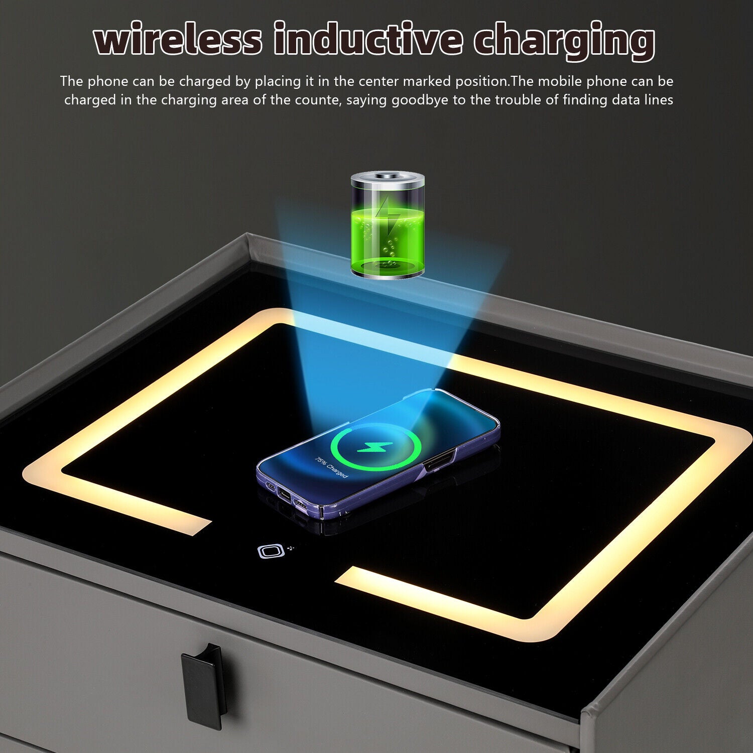 2 Drawers LED Bedside Table Wireless Charging Nightstand Bedside Cabinet Modern