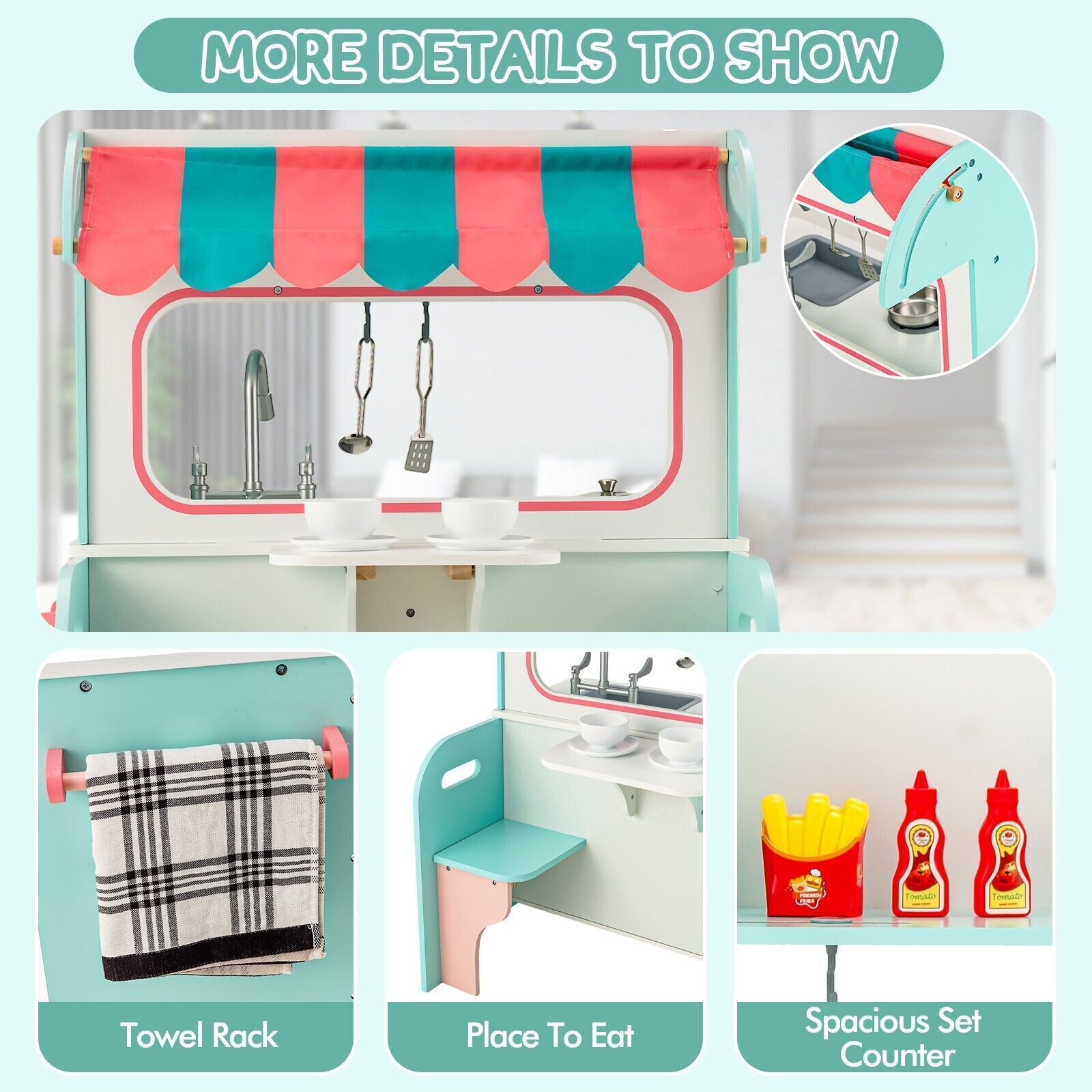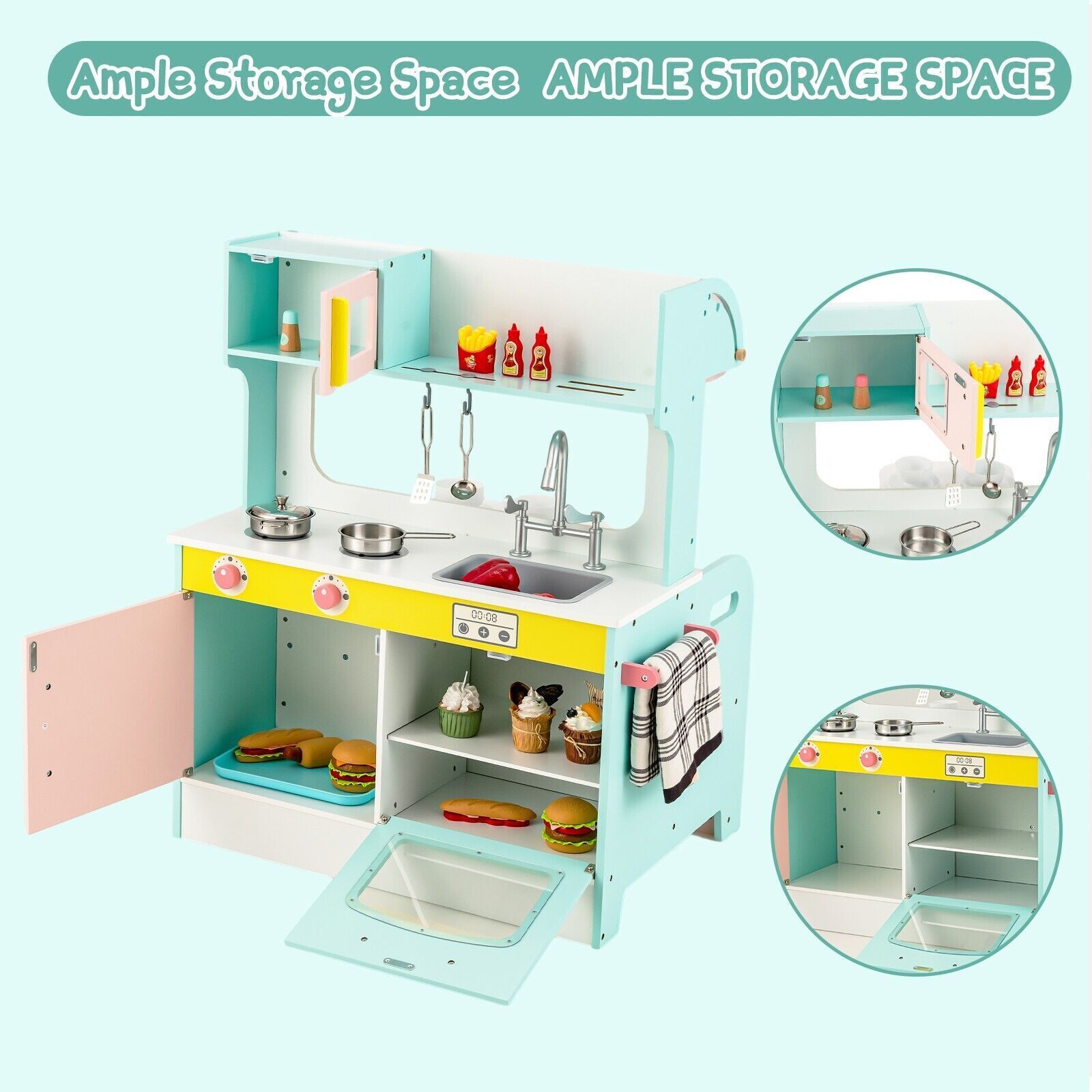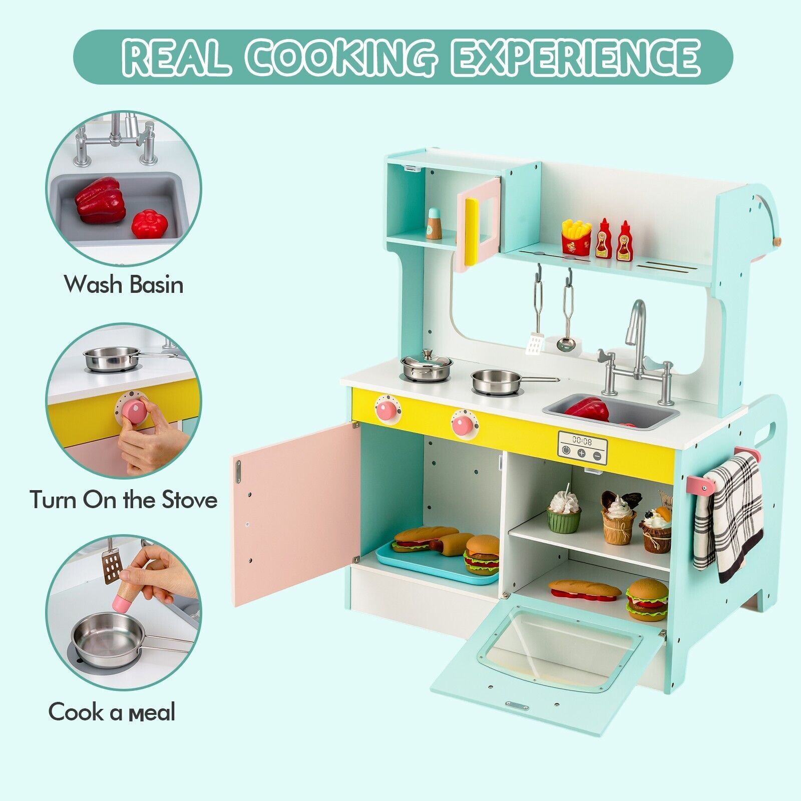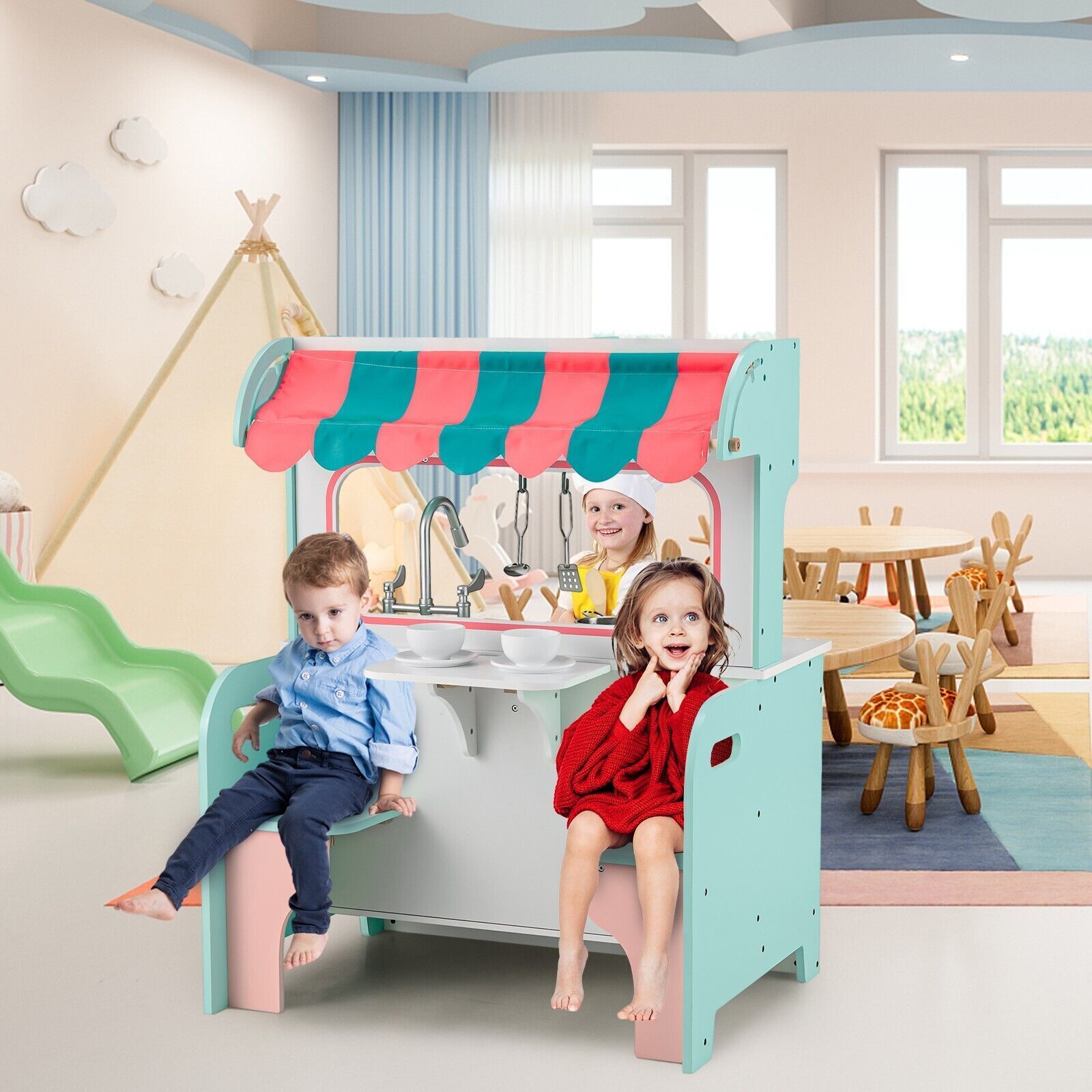 2-in-1 Kids Play Kitchen & Restaurant Wooden Pretend Double-sided Cooking Toy