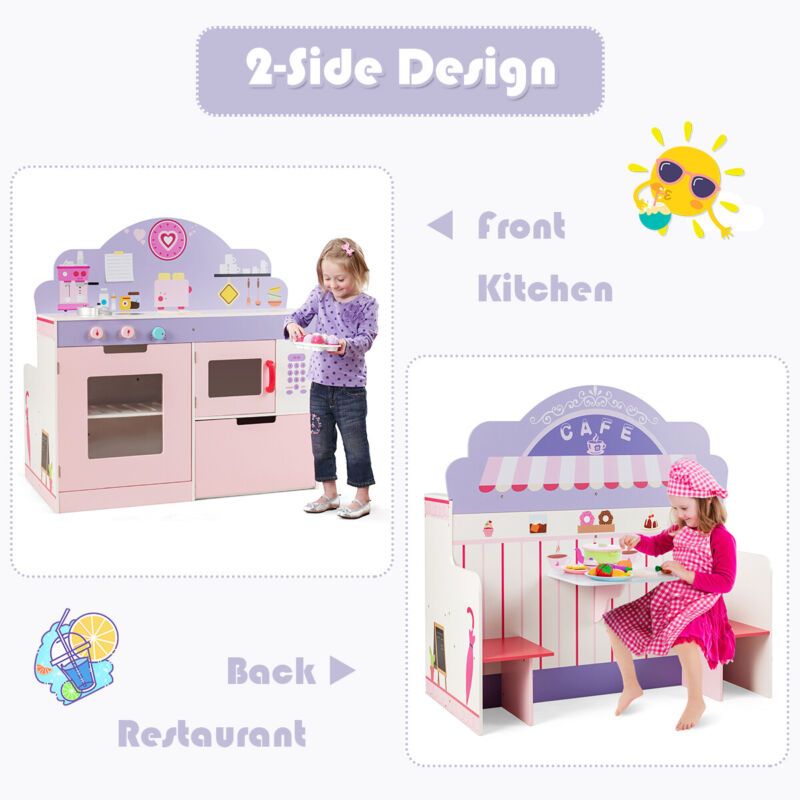 2-In-1 Kids Play Kitchen Wooden Cooking Role Play Toy Set with Table and Chairs