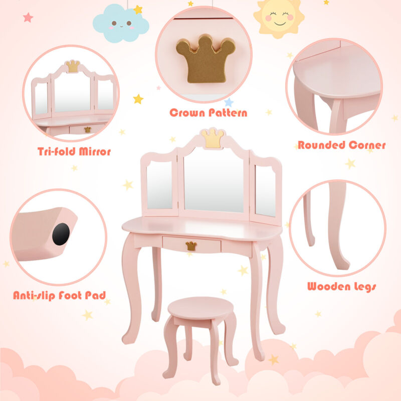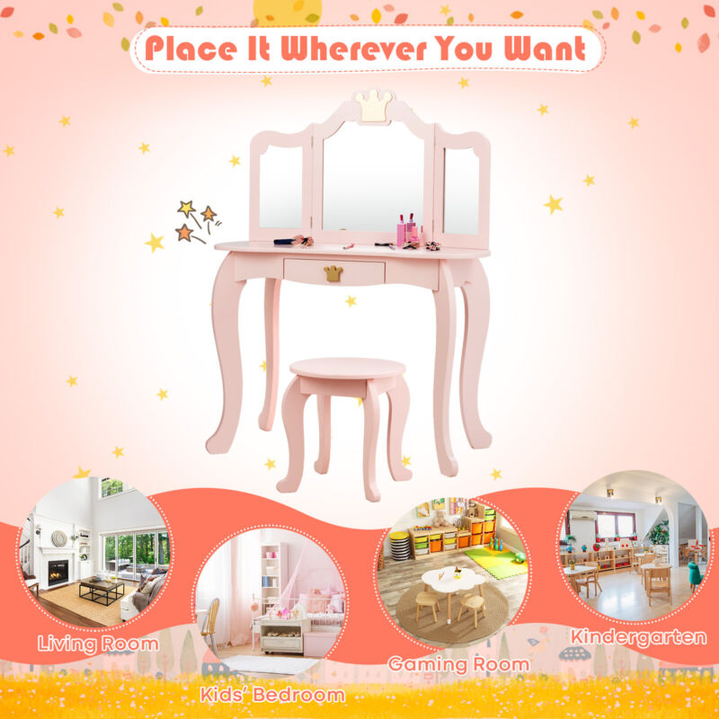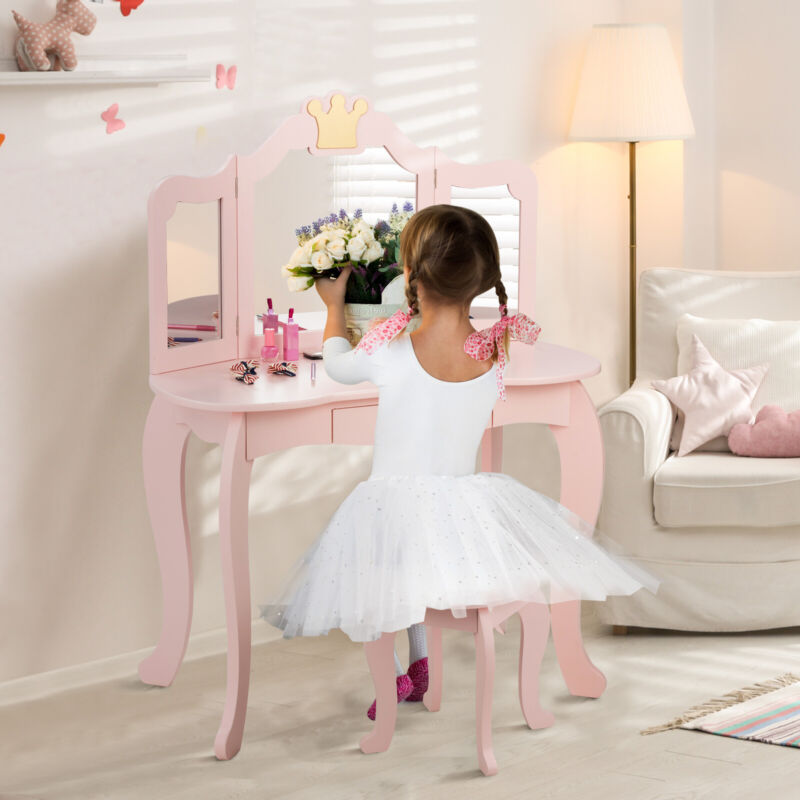 2 in 1 Kids Vanity Makeup Dressing Table & Chair Set W/ Tri-fold Mirror & Drawer