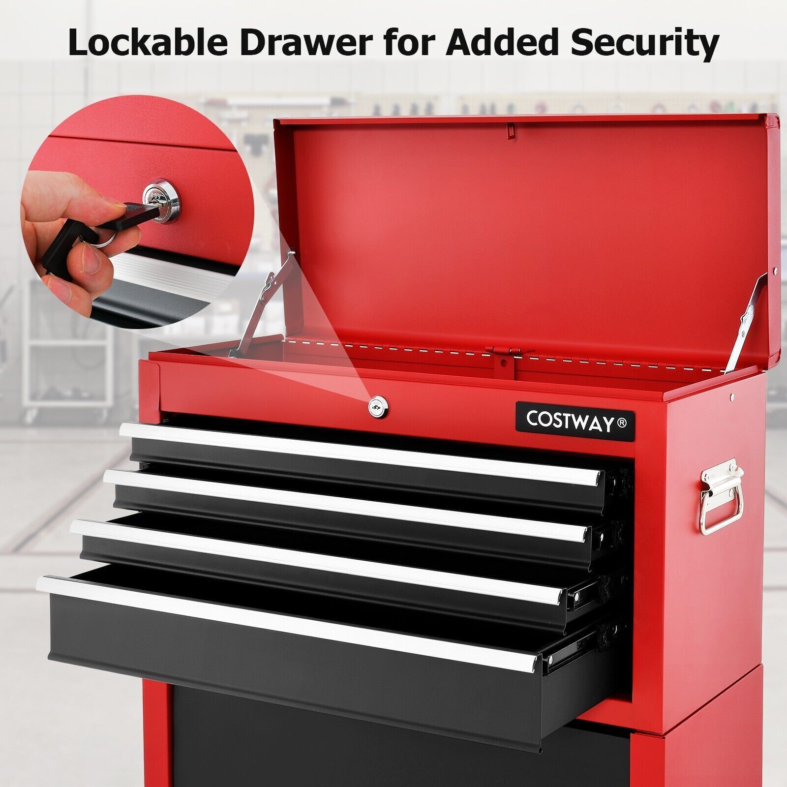2-In-1 Lockable Tool Storage Cabinet High Capacity Rolling Tool Chest-Red