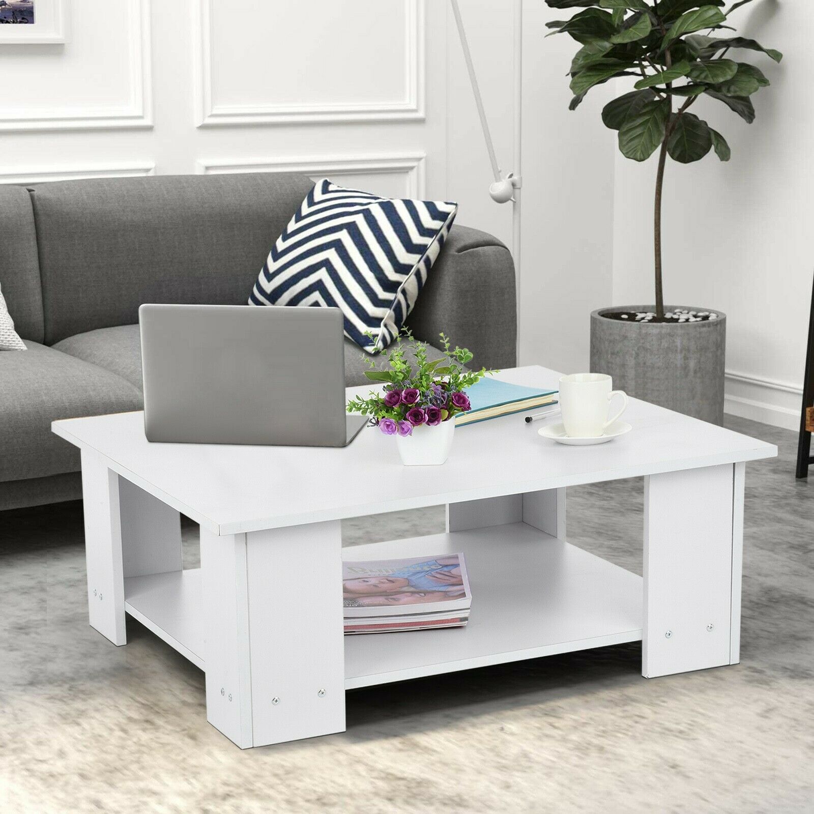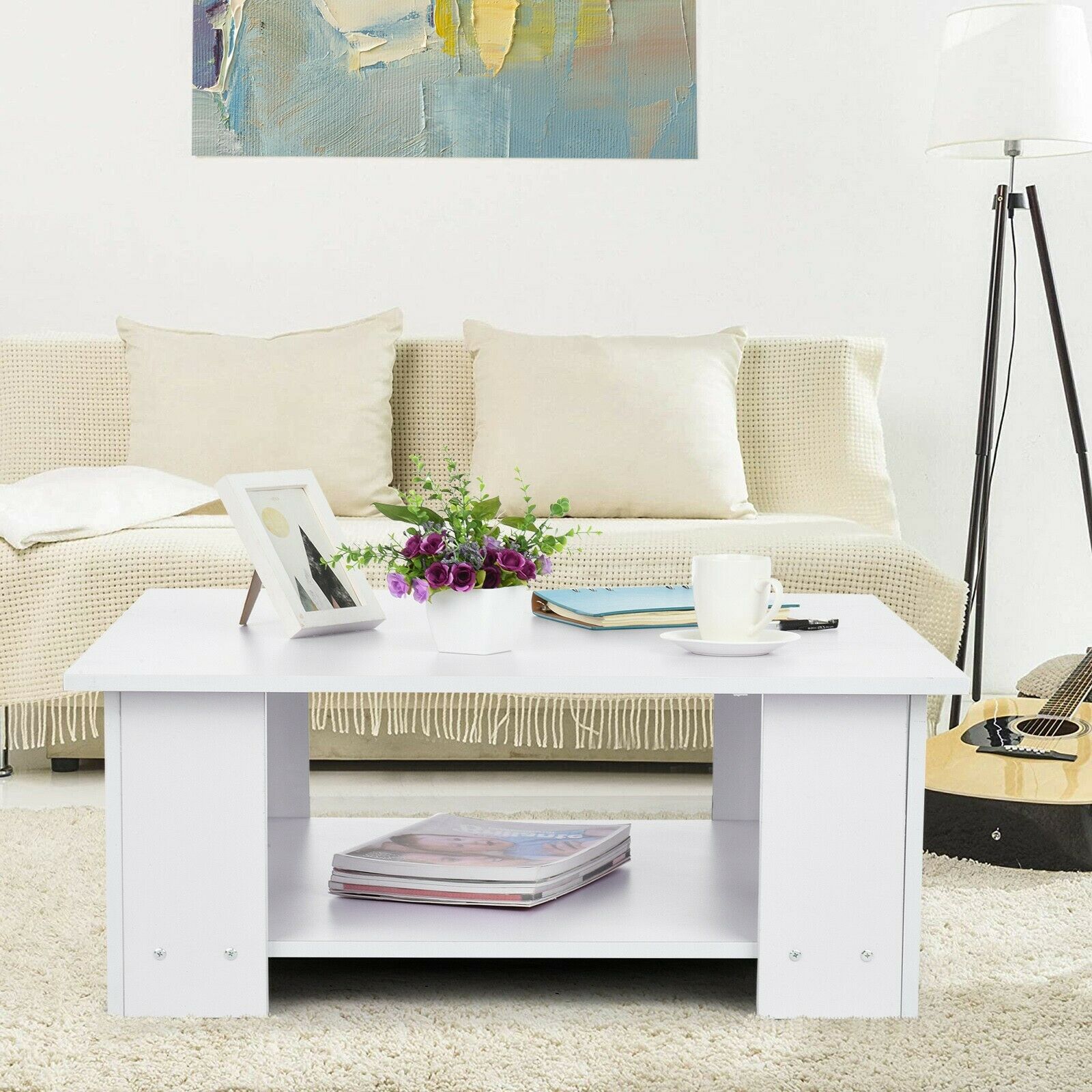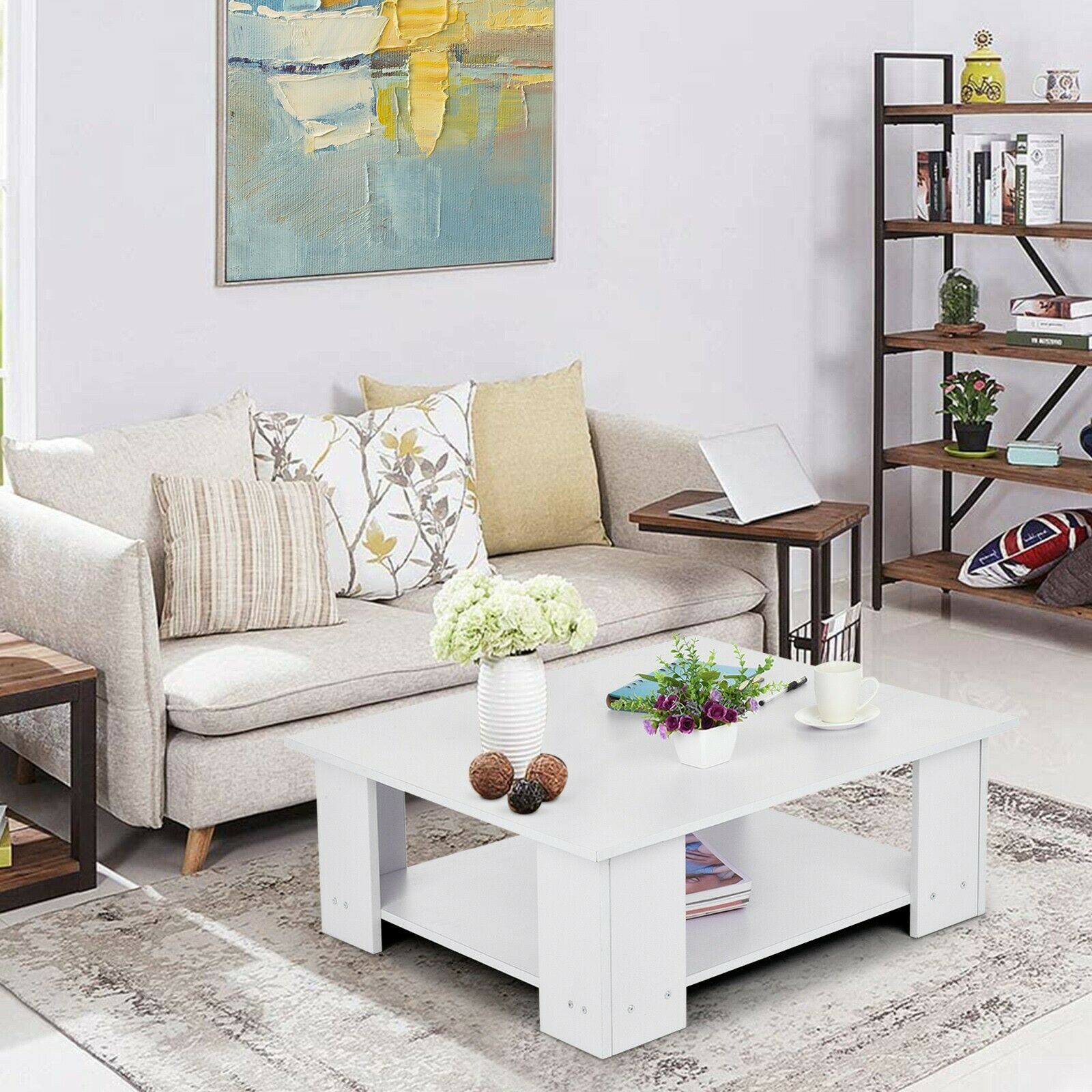 2 Tier Coffee End/Side Table Modern White Design with Storage Shelf Living Room