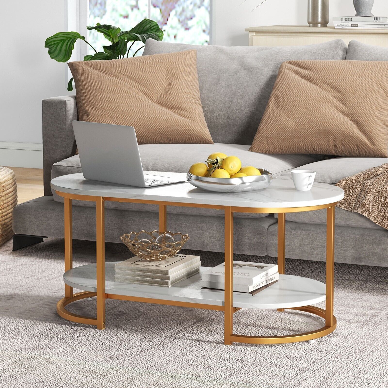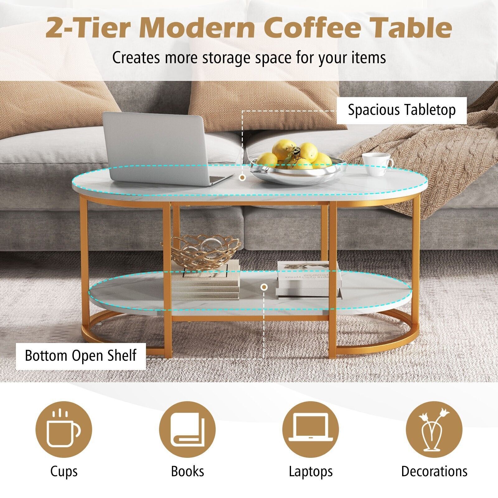 2-Tier Coffee Table Faux Marble Cocktail Table Modern Center Table Accent Table