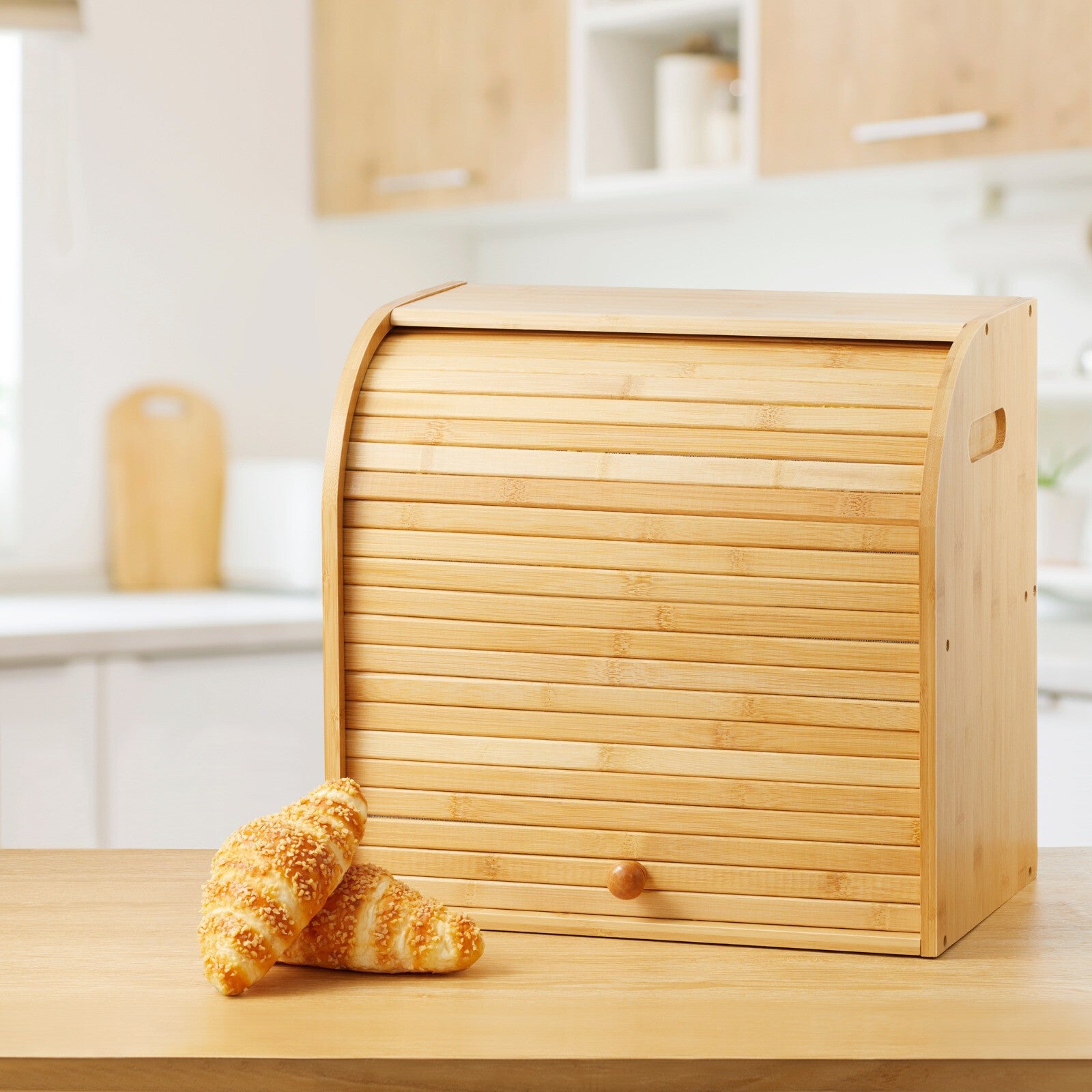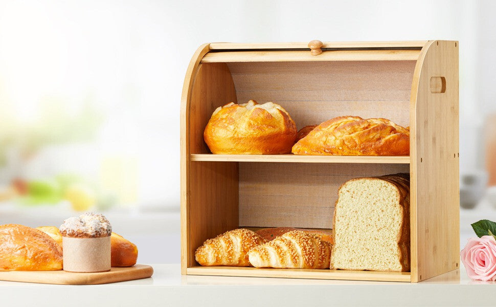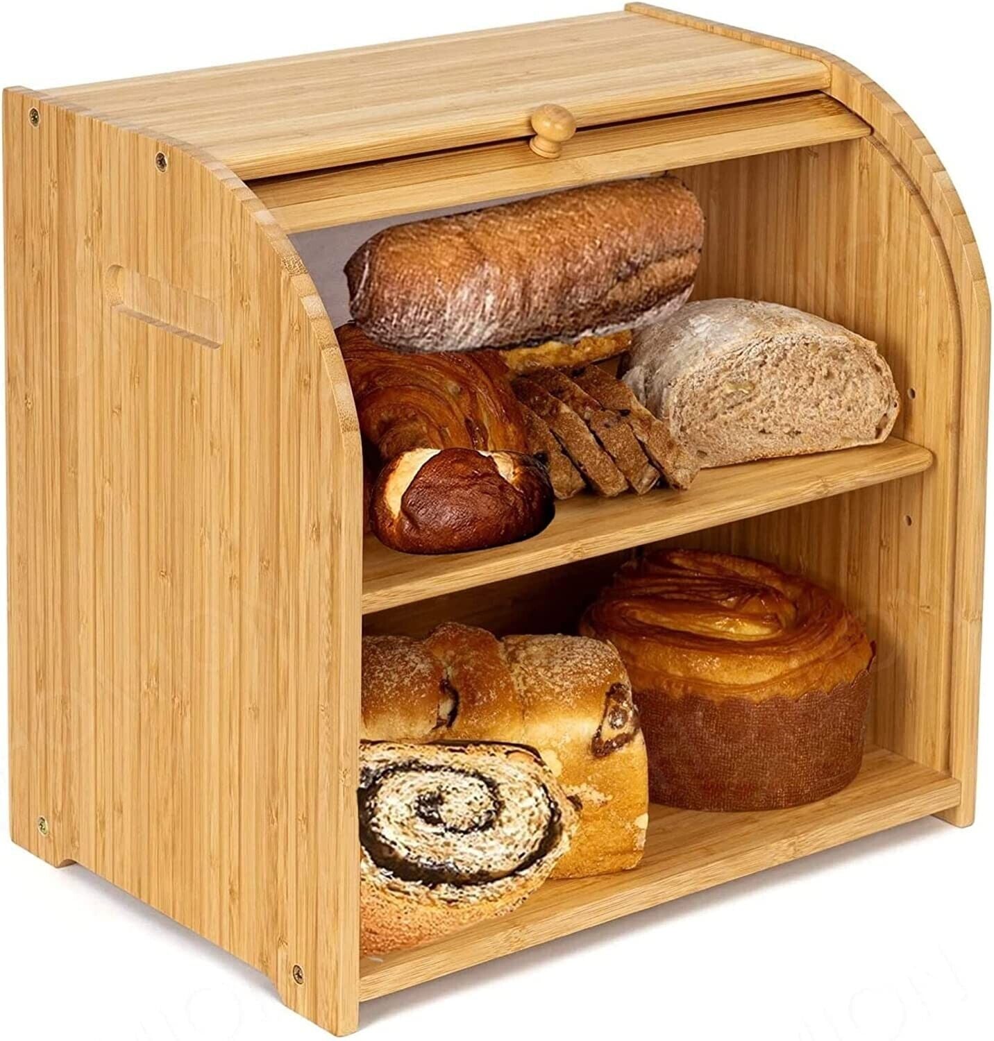 2 Tier Double Layer Bread Box Slide Roll Top Bread Storage Bin Kitchen Bamboo