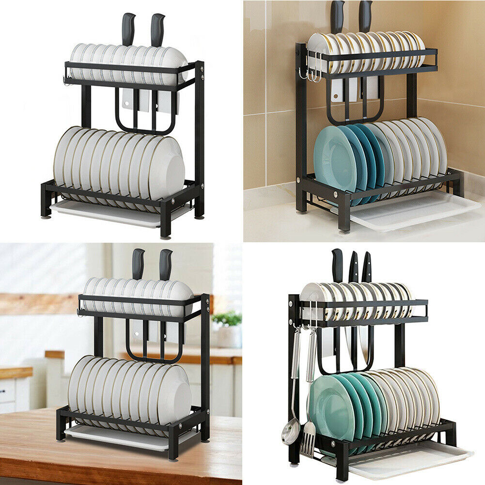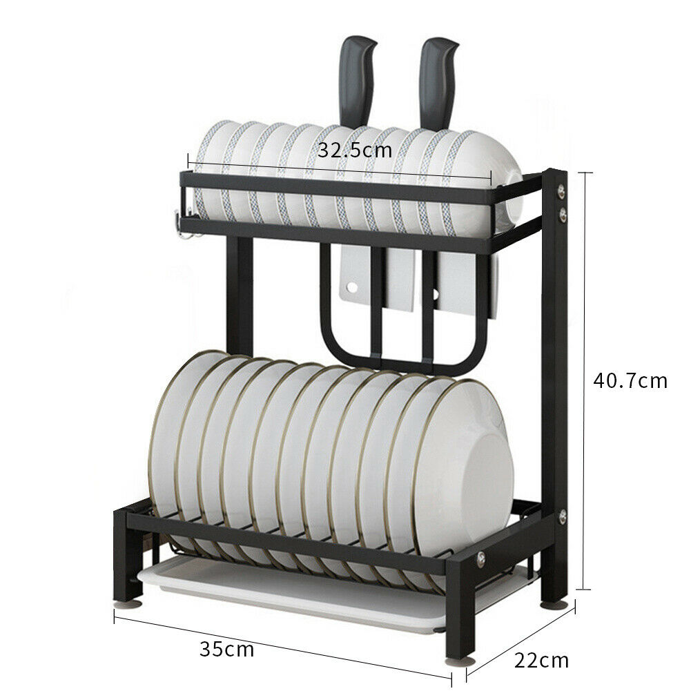 2 Tier Kitchen Steel Dish Cutlery Cup Drainer Rack Drip Tray Plates Bowls Holder