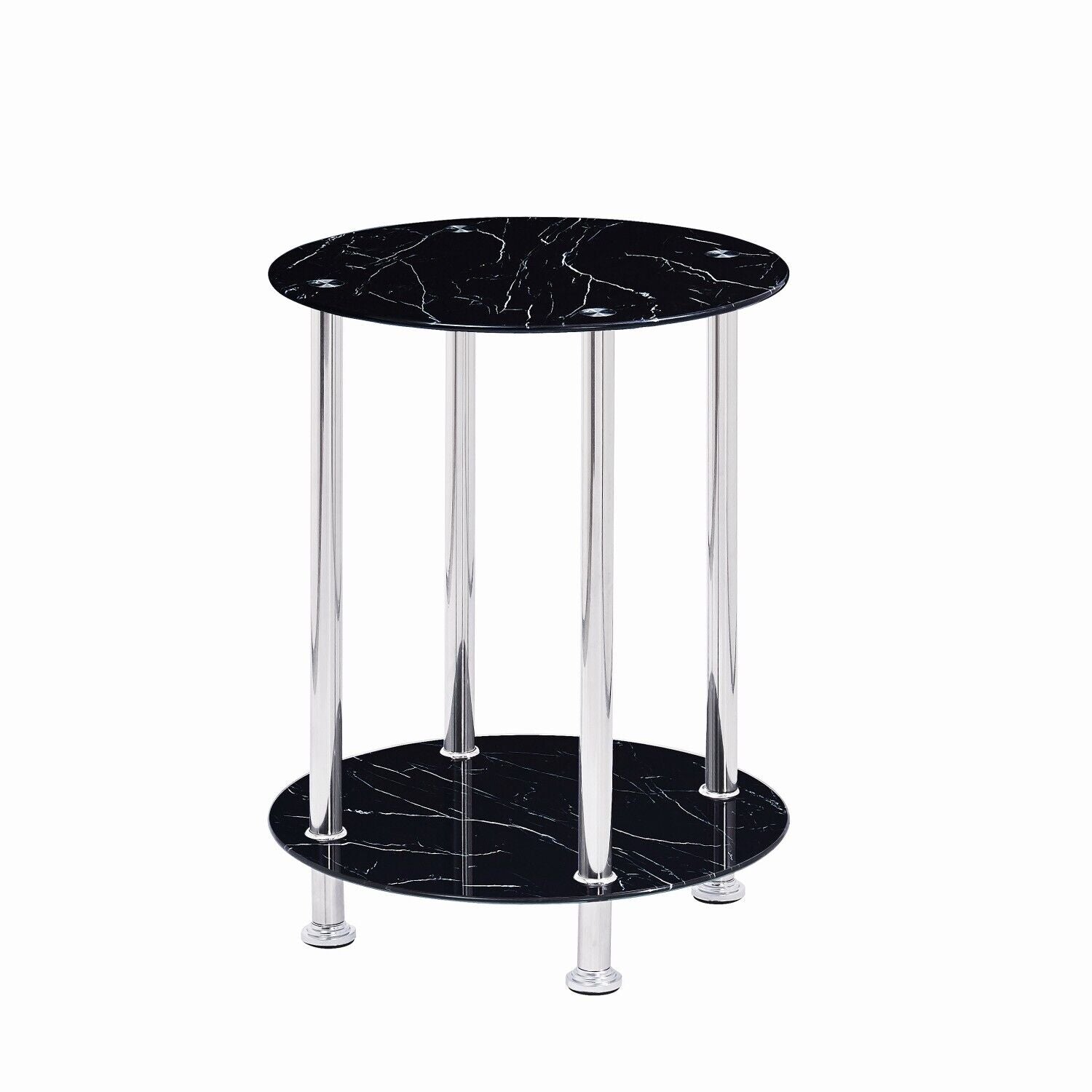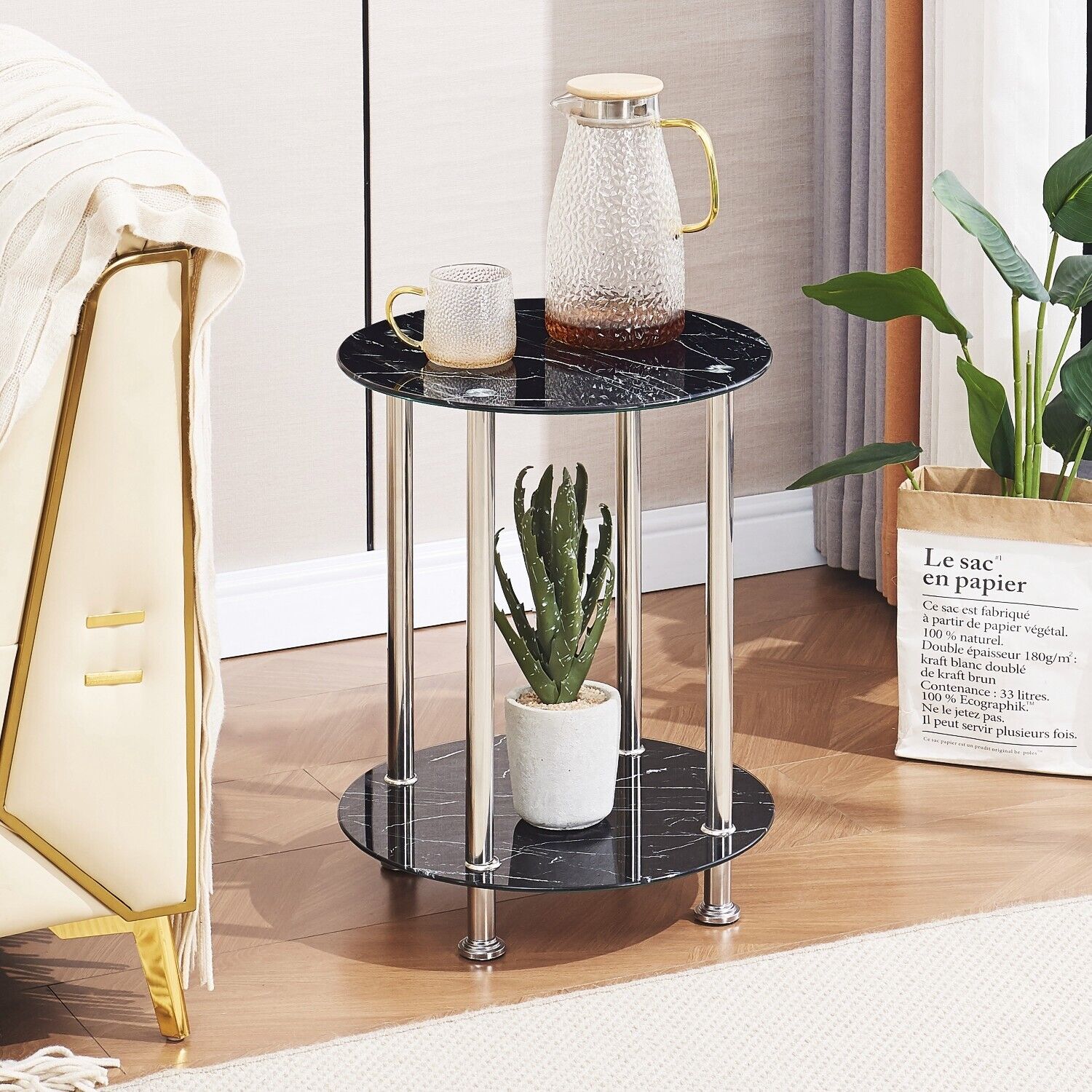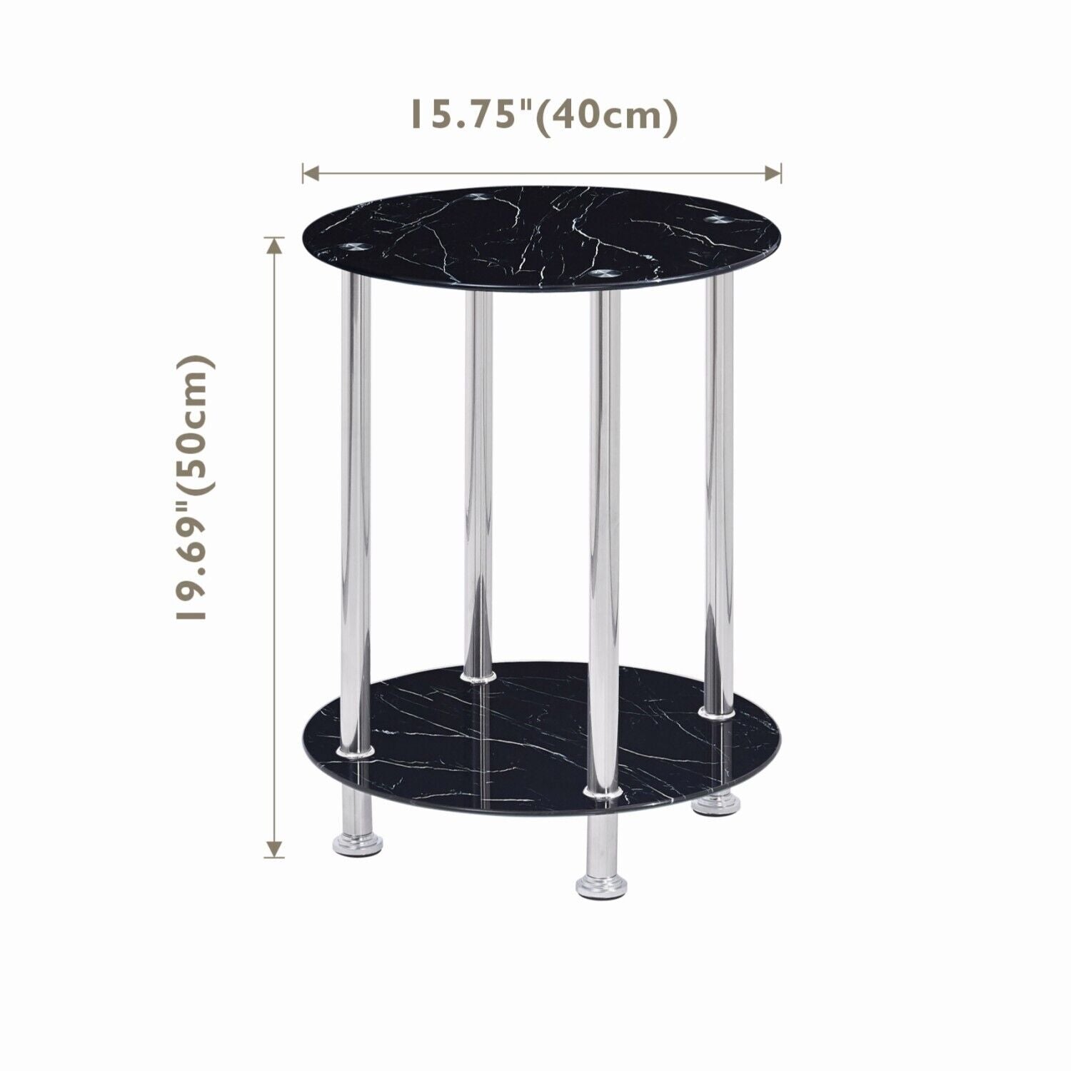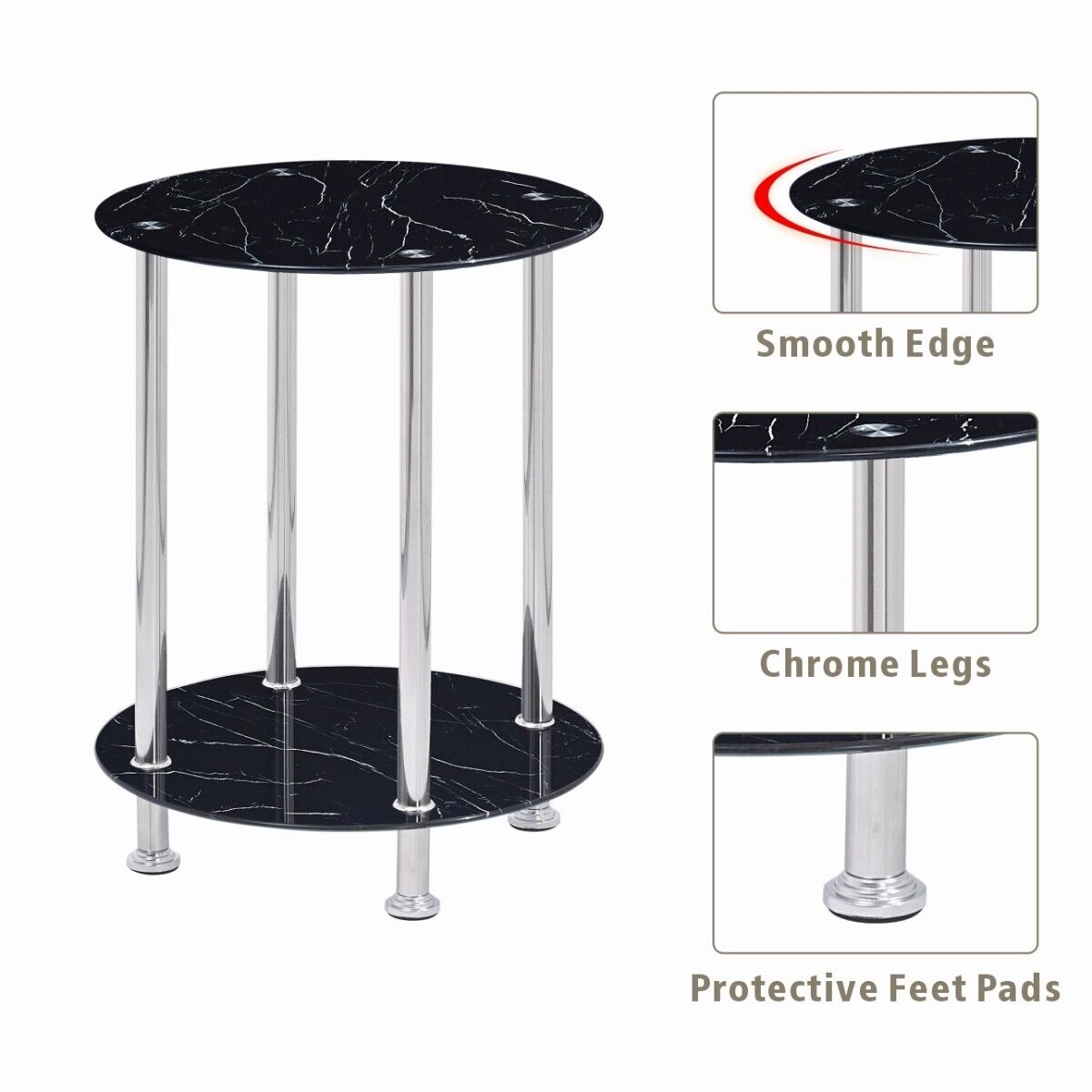 2 Tier Round Black Marble Tempered Glass Side End Bedside Table Stainless Steel