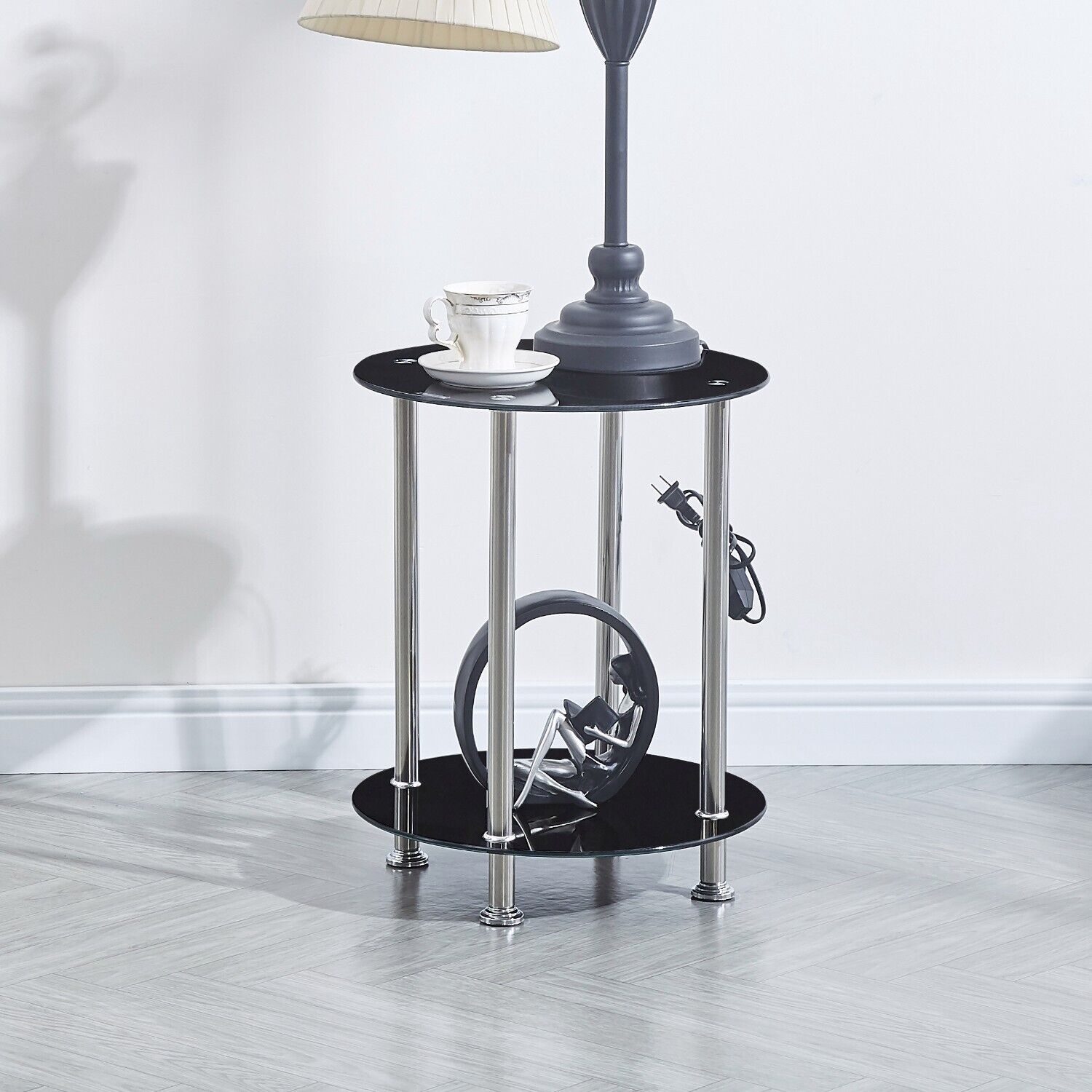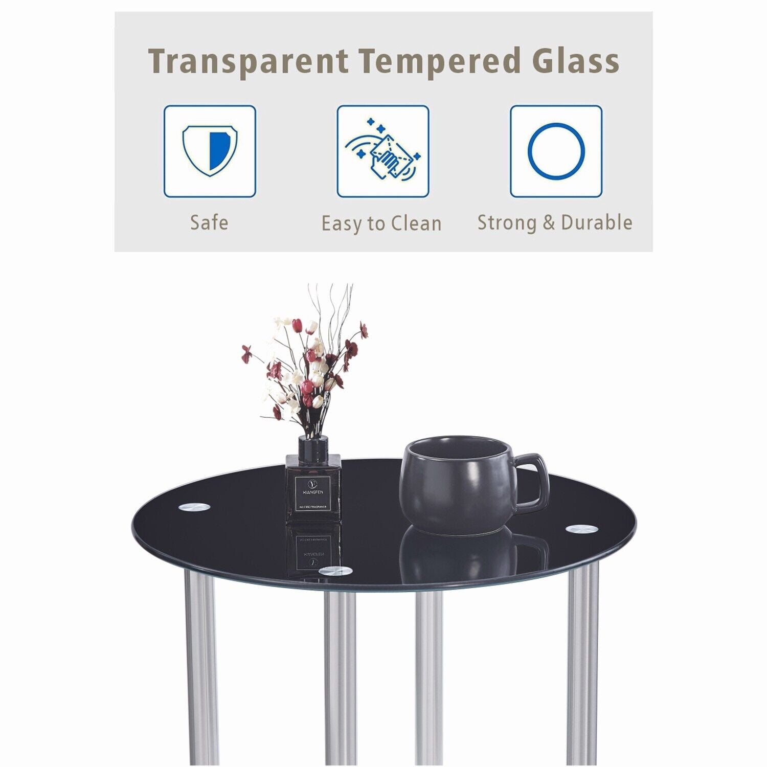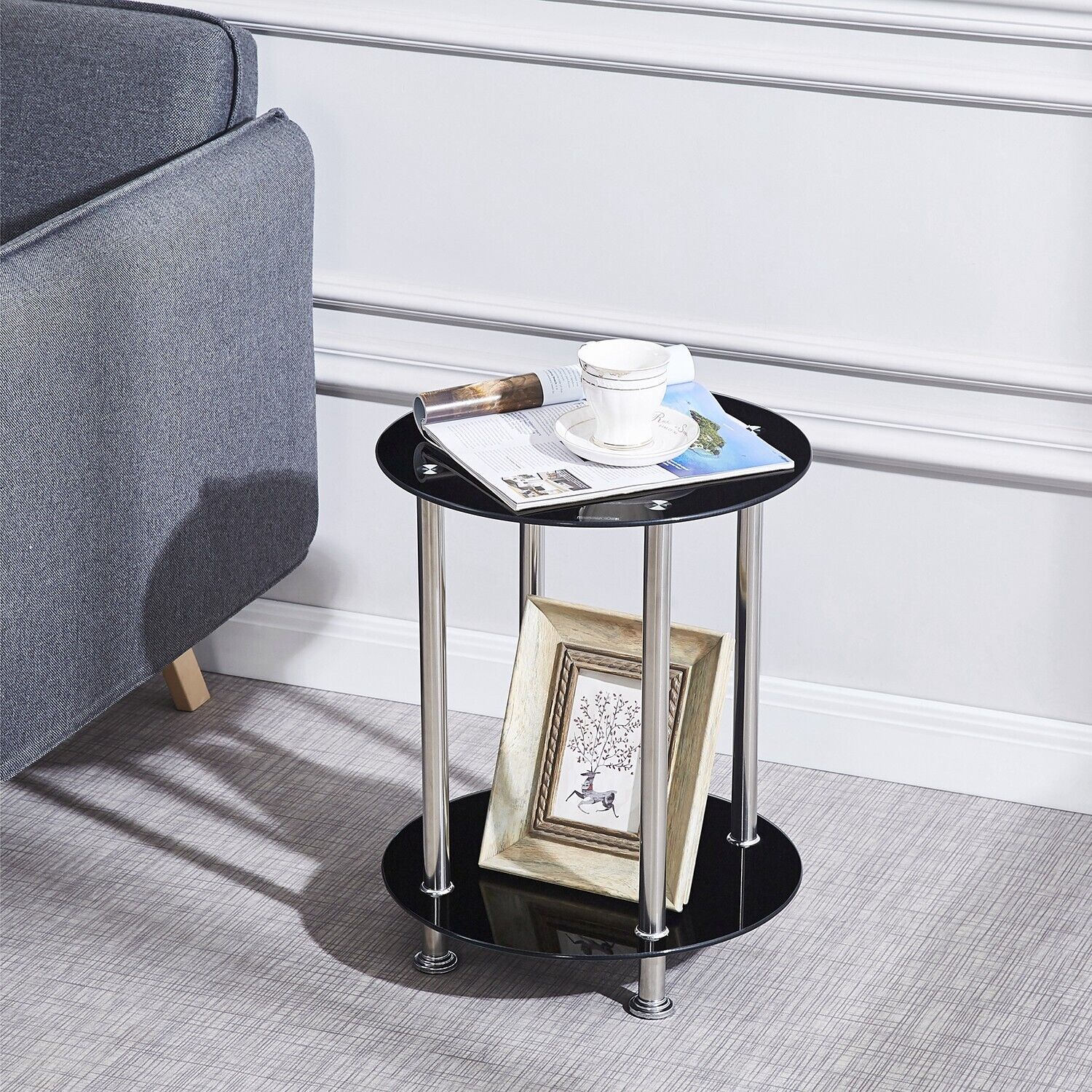 2 Tier Round Black Tempered Glass Sofa Side End Table Bedside Table with Storage
