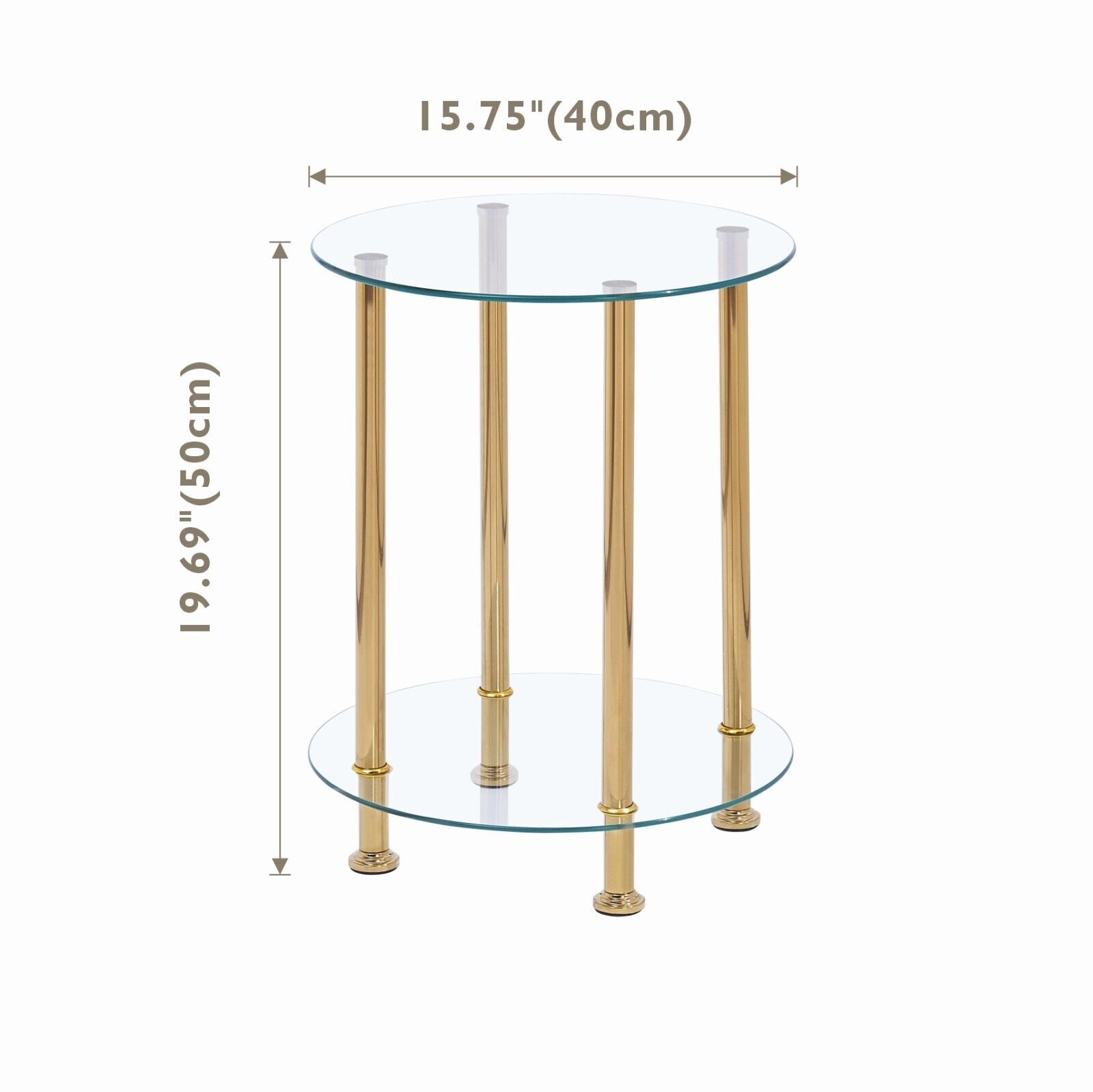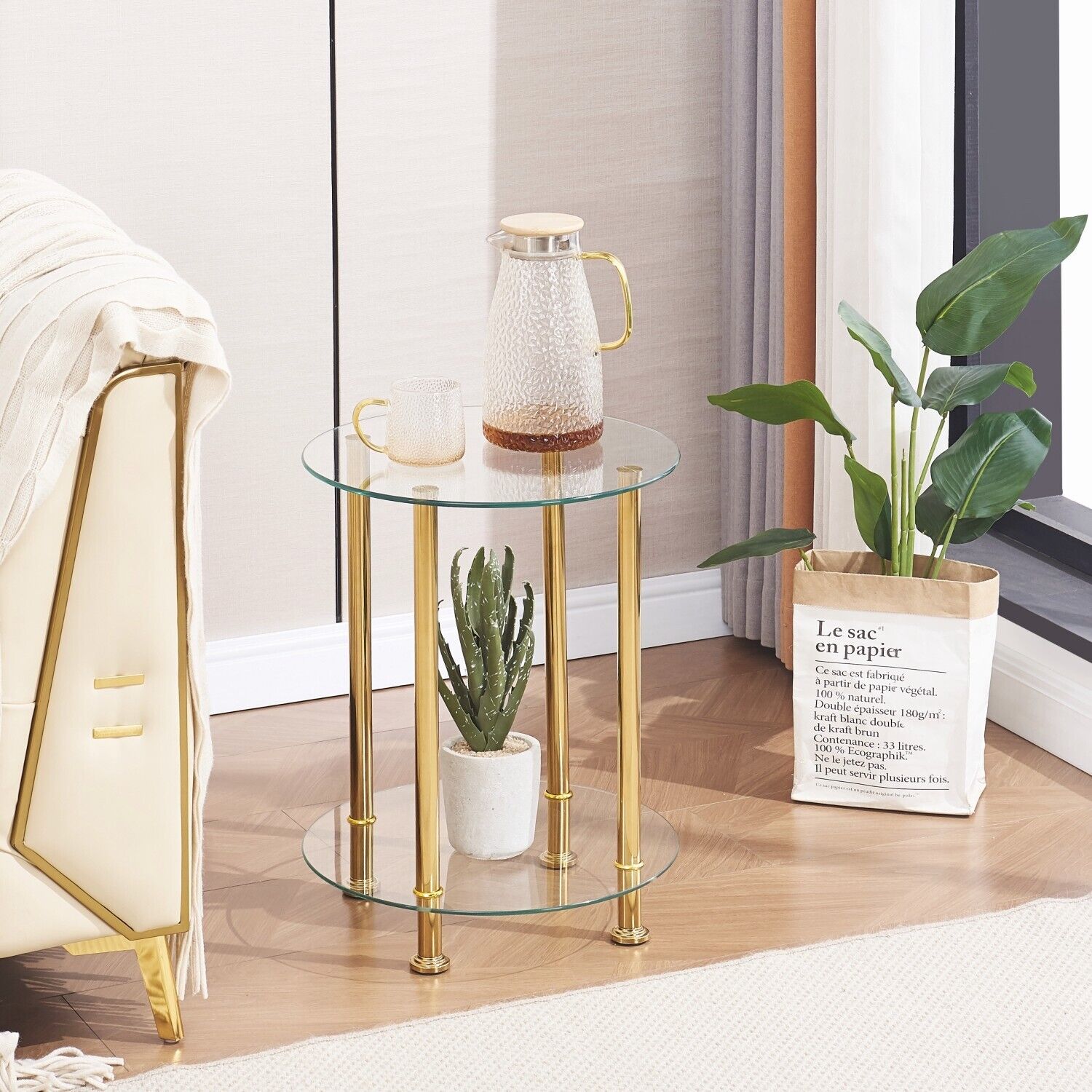 2 Tier Round Clear Tempered Glass Sofa Side End Table Bedside Table Golden Tubes