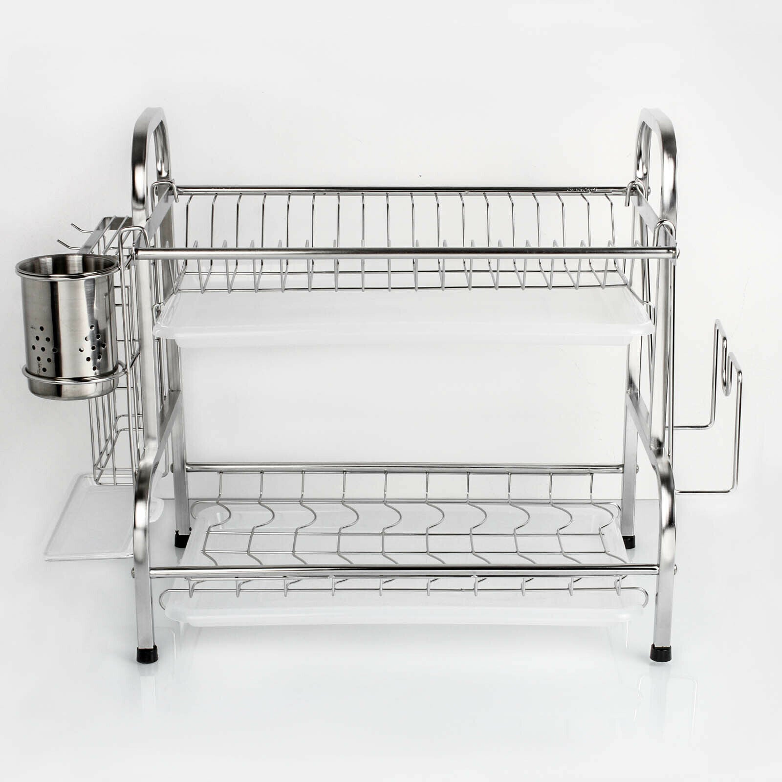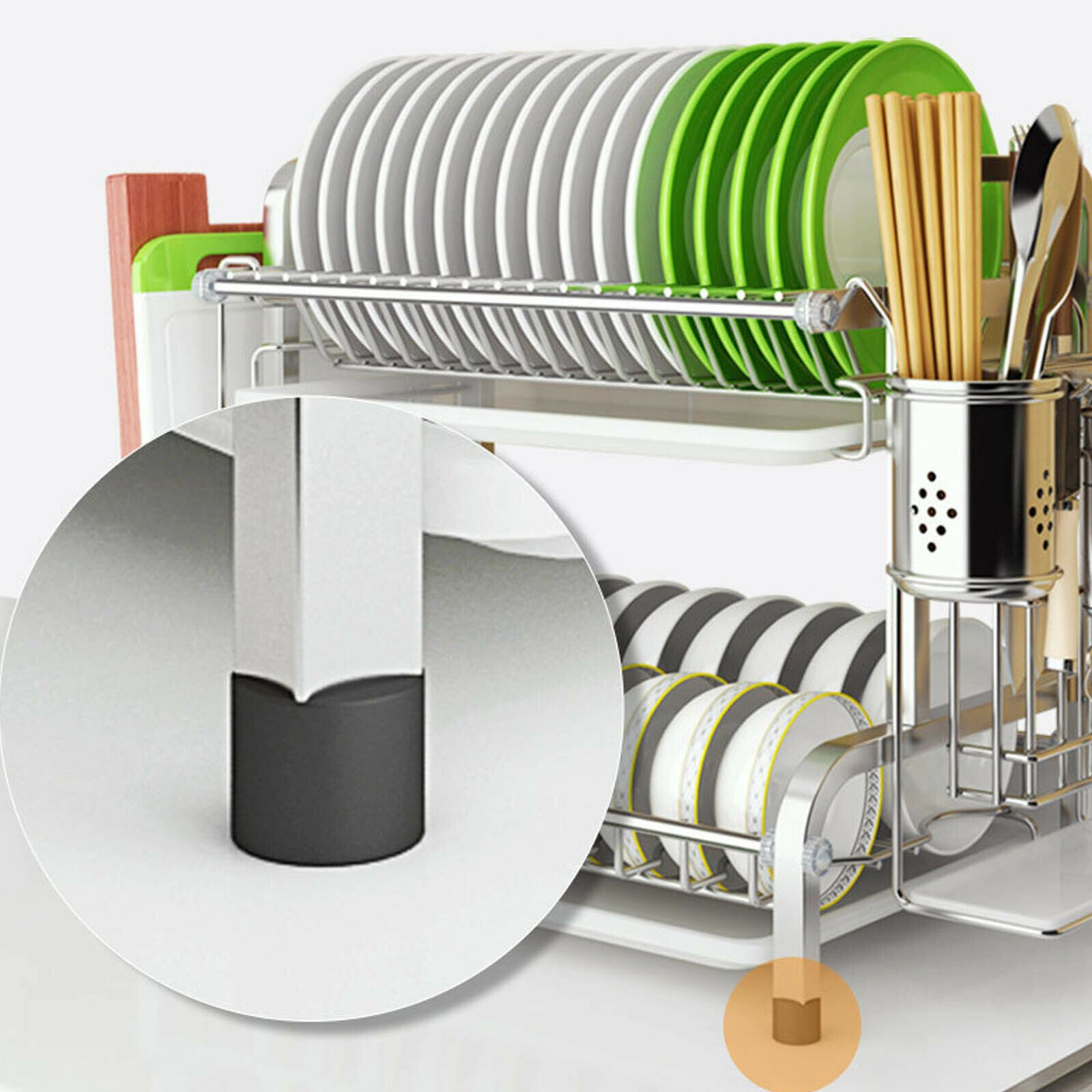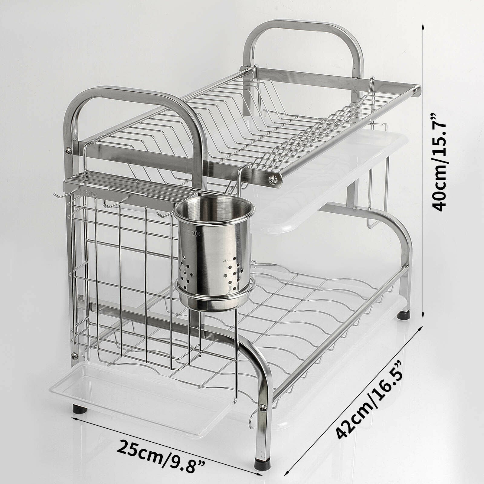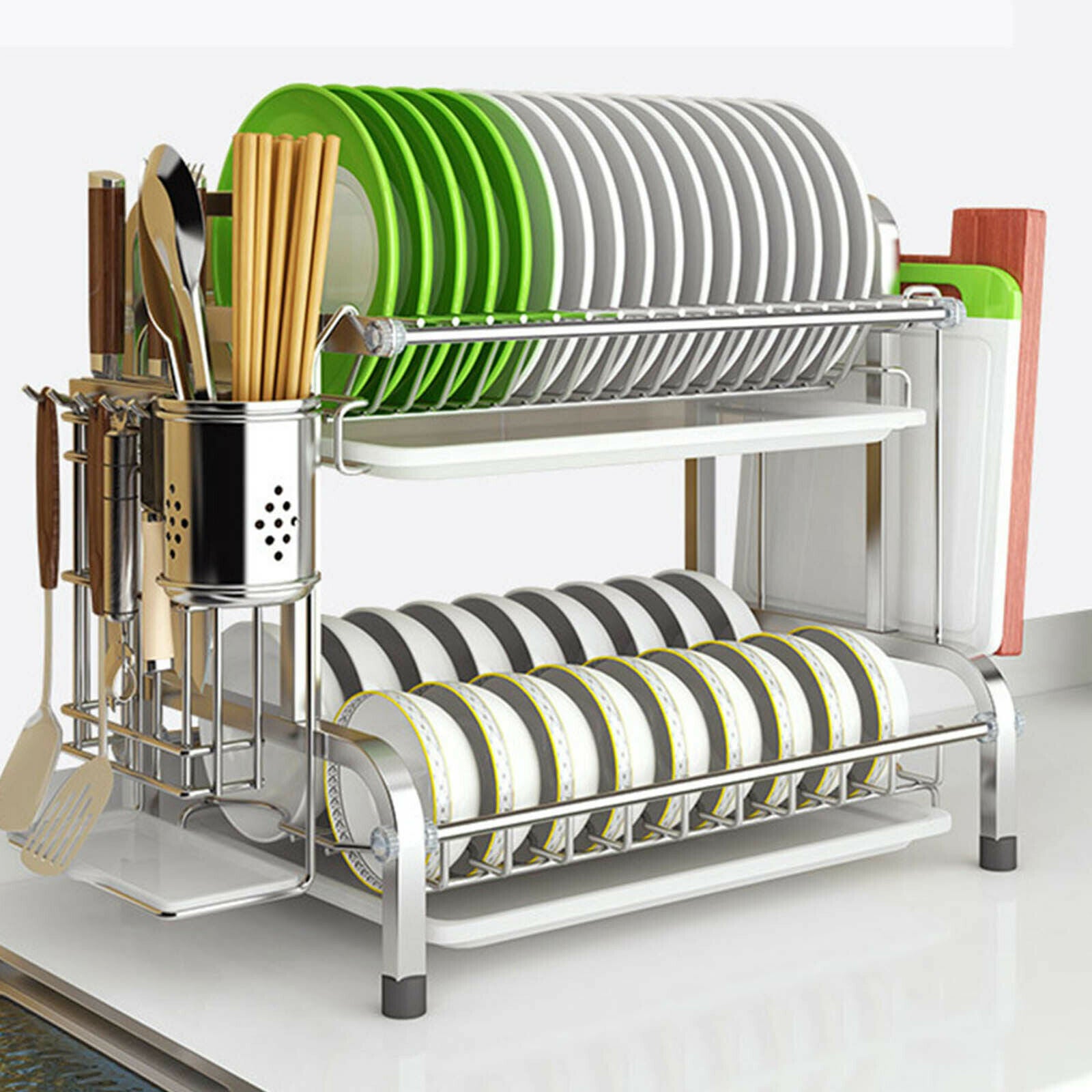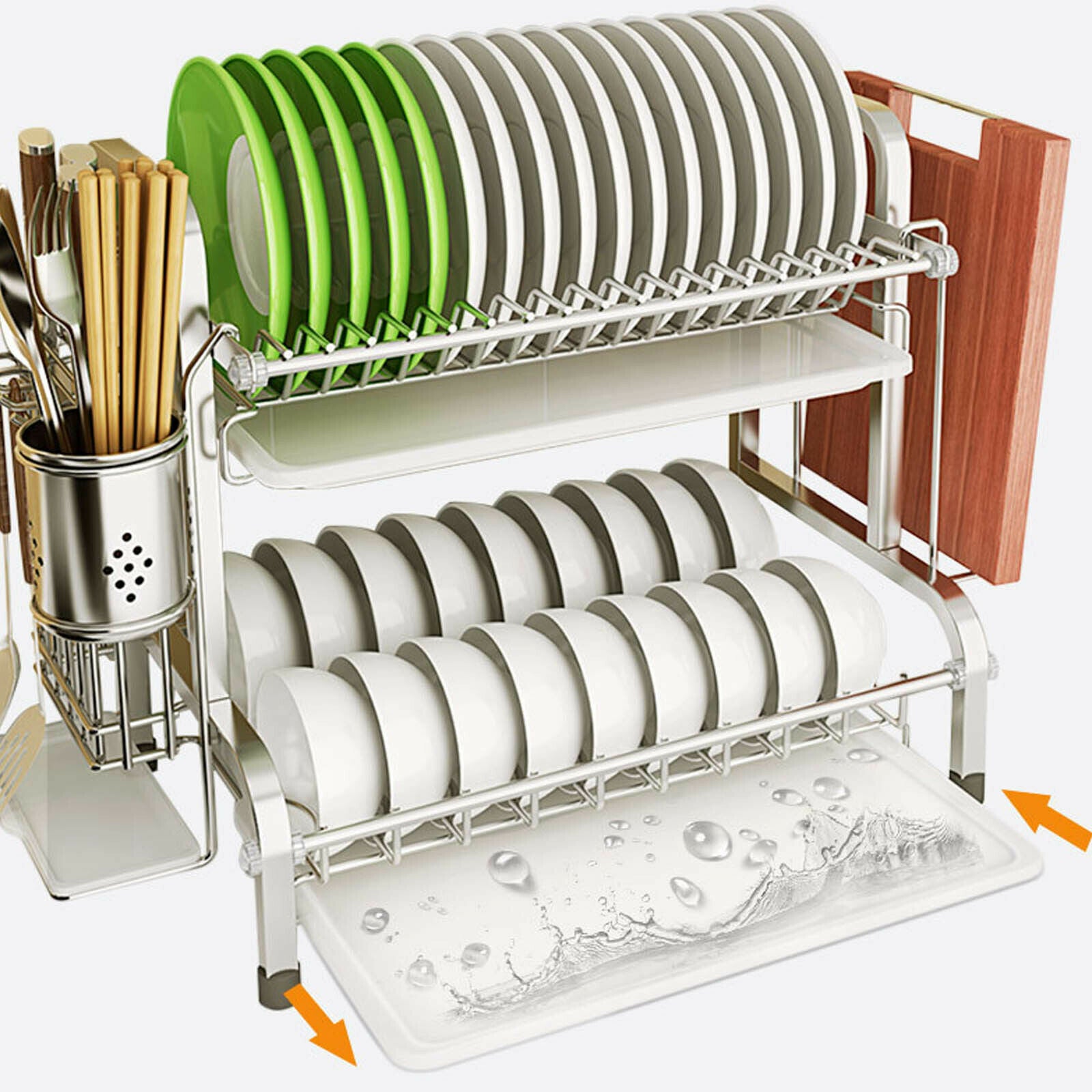2 Tier Stainless Steel Plate Dish Cutlery Drainer Drying Rack Drip Tray Holder