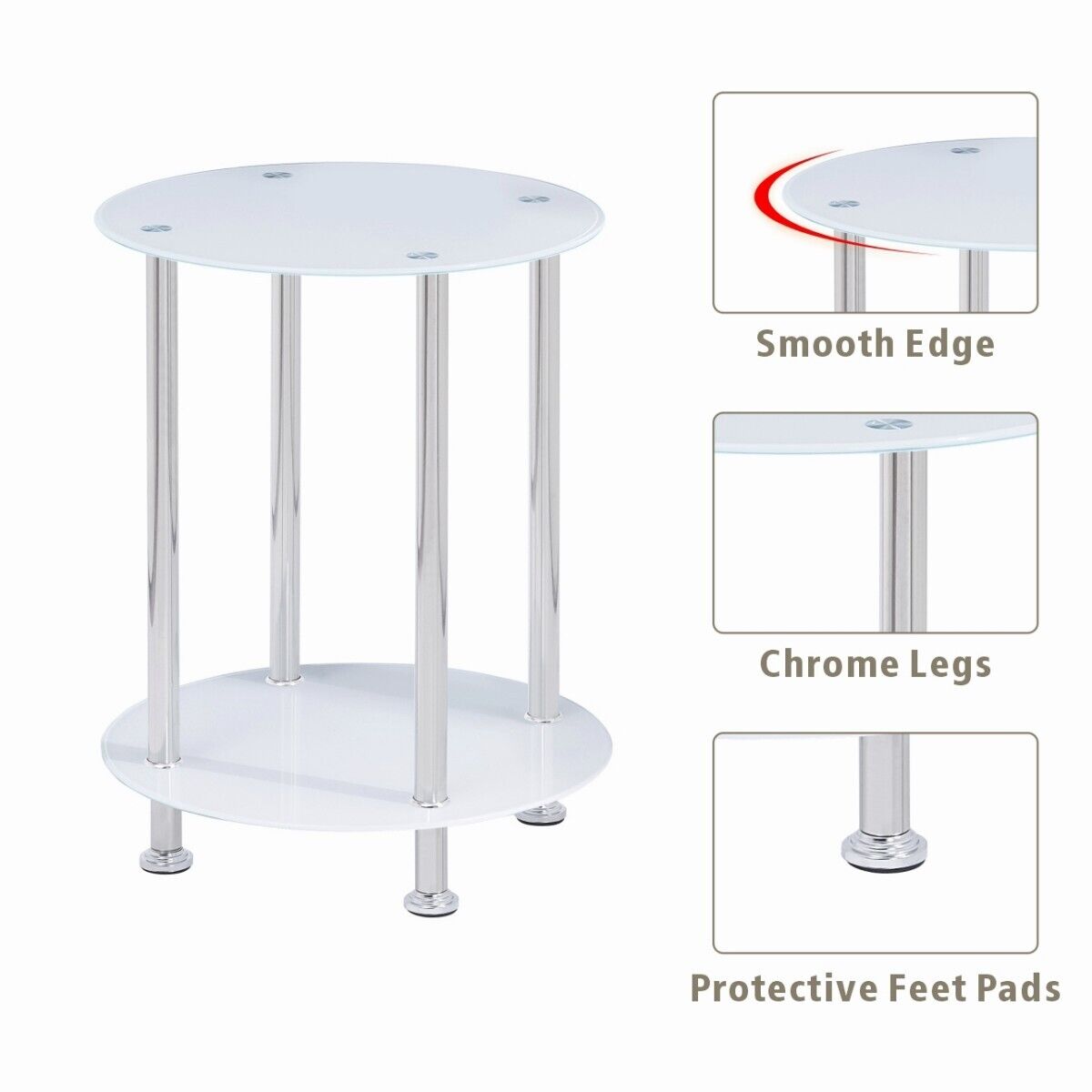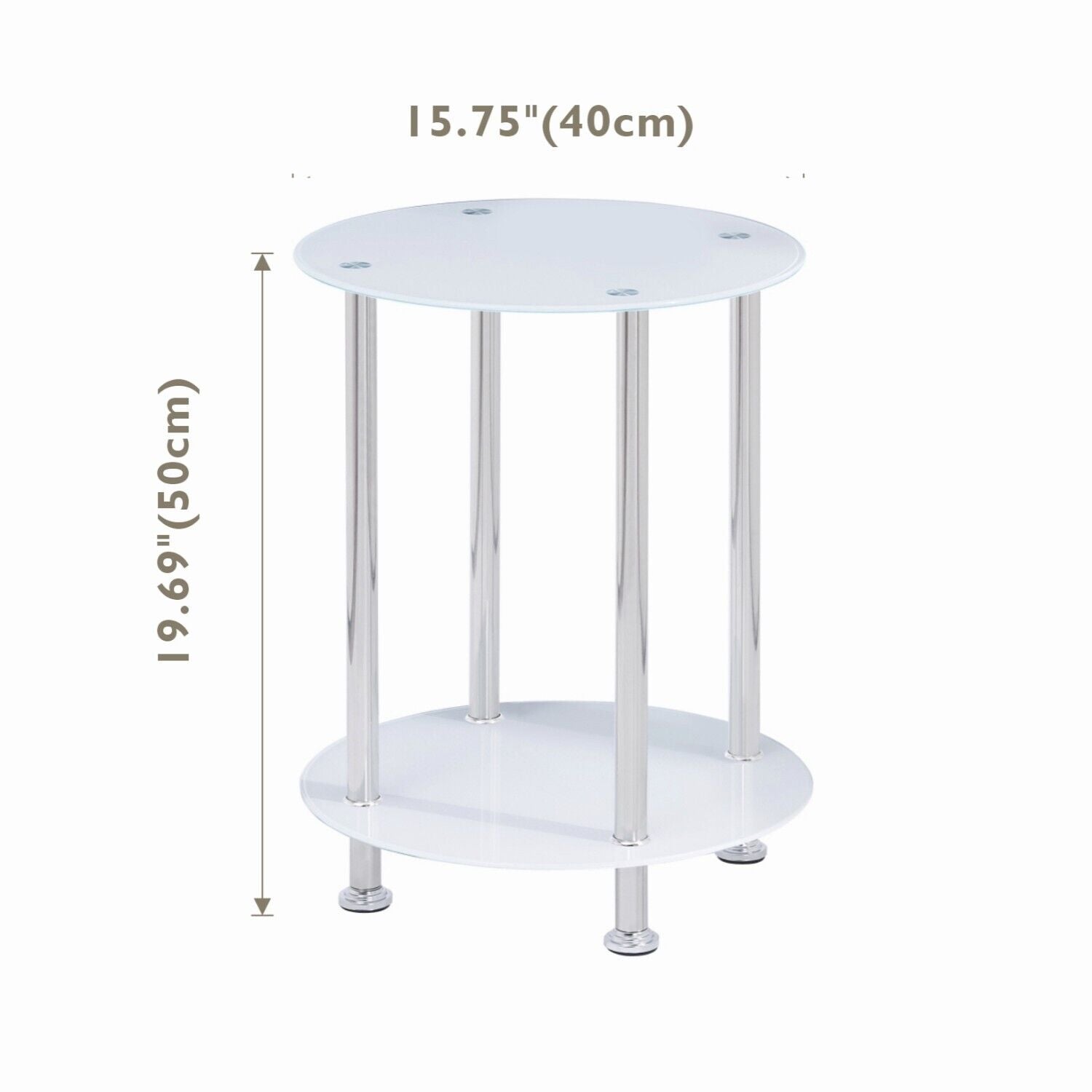 2 Tier White Tempered Glass Side End Table Storage Shelf Stainless Steel Tubes