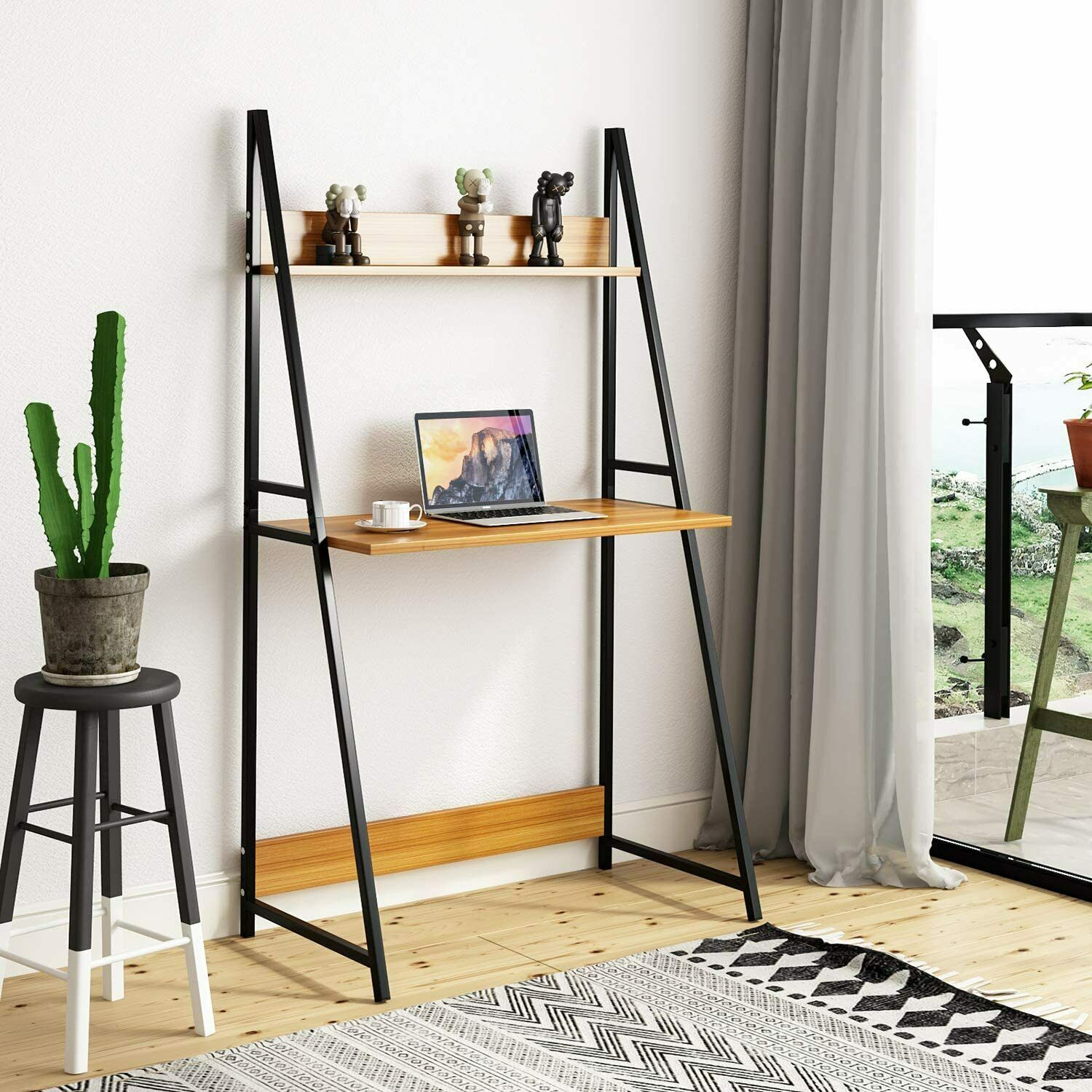 2-Tier Wood Computer Desk Metal Frame Study Writing Table with Shelf Storage