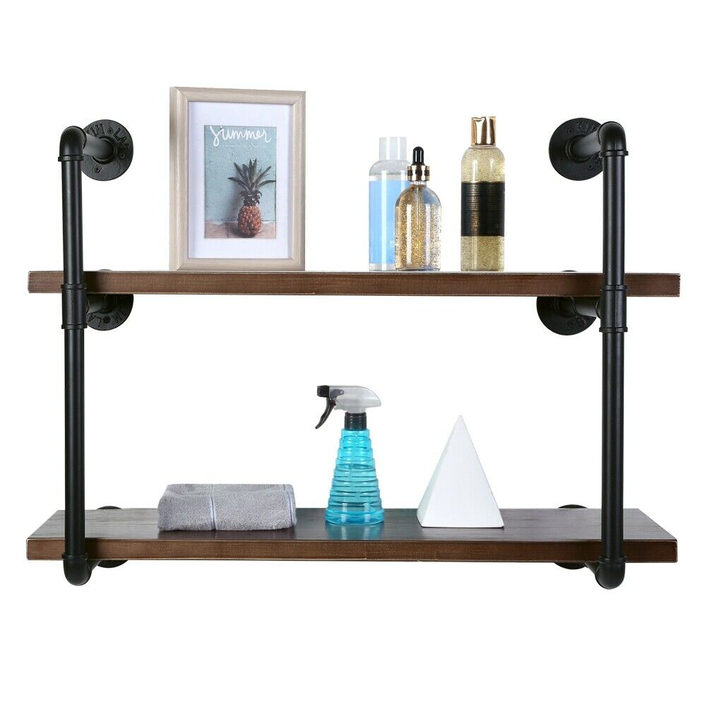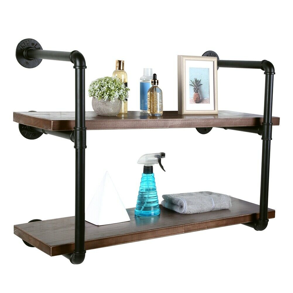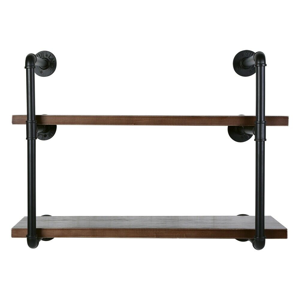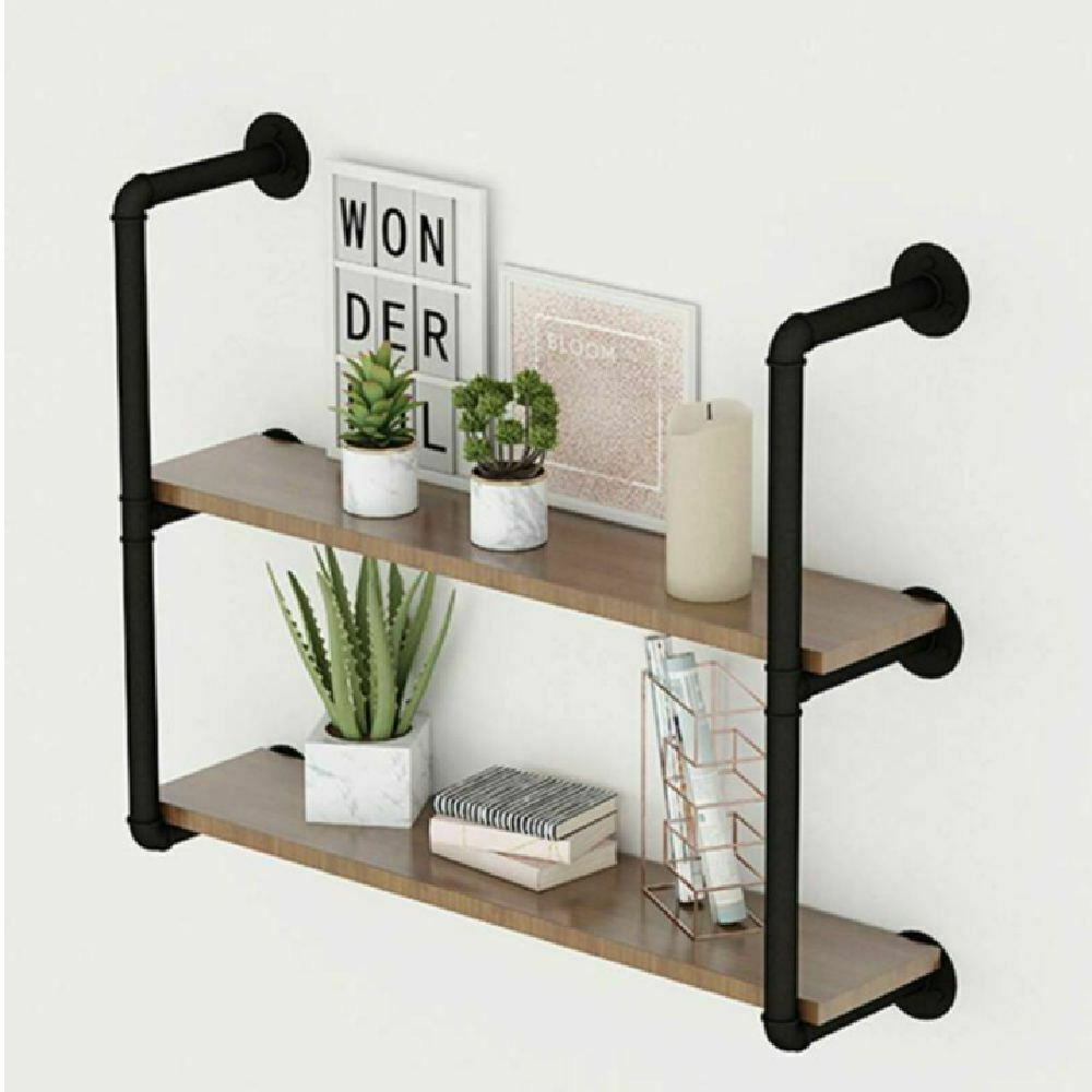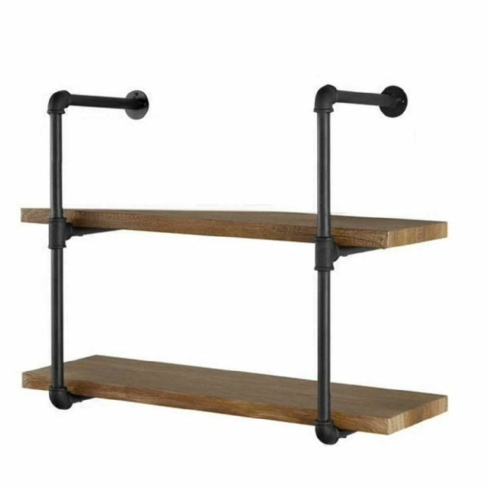 2 Tiers Industrial Iron Pipe Shelf Retro Wall Mounted Shelving With Wood Board