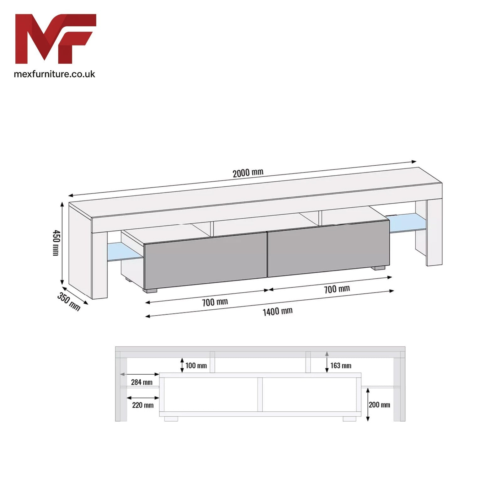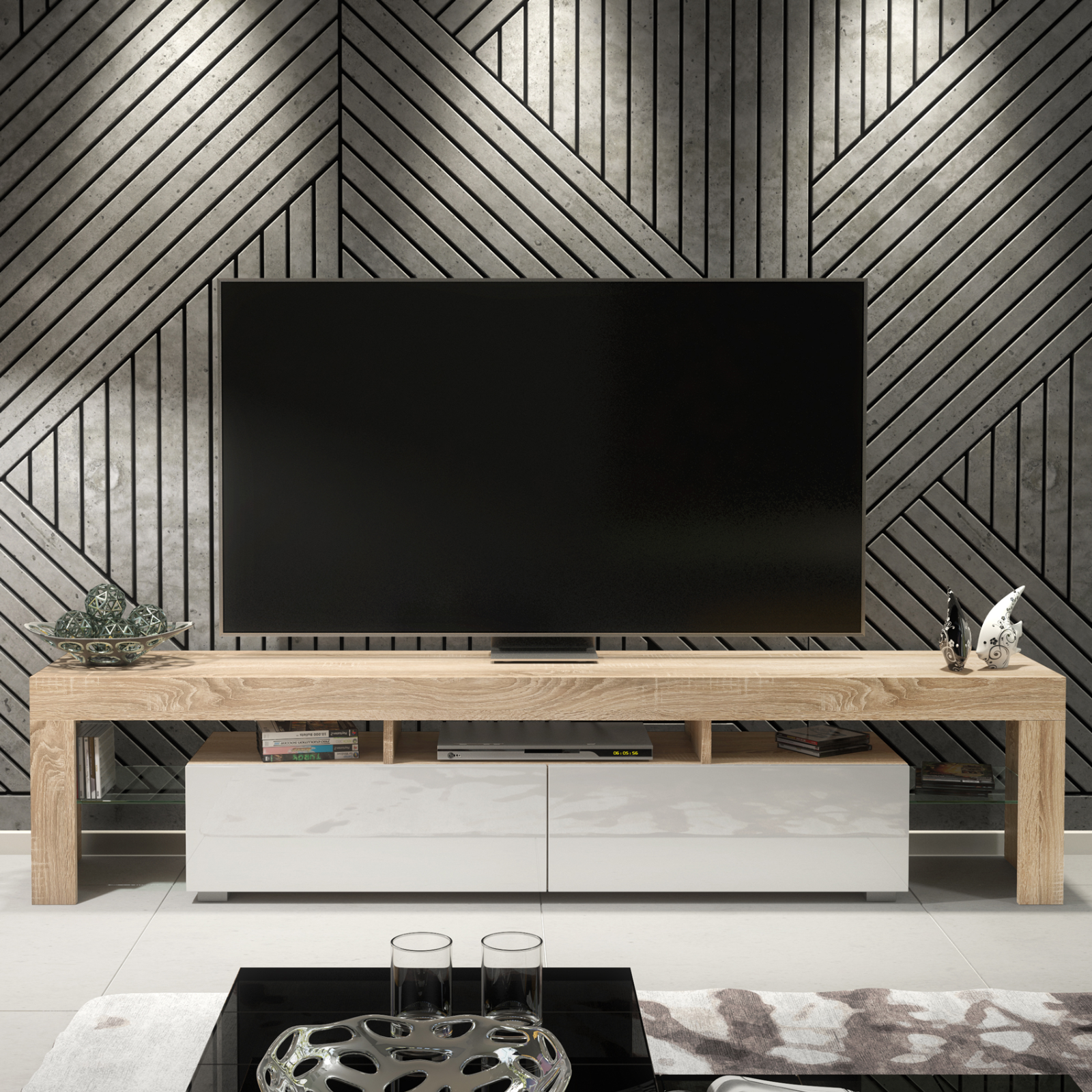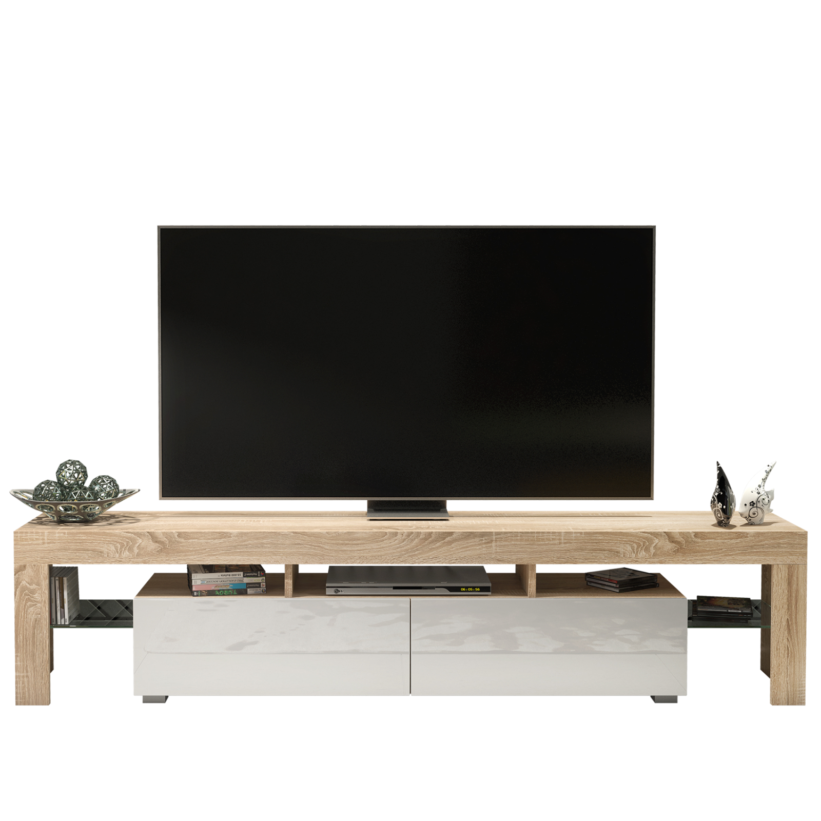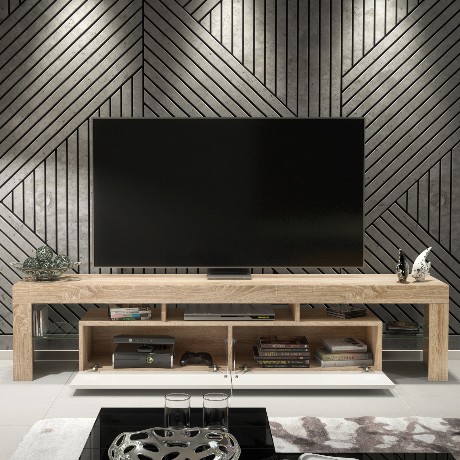 200cm I Modern TV Unit I Cabinet with Storage I Oak I High Gloss White Doors
