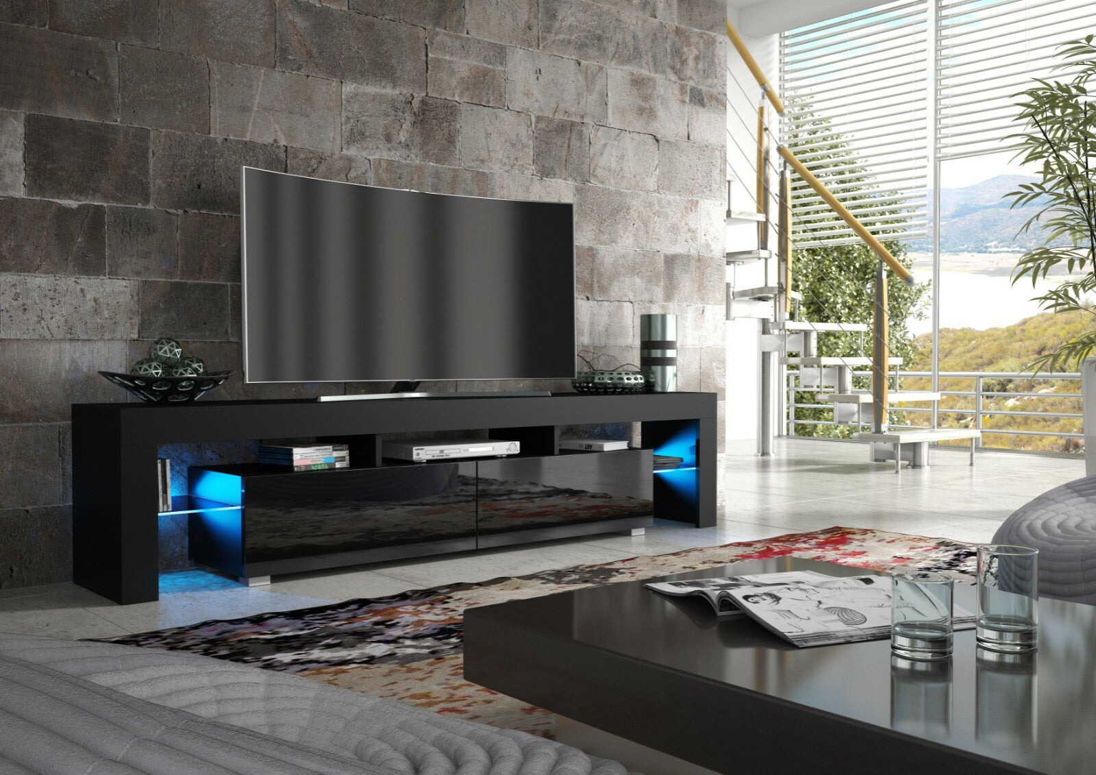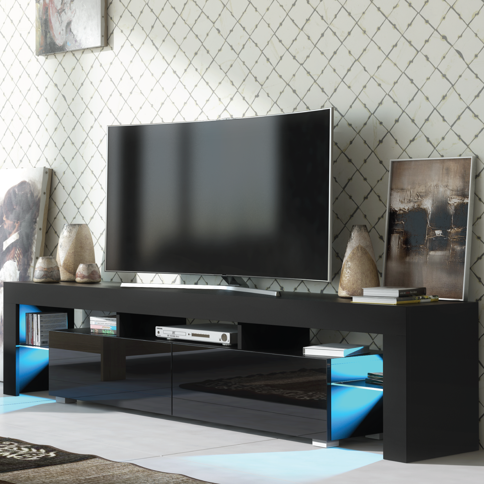 200cm TV Unit I Modern Cabinet TV Stand I Black High Gloss Doors I Free LED