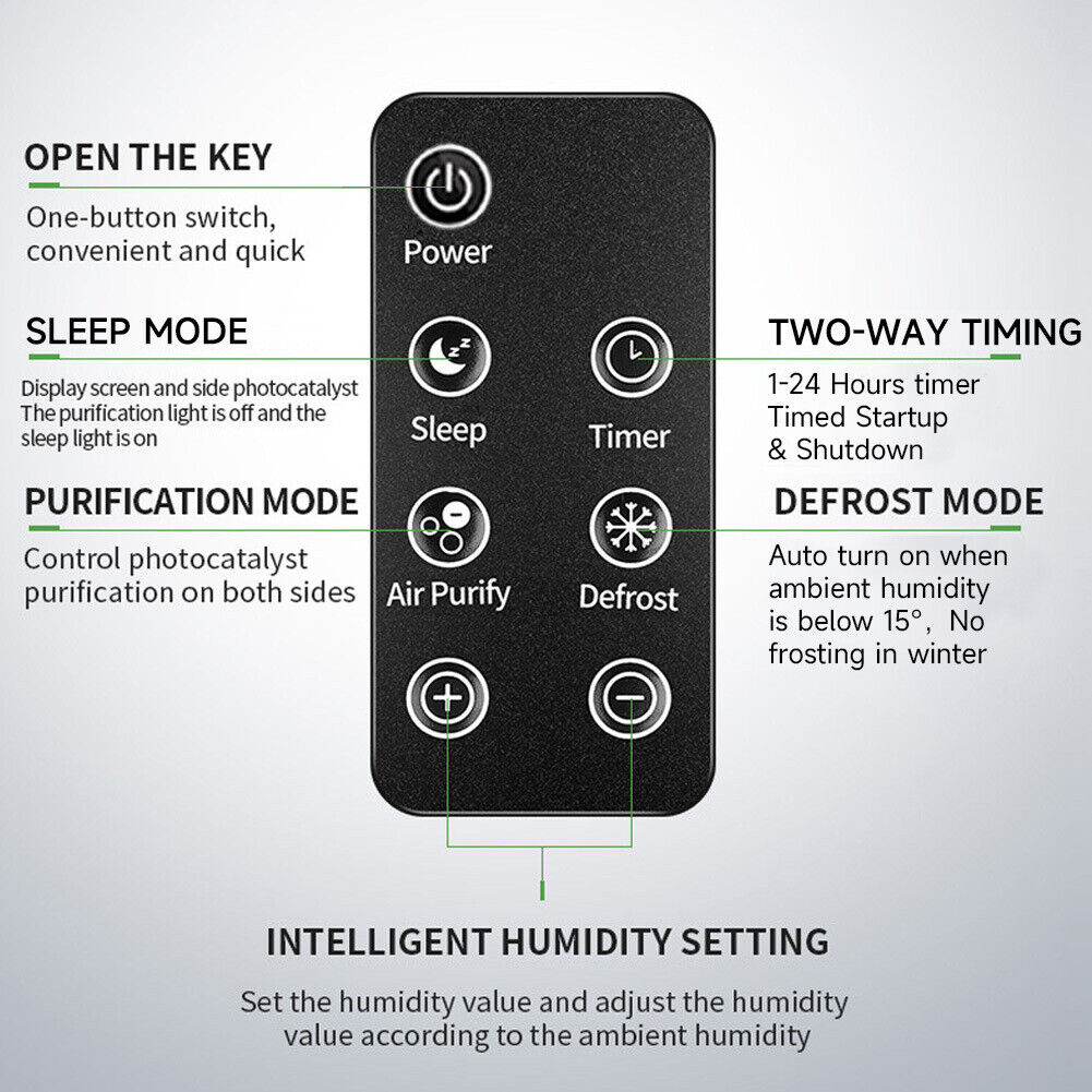 Features Adjustable Humidistat, Digital Display, LED Display, Removable Water Tank, Timer, Nighttime/Sleep Mode, Quiet Operation, Remote Control, Low Noise, Portable, Humidity Setting, Anion Purification, High-low Wind