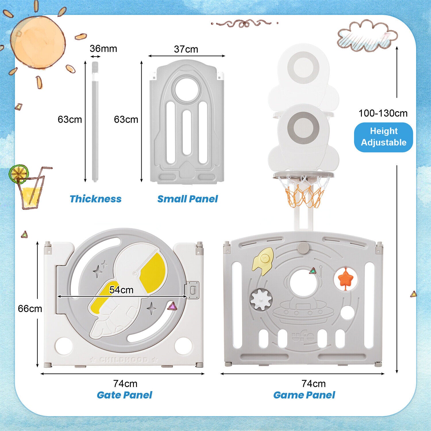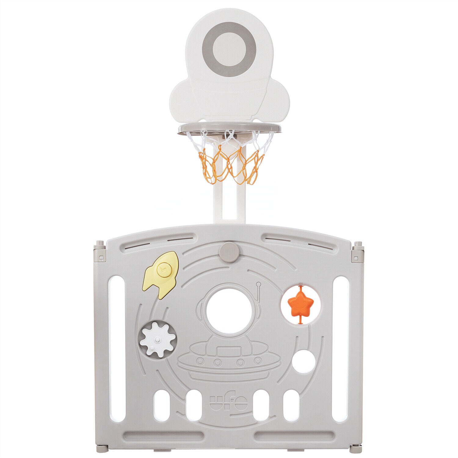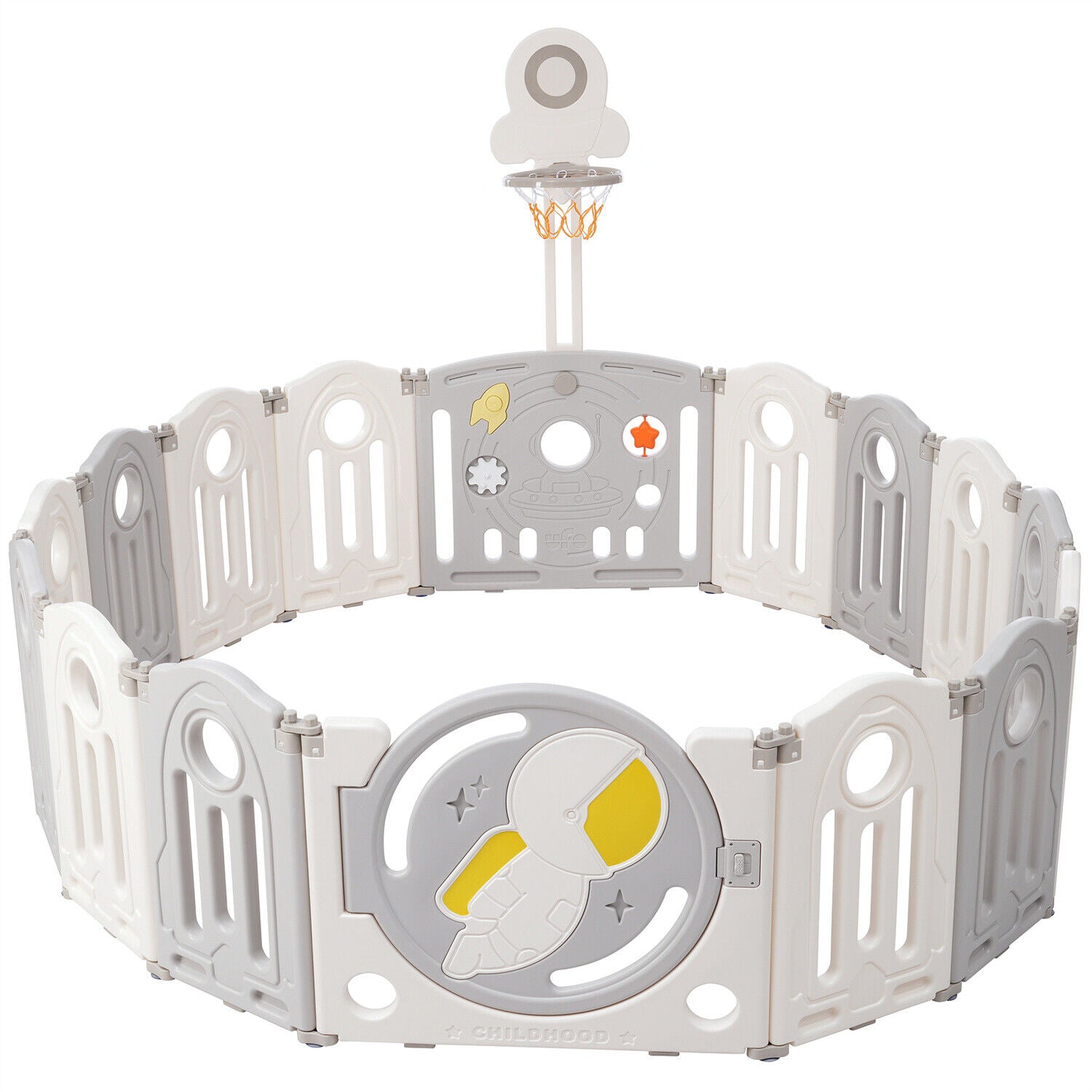 2in1 16 Panel Foldable Baby Playpen with Activity Panel and Basketball Hoop Grey