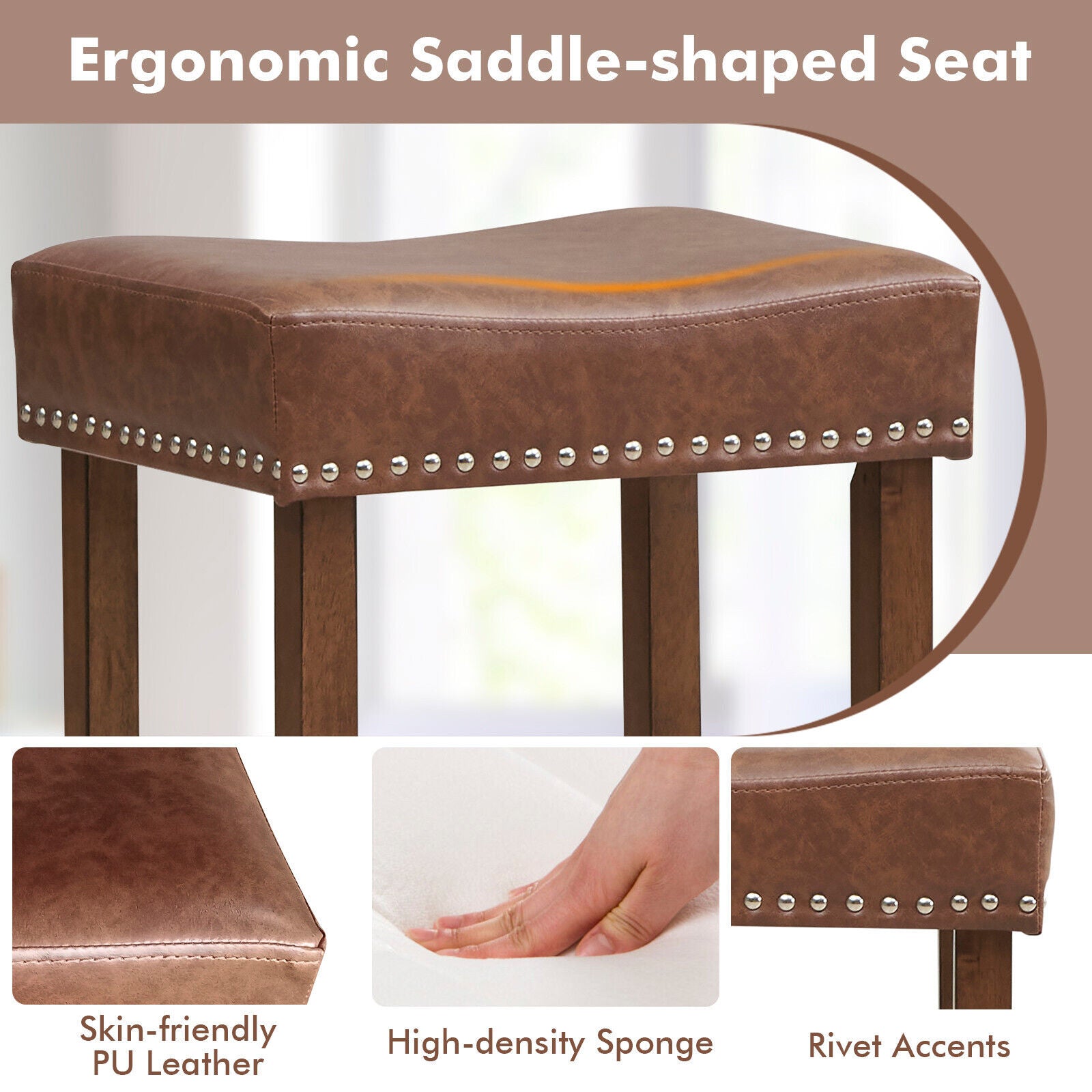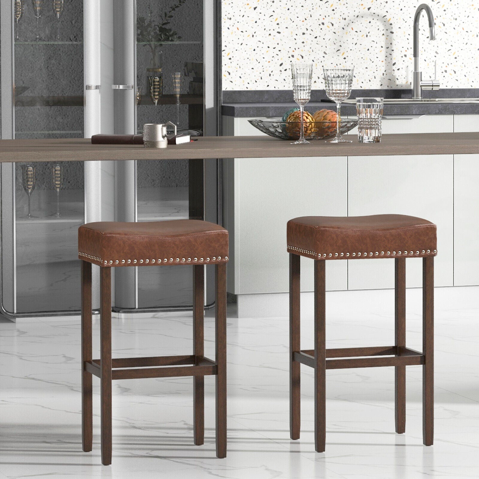 2Pcs Bar Stool PU Leather Counter Height Saddle Stools Dining Chairs Brown 74CM