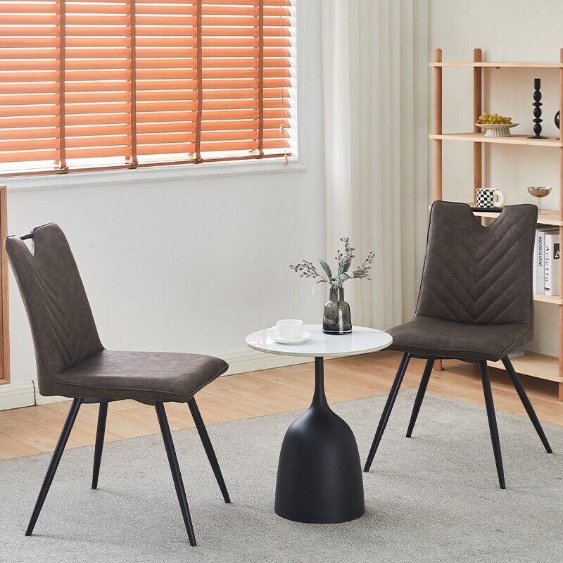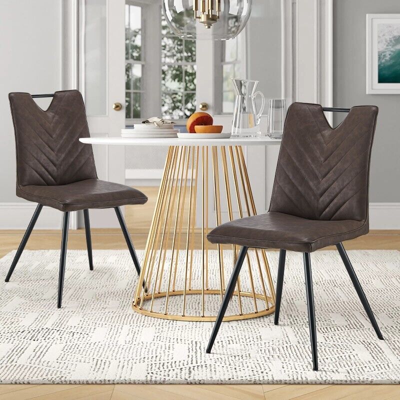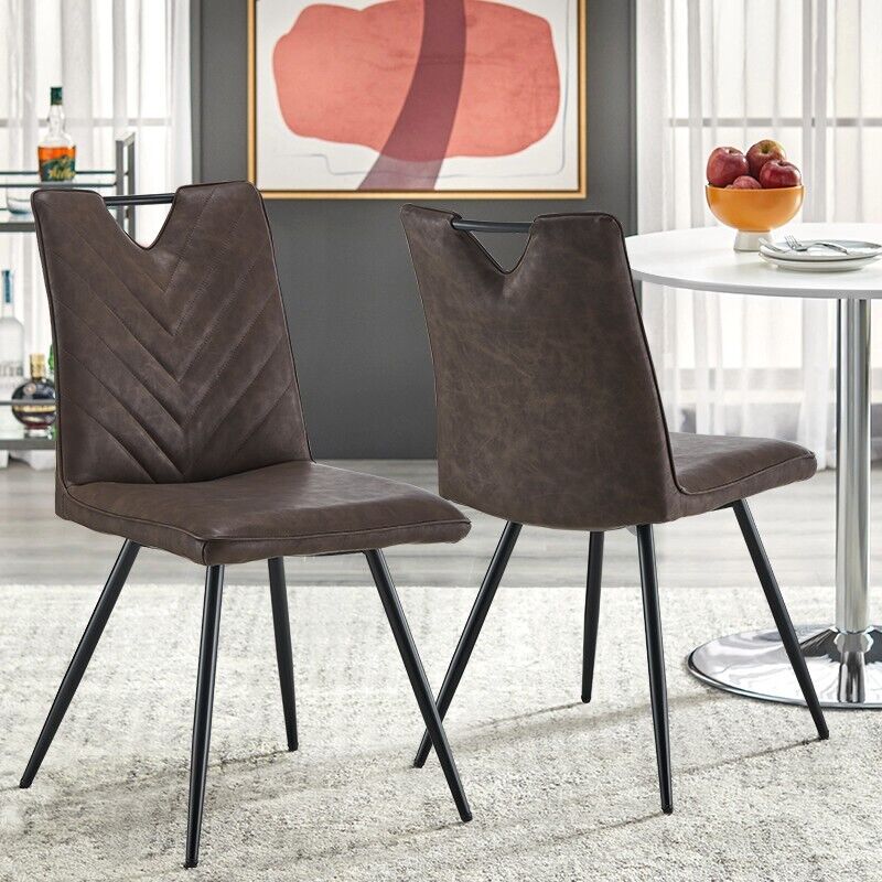 2Pcs Brown Dining Chairs Retro Faux Leather V Stripe Seat Metal Leg High Back