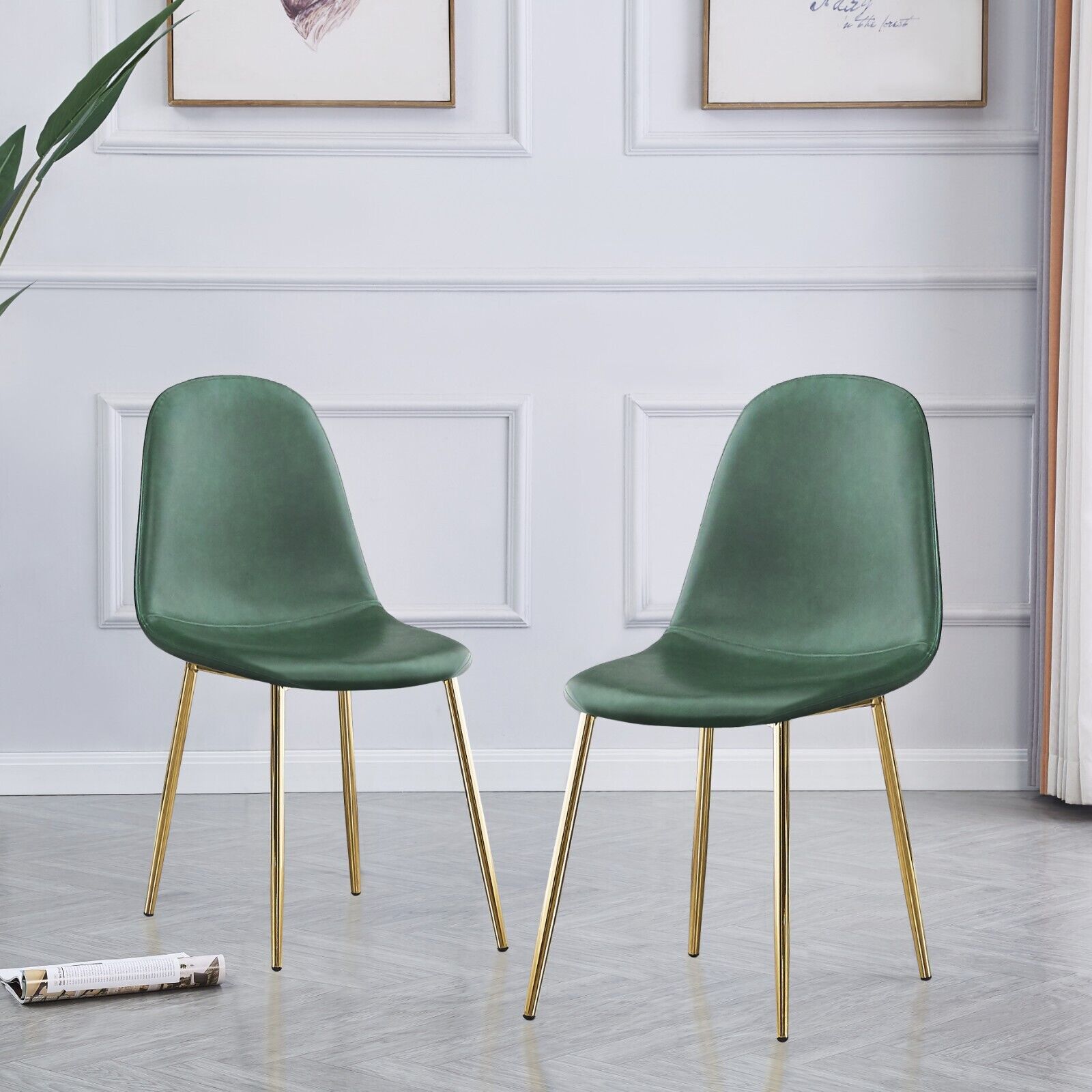 2pcs Green PU Leather Dining Chairs Golden Chromed Legs Dining Room Kitchen