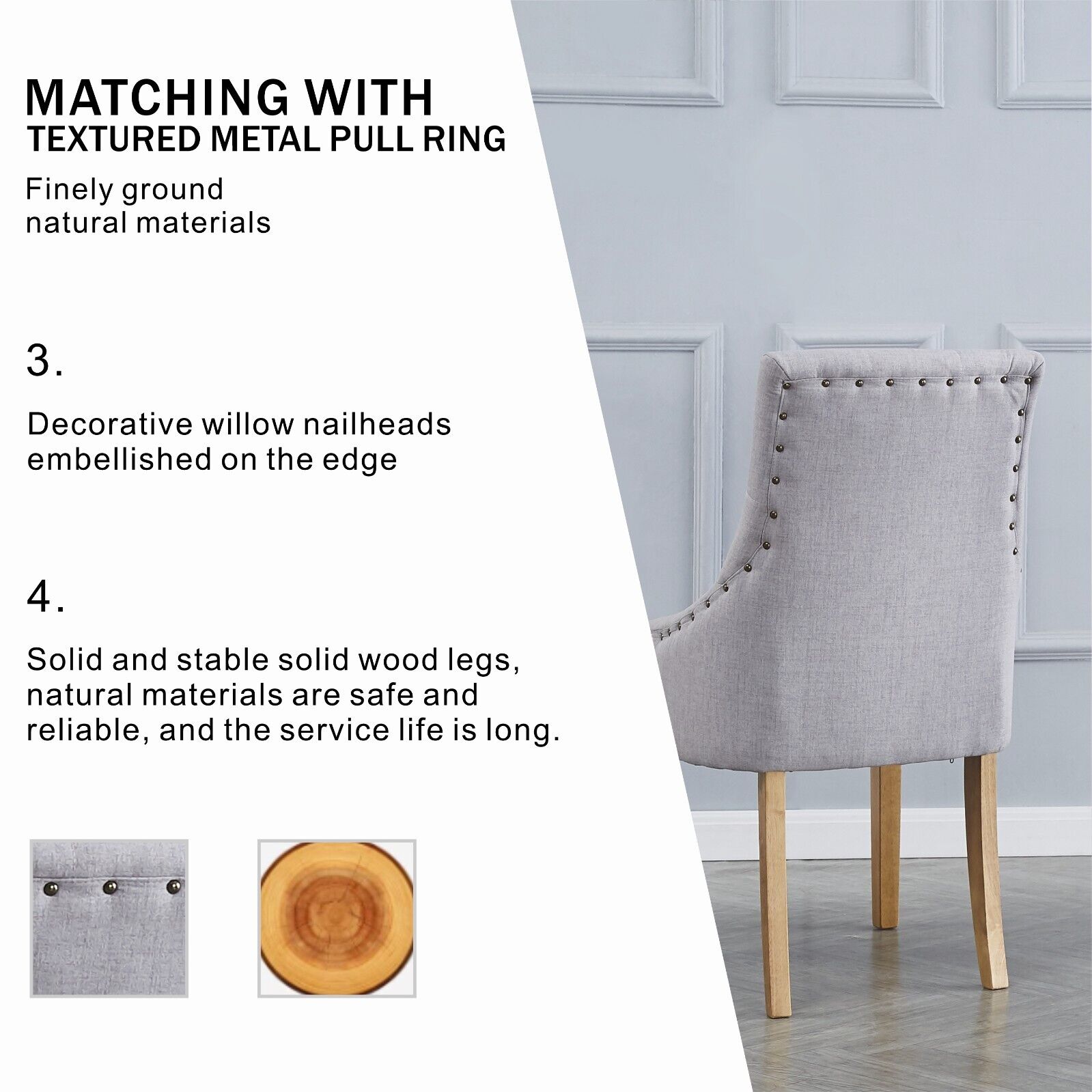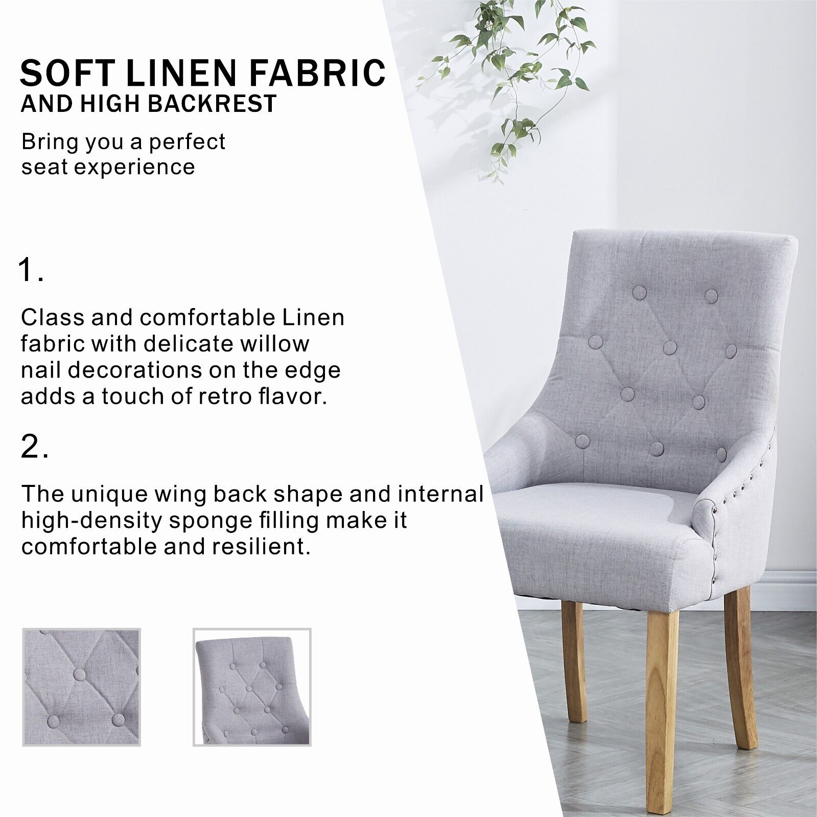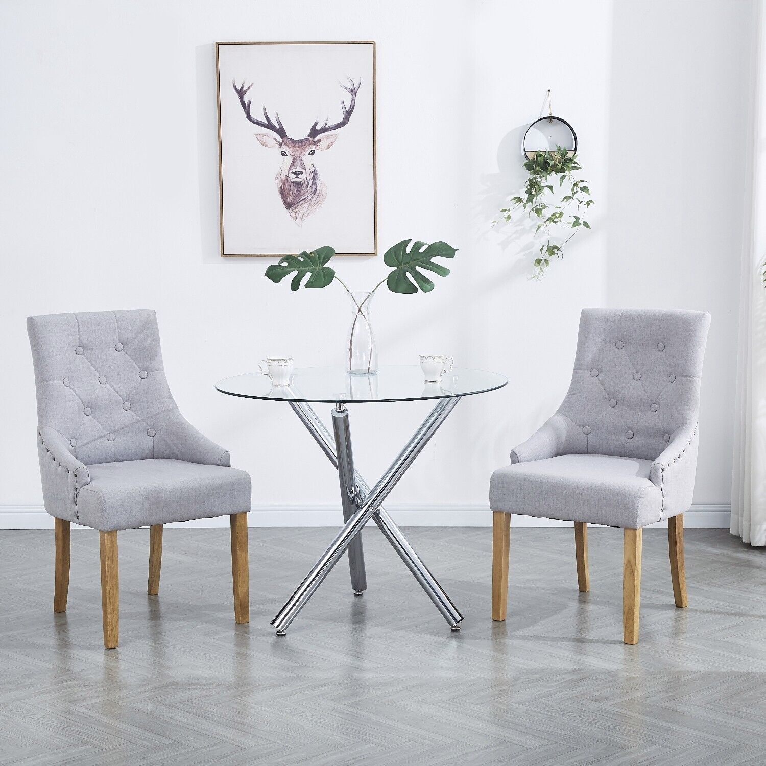 2pcs Grey Fabric Dining Chairs Button-Tufted Upholstered Armchairs with Rivets