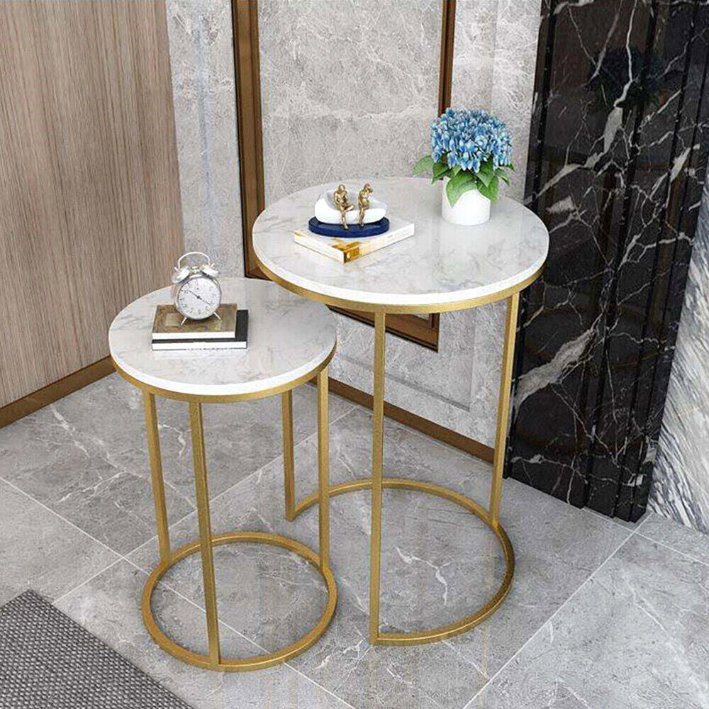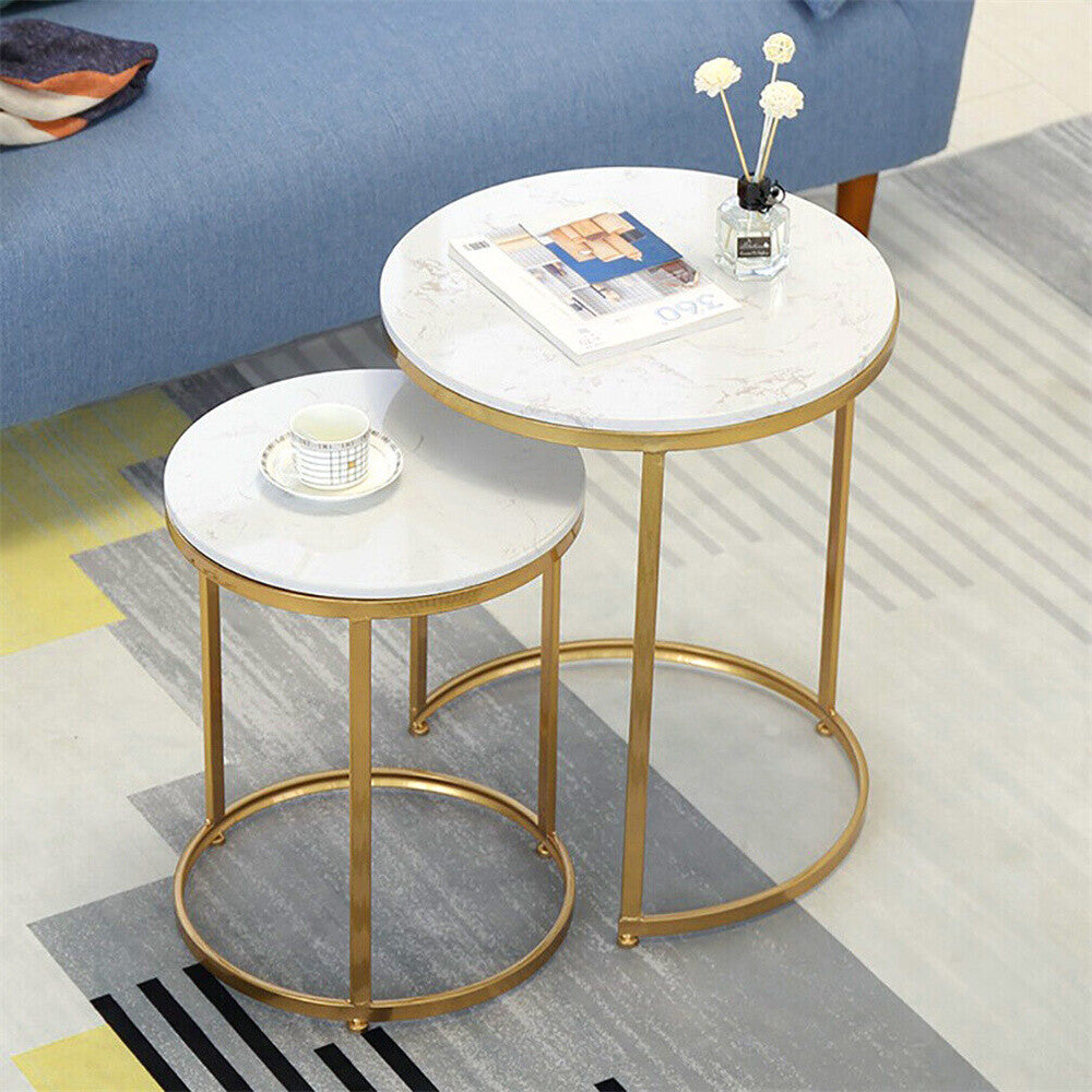2Pcs Marble Side Table Nesting Coffee Tables Corner Cabin Bedroom White & Gold