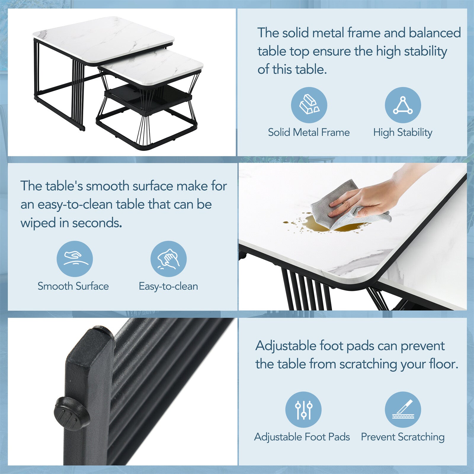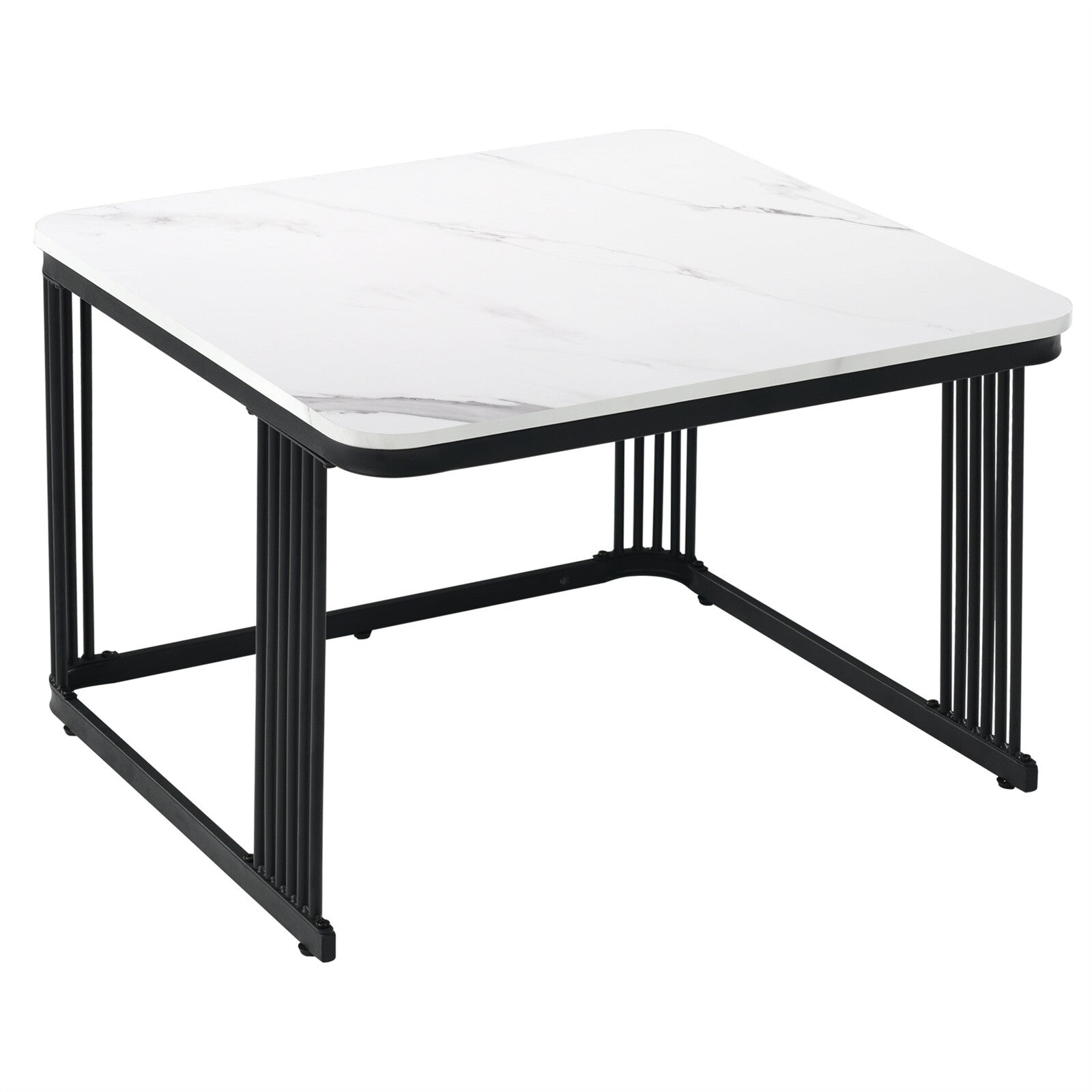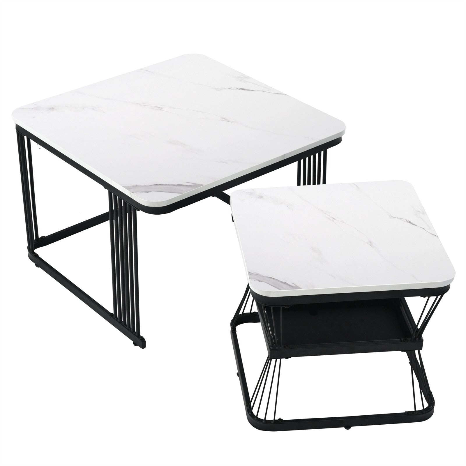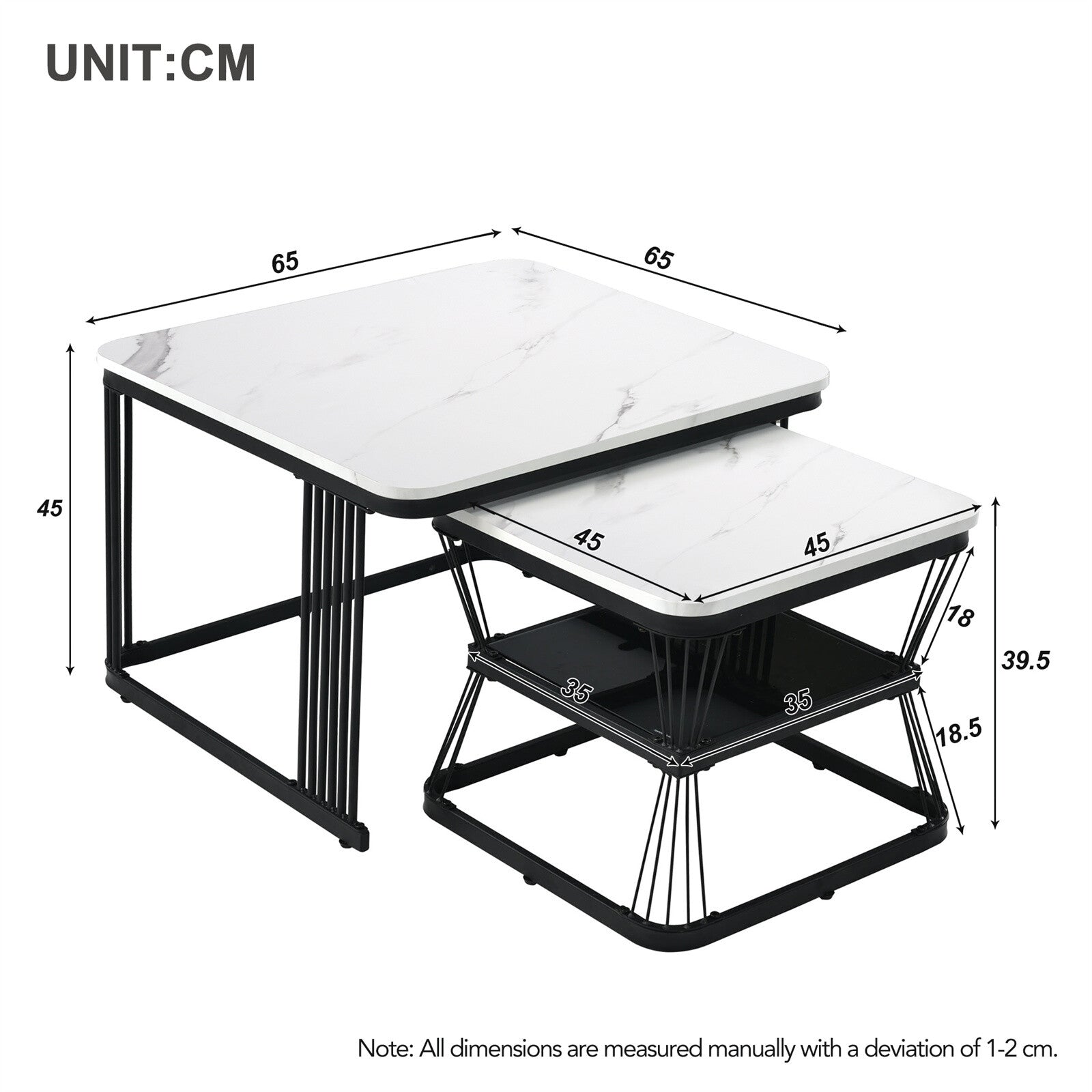 2Pcs Nesting Coffee Tables Set Square Stacking Side Tables Marble-Look White