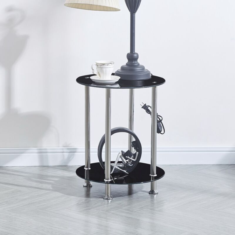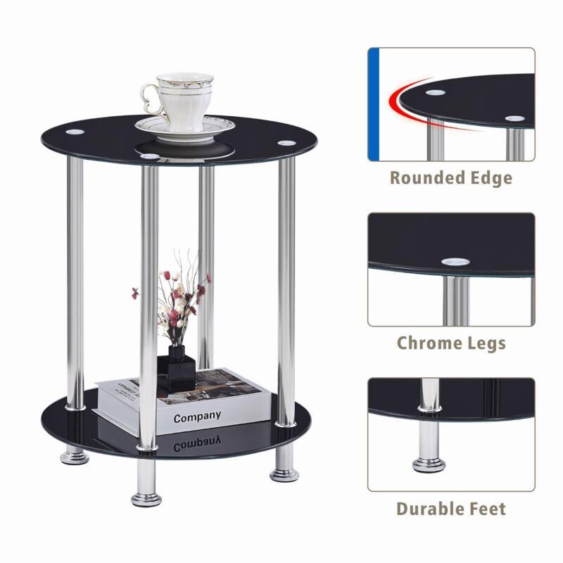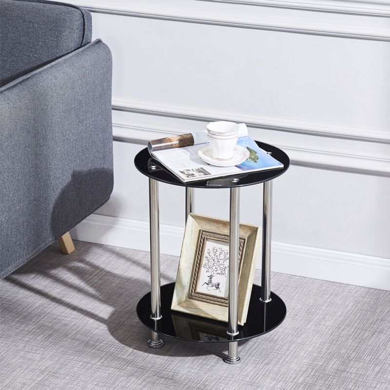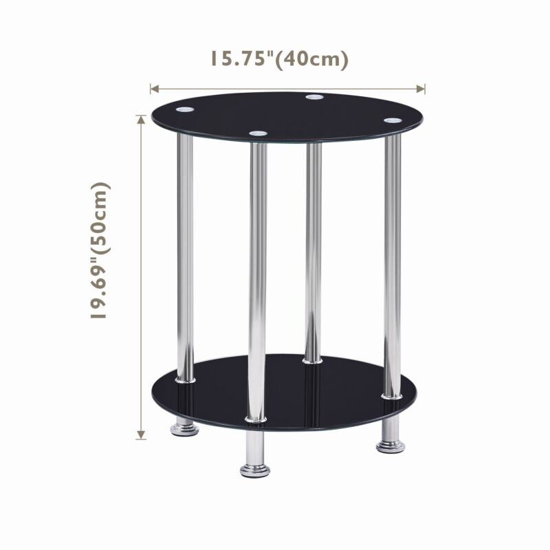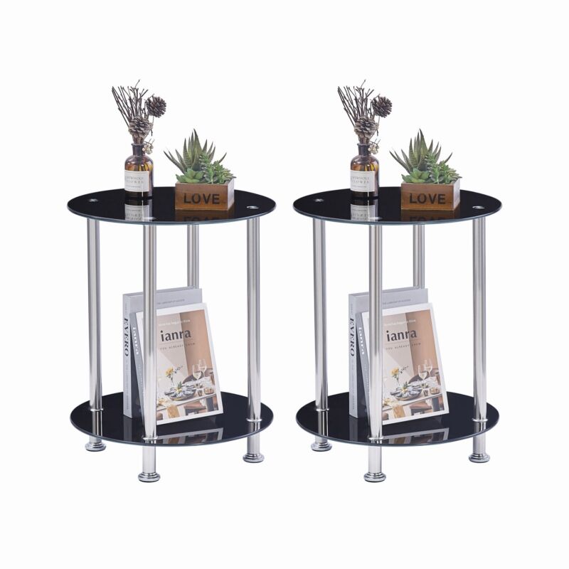 2pcs Round Black Tempered Glass Sofa Side End Table Bedside Table with Storage