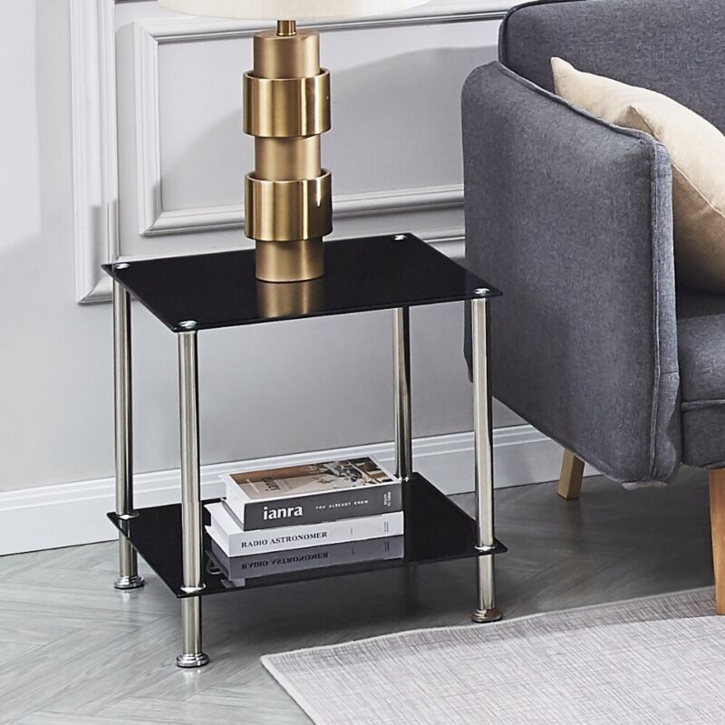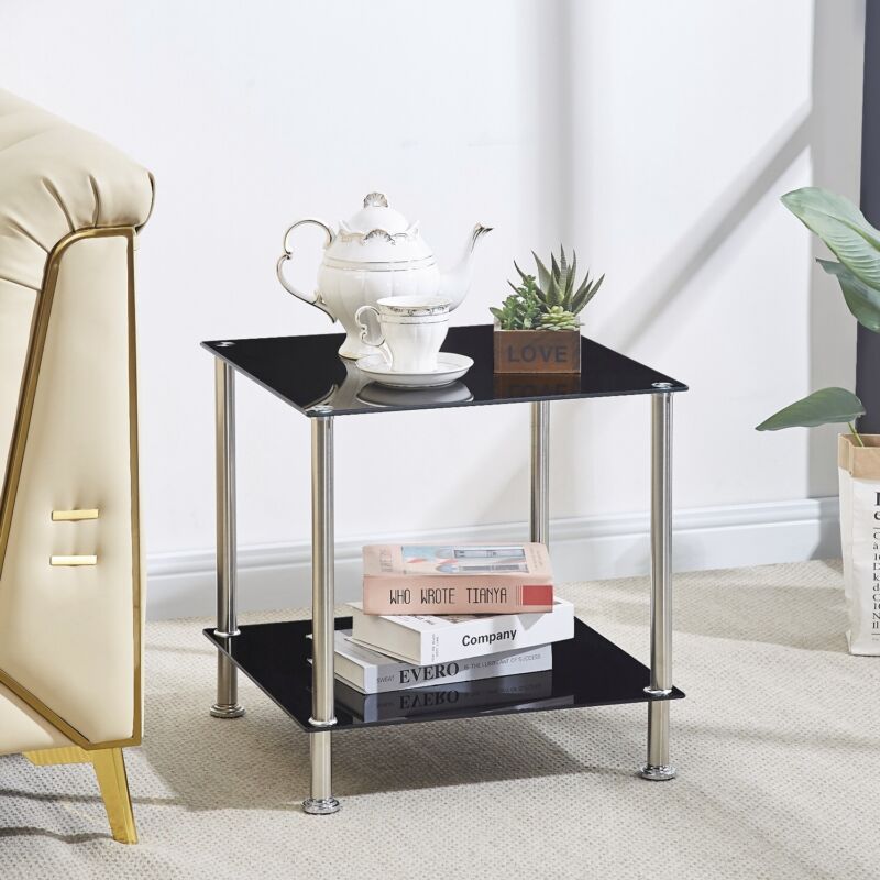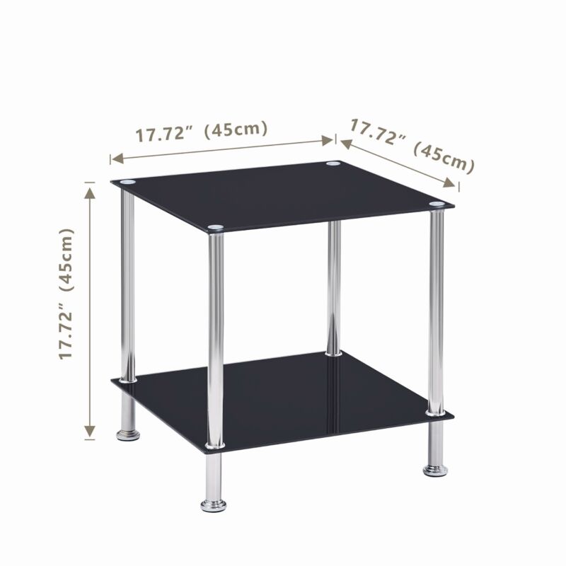 2pcs Square Black Tempered Glass Side End Table Bedside Table with Storage Shelf