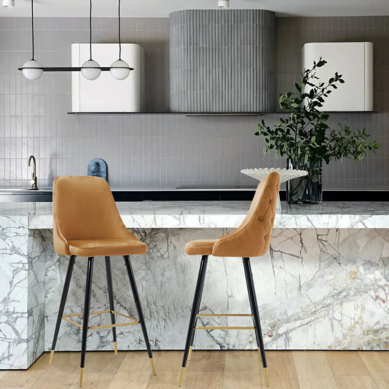 2Pcs Velvet High Bar Stools Breakfast Kitchen Counter Chairs Gold Metal Footrest