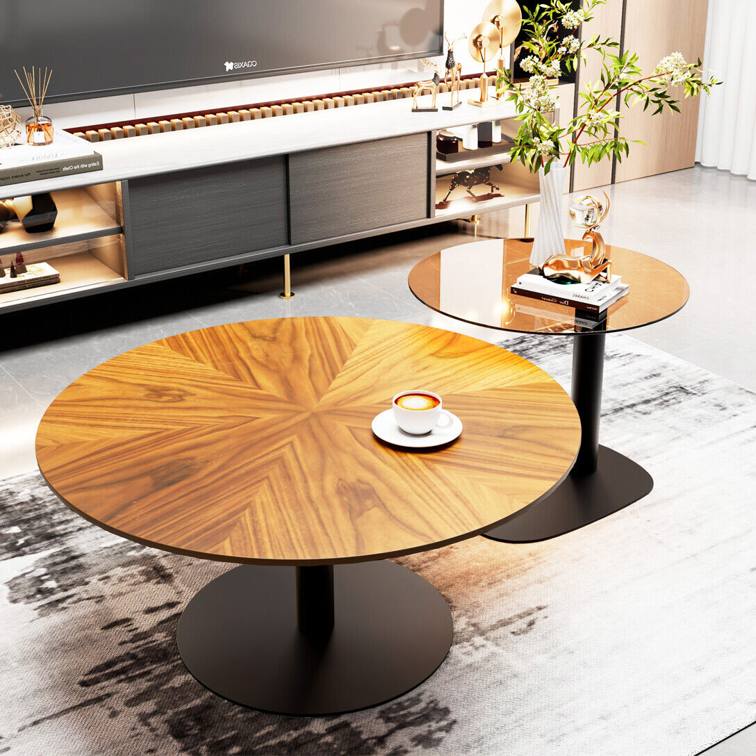 2X Chic Nesting Coffee Table Set Unique Vintage Wood Grains Glass Stacking Table